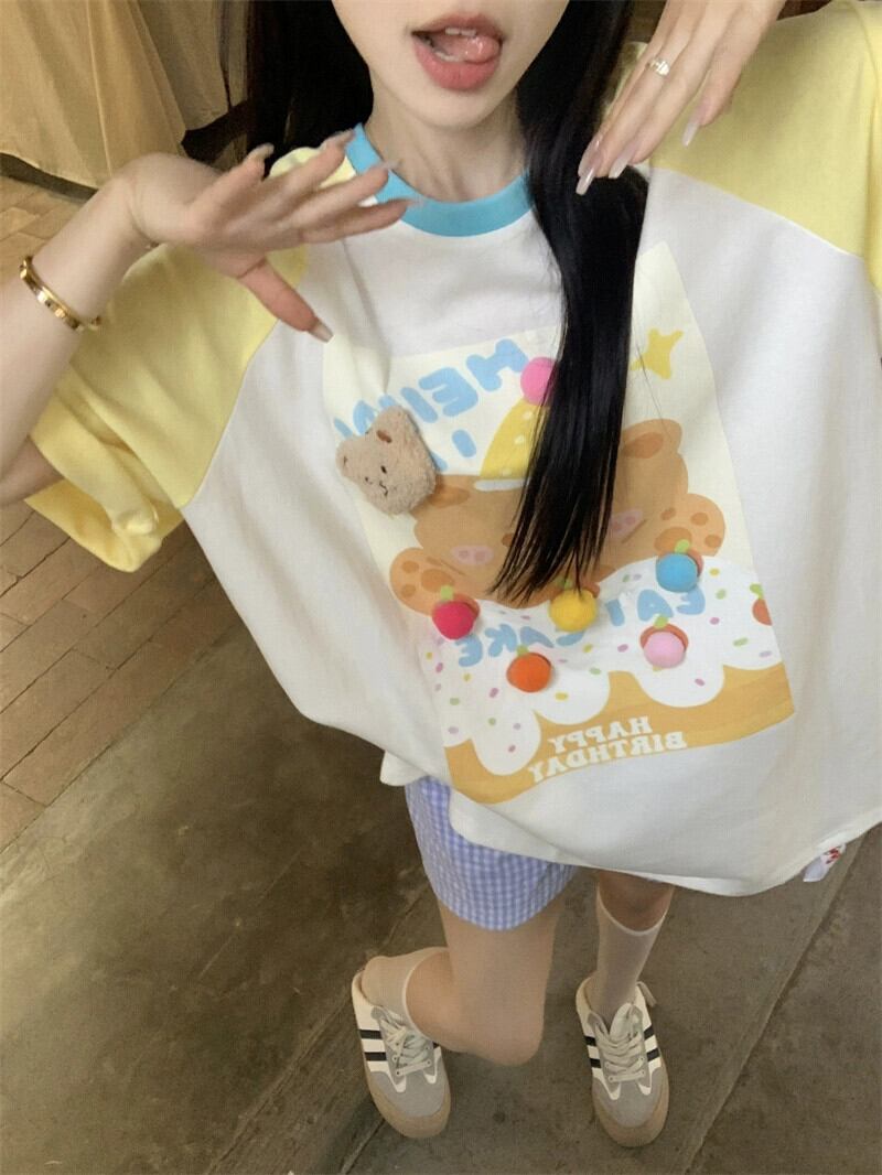 クマプリント Tシャツ女性デザインセンス甘い年齢減少 2023 夏の新しいルーズミッドレングス半袖トップイン 大人ガーリー スウィート キュート カジュアル サマー 夏物 missk25211477234
