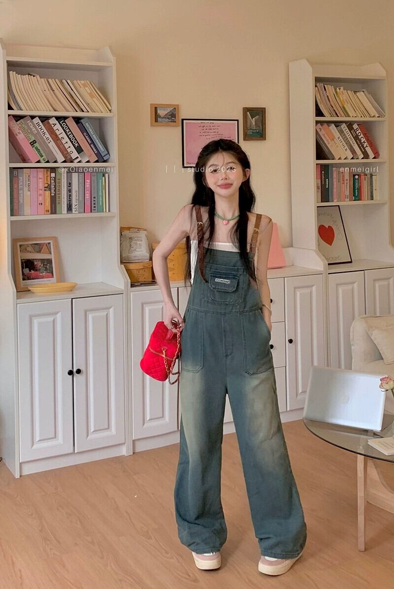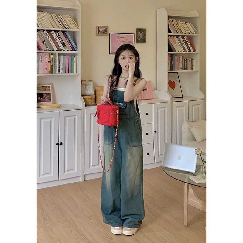 レトロウォッシュデニムオーバーオールレディース2023夏新文字ハイウエストスリムワイドレッグストレートパンツイン ハイウェスト サマー 夏物 ワイドパンツ missk34587117042