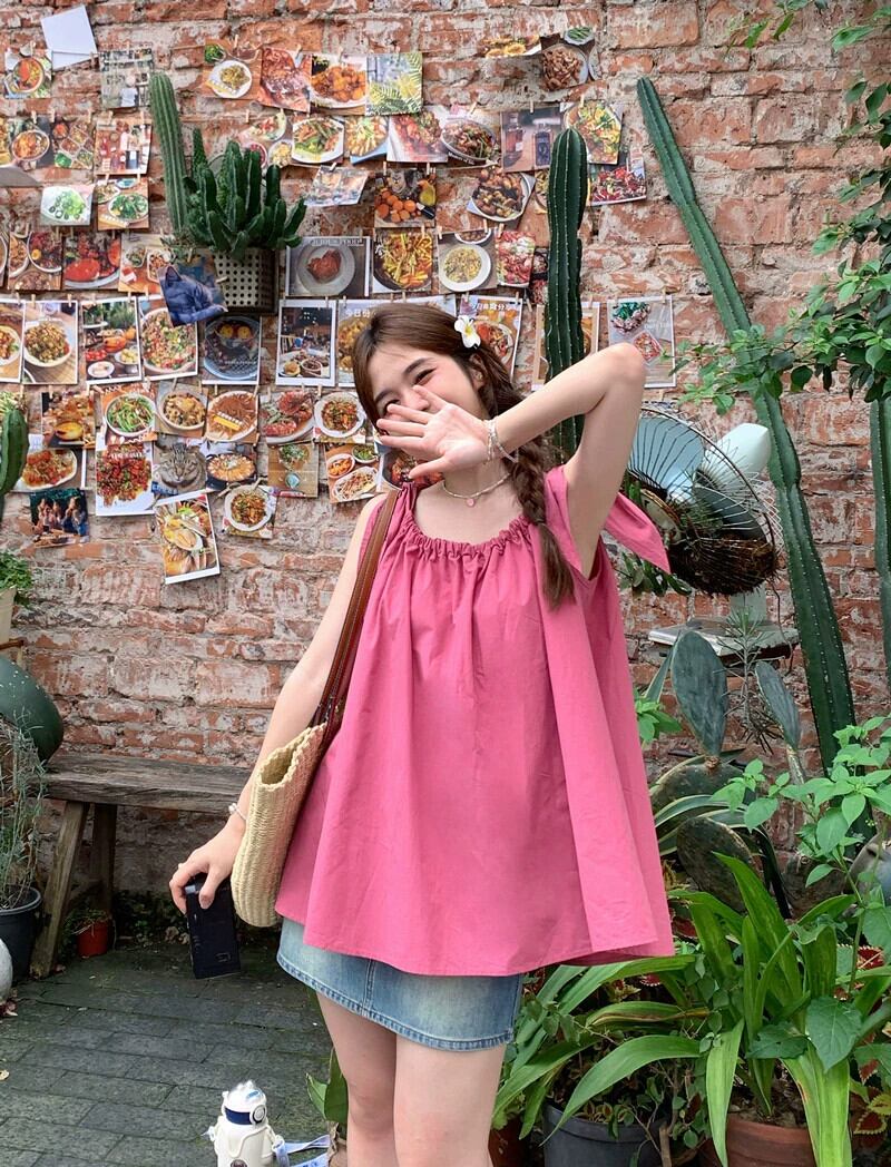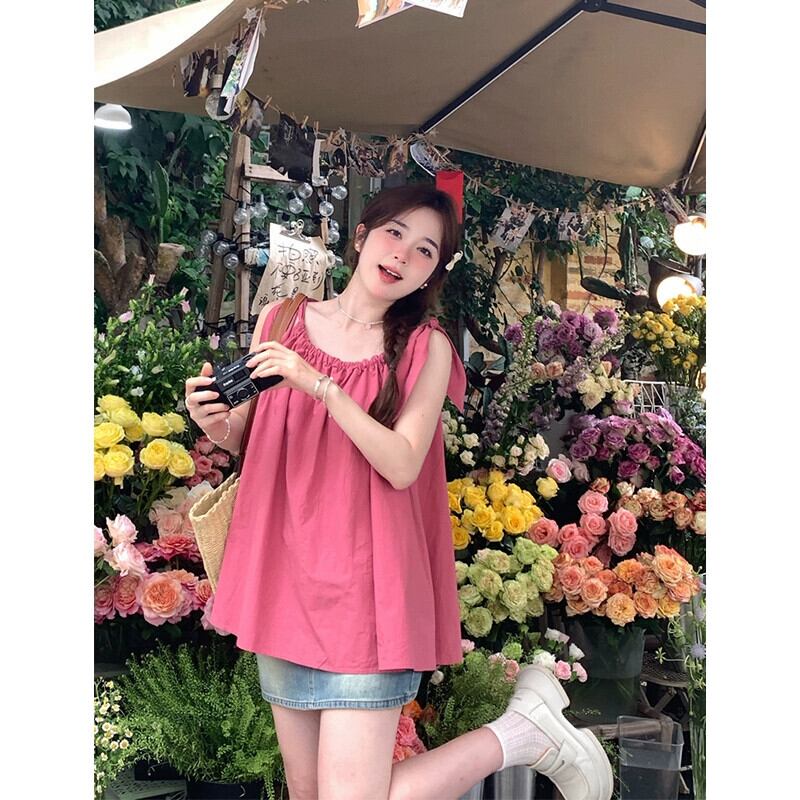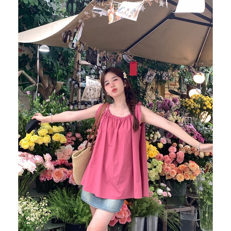 甘い巾着スリングトップ女性の夏の新しい緩いファッションネクタイデザインセンスプリーツアウターウェアピンクベスト 大人ガーリー スウィート キュート カジュアル サマー 夏物 missk23390088675
