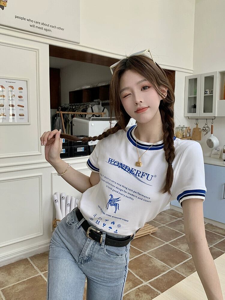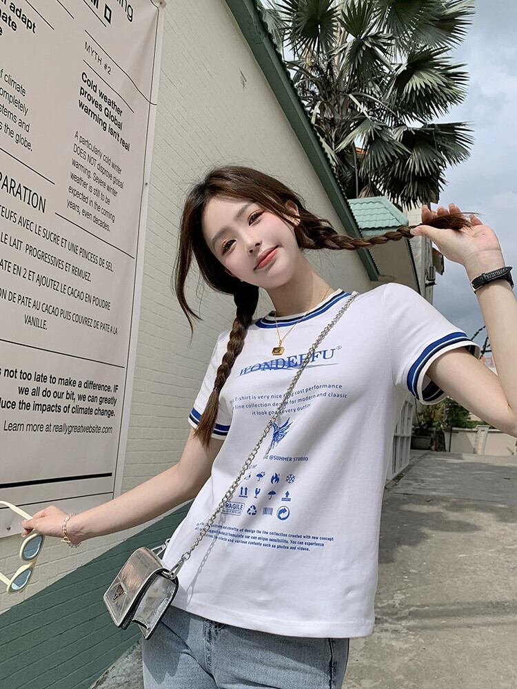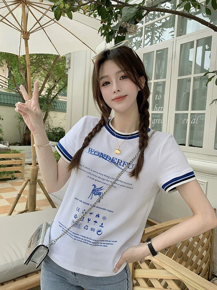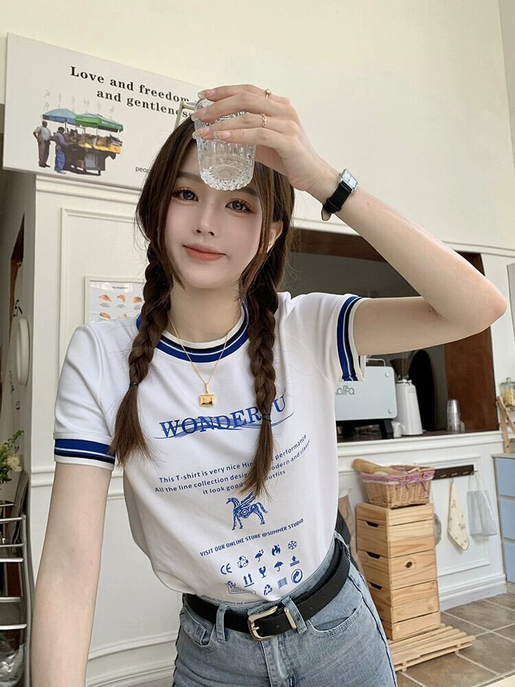 スタイルコントラストカラー文字フロントショルダー半袖 Tシャツレディース 2023 夏の新しいデザインセンススリムフィット薄手のプリントトップ サマー 夏物 missk13261004285
