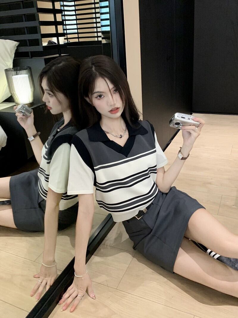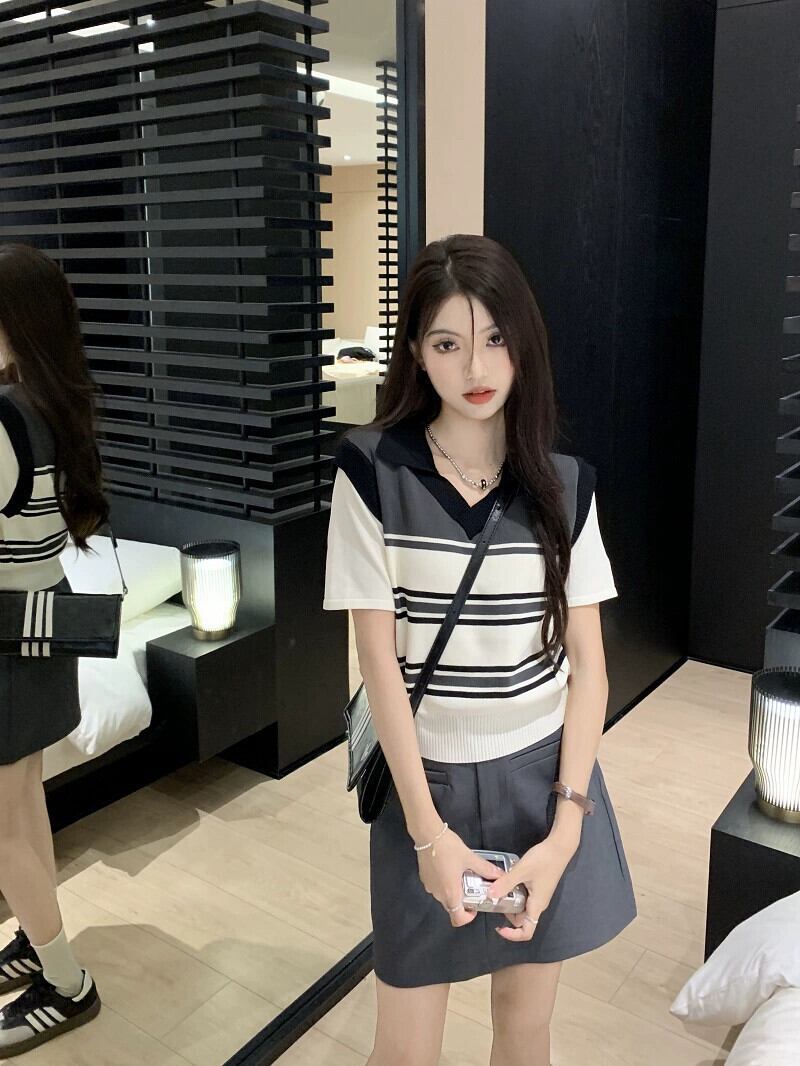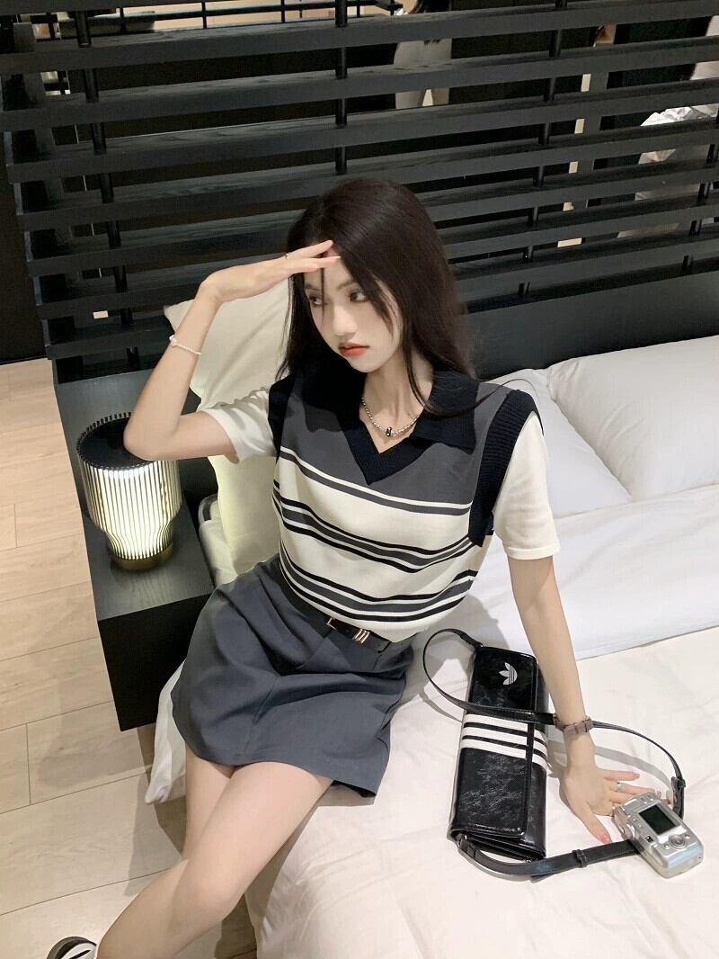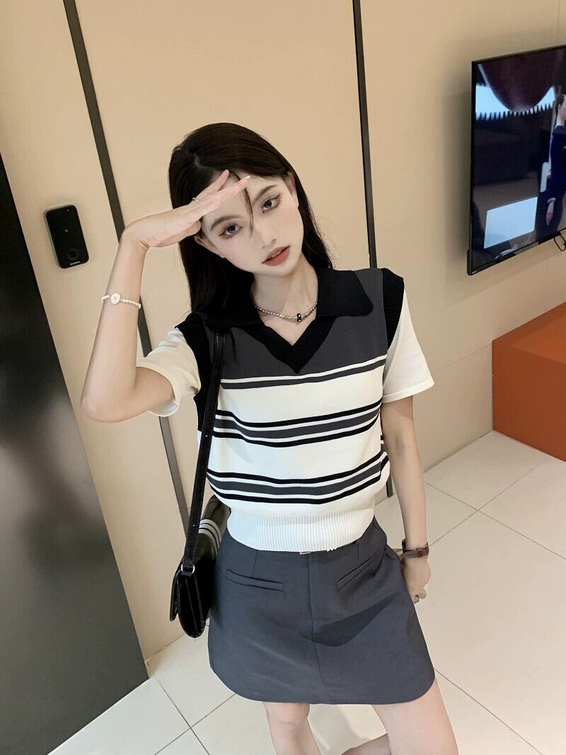 フェイクツーピースニットセーター女性の夏の新しいレトロストライプポロカラーニッチデザインセンス半袖トップス サマー 夏物 missk89769042652
