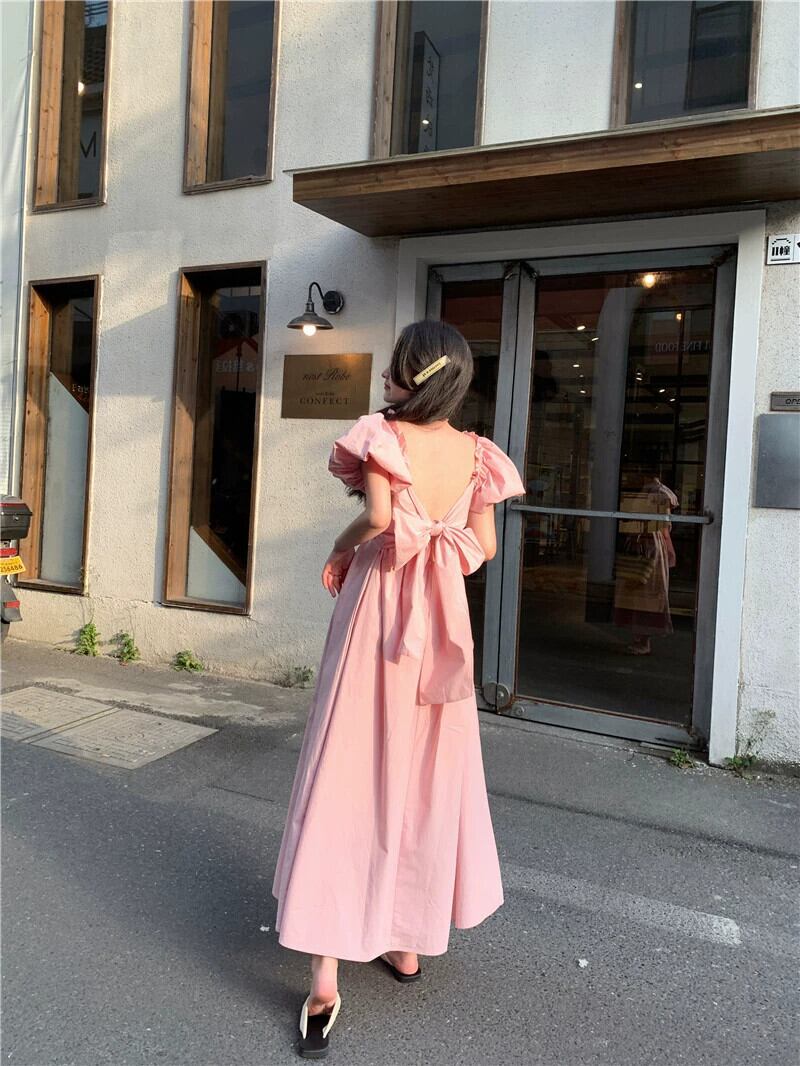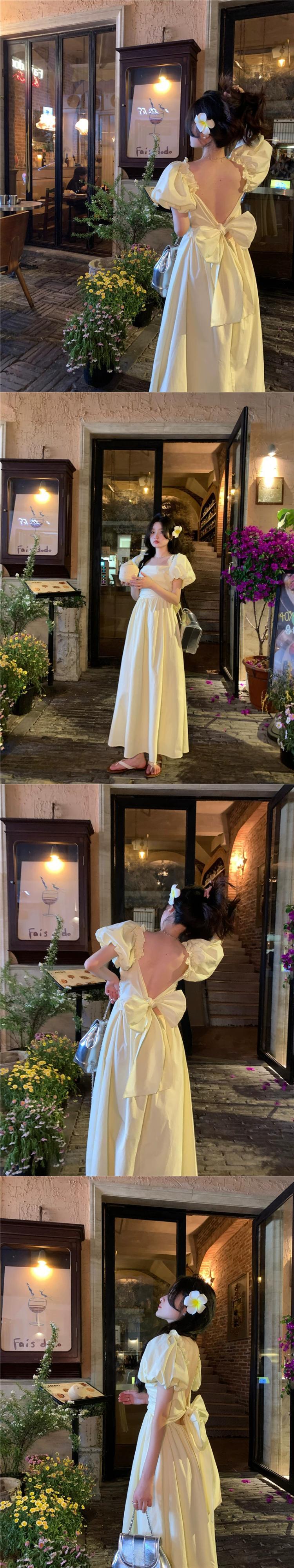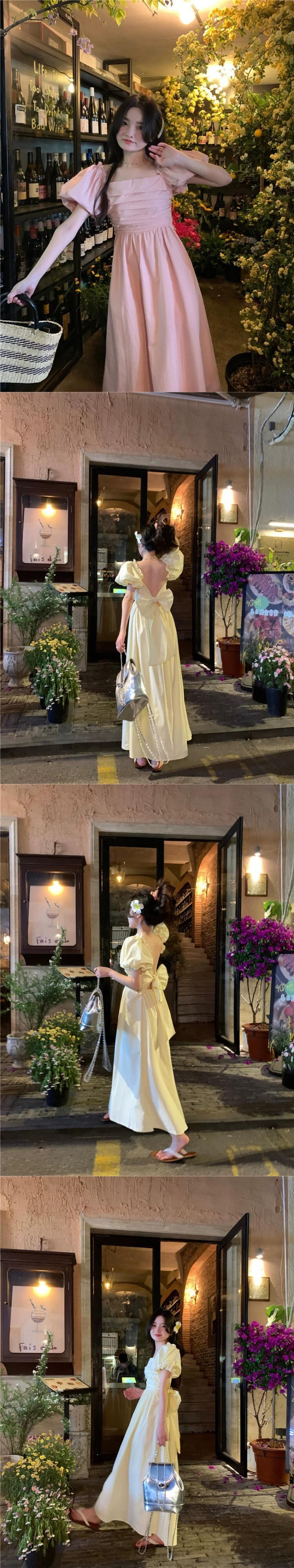 蝶結びバックレスパフスリーブドレス女性の夏の 2023 新しいフレンチデザインセンスウエスト痩身ロングスカート サマー 夏物 missk20430474466