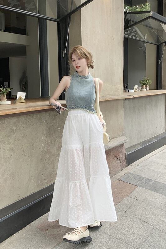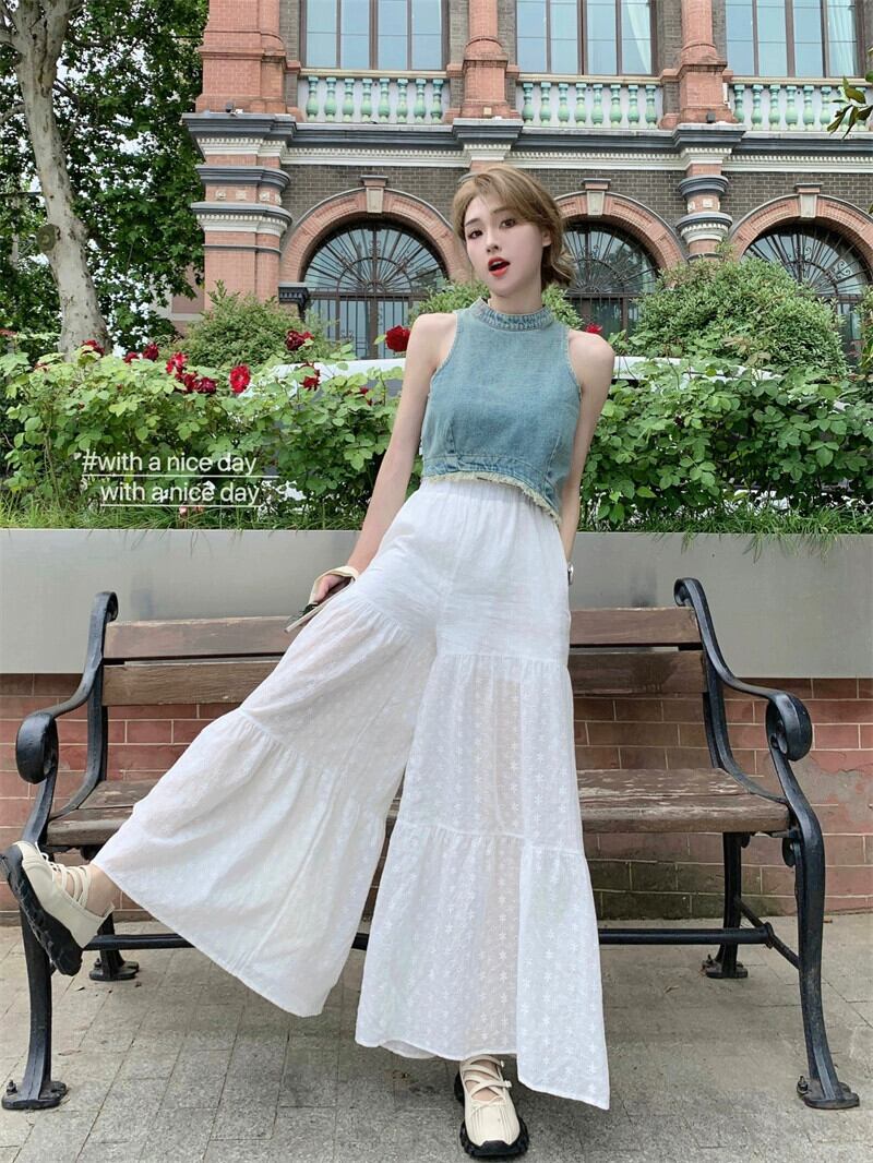 色:デニムベスト,ホワイトワイドレッグパンツ
