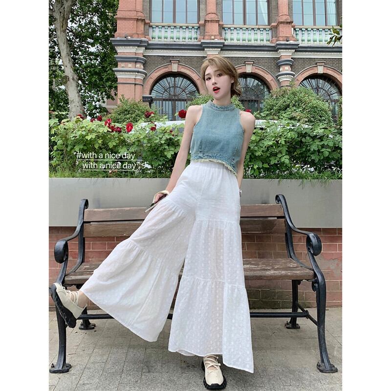 センスイレギュラーローエッジデニムベストハイウエストワイドレッグ袴女性の夏の 2023 新しいファッションツーピースセット ハイウェスト サマー 夏物 ワイドパンツ missk35623278921