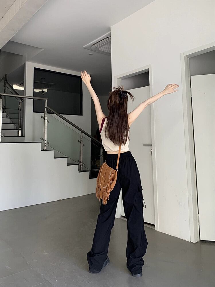 夏 2023 アメリカンレトロウエスト弾性ウエスト多用途ワークウェアブラックドレープモップパンツ女性の エラスティック 伸縮 サマー 夏物 missk76697056155