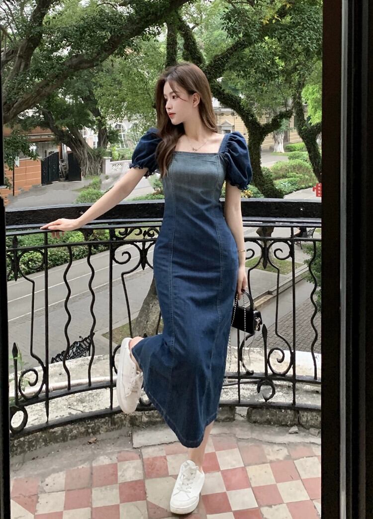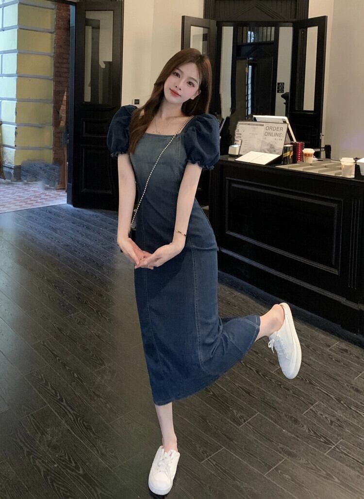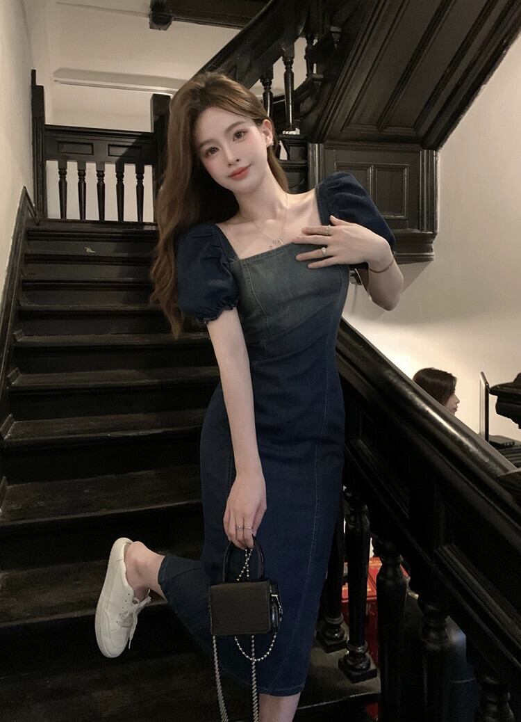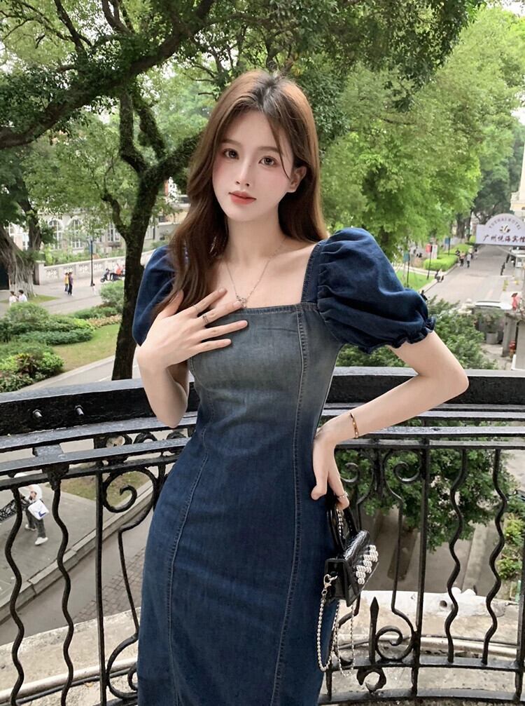グラデーションスクエアカラーデニムドレス女性の夏の 2023 新しいウエスト痩身ミッドレングスパフスリーブ A ラインスカート サマー 夏物 Aライン スクウェア missk79060374105