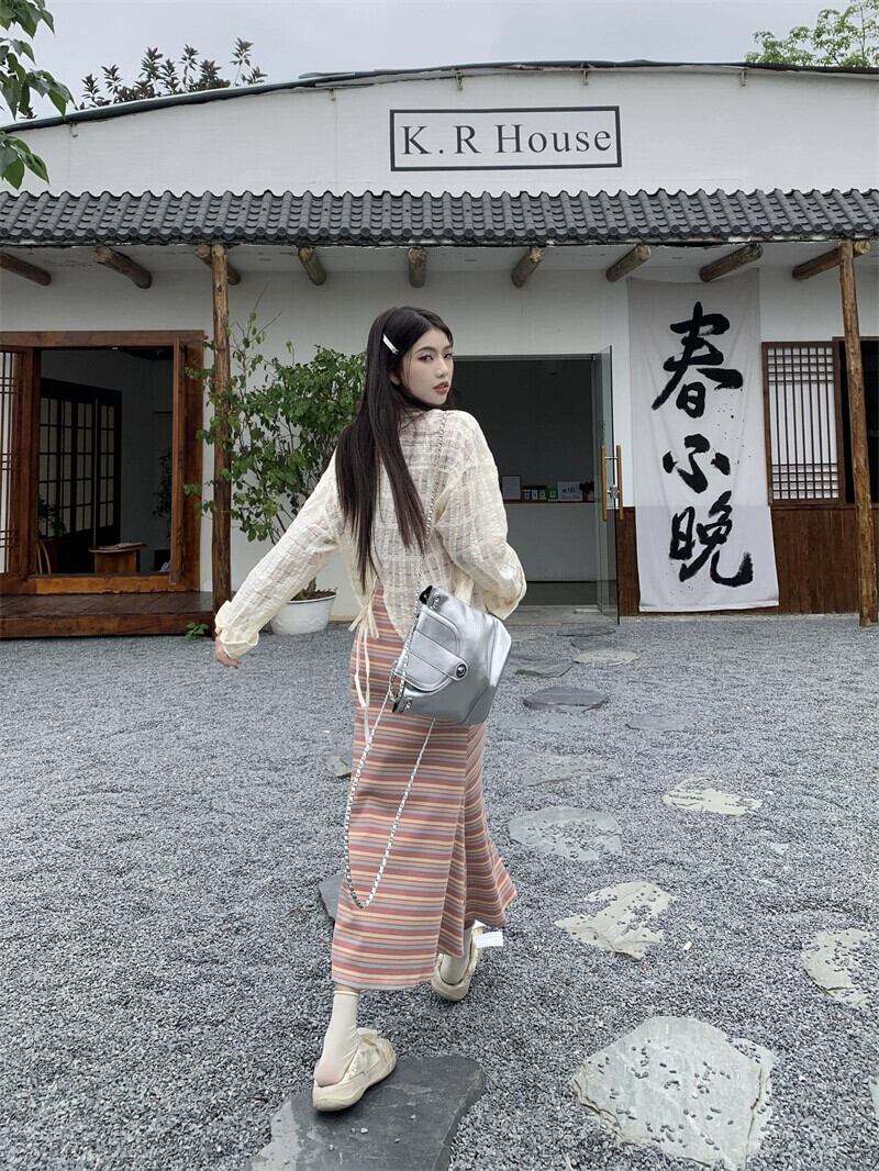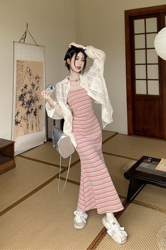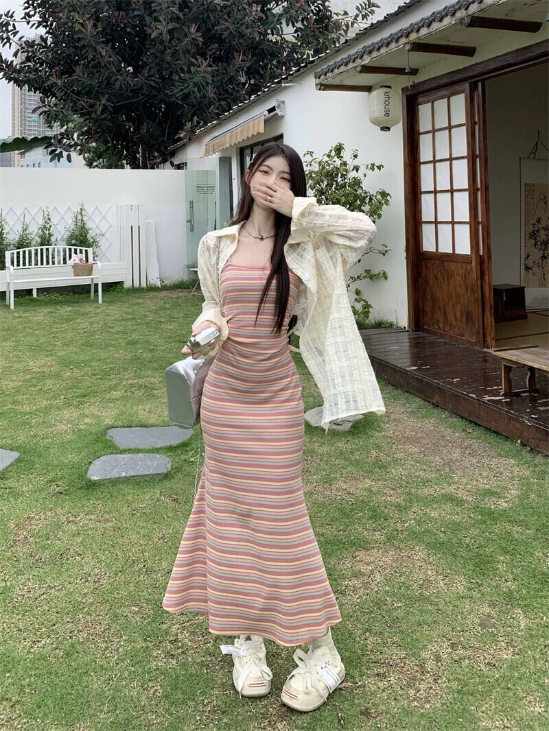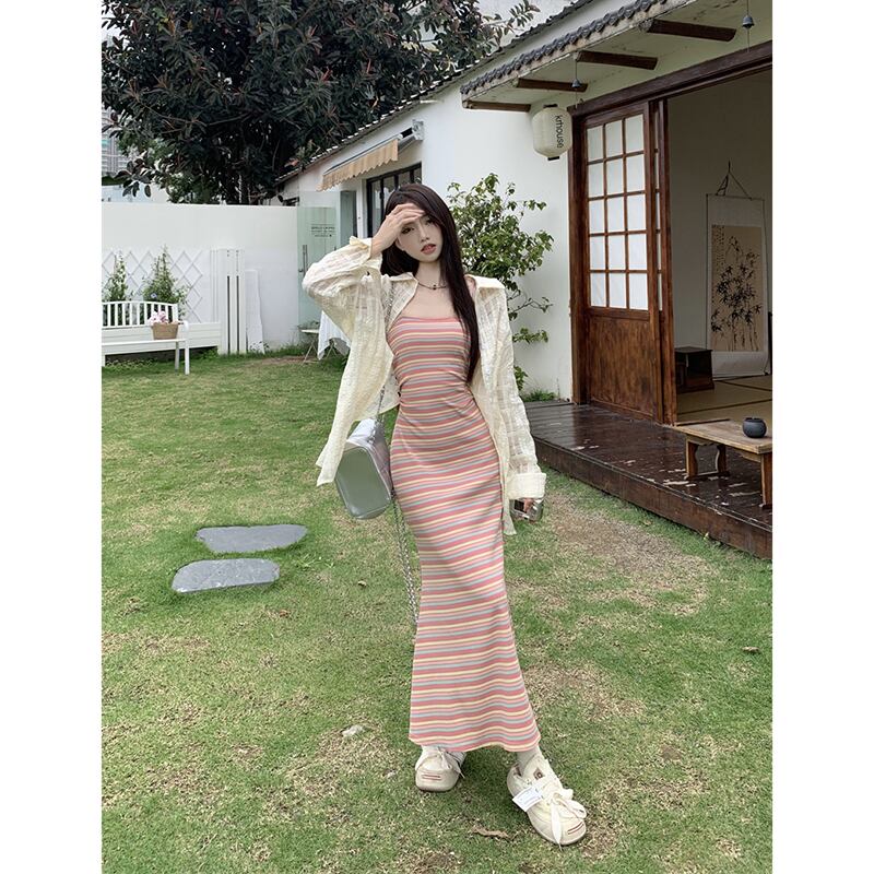 フレンチレインボーストライプサスペンダードレス女性の夏の新しいファッションスリムスリムデザインシックなロングスカート サマー 夏物 missk1503570704