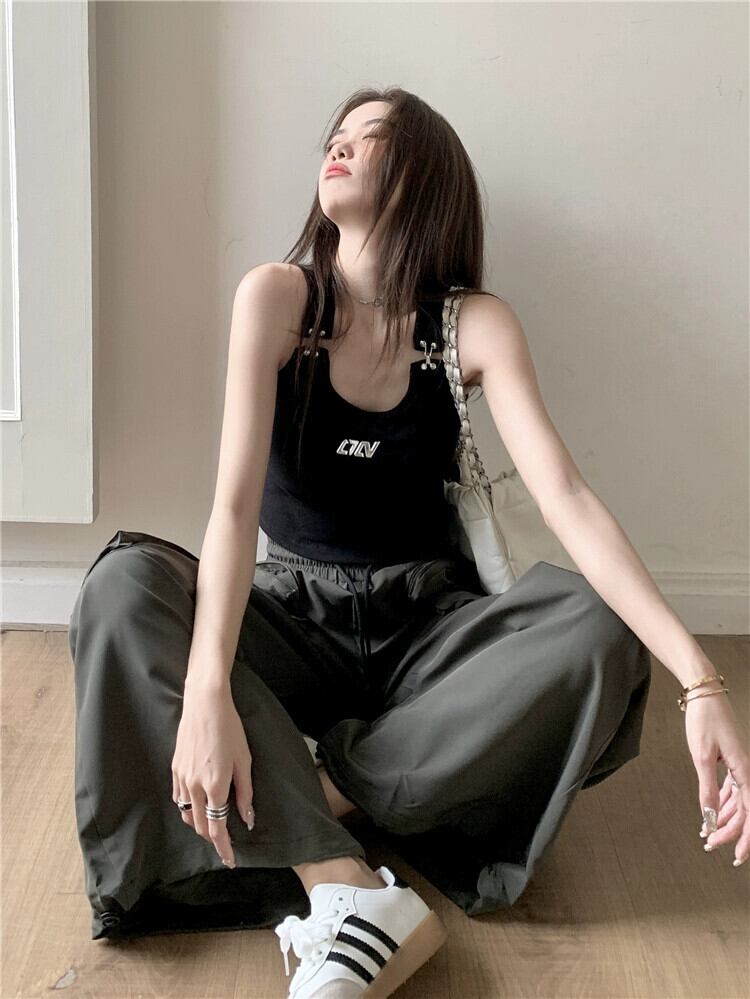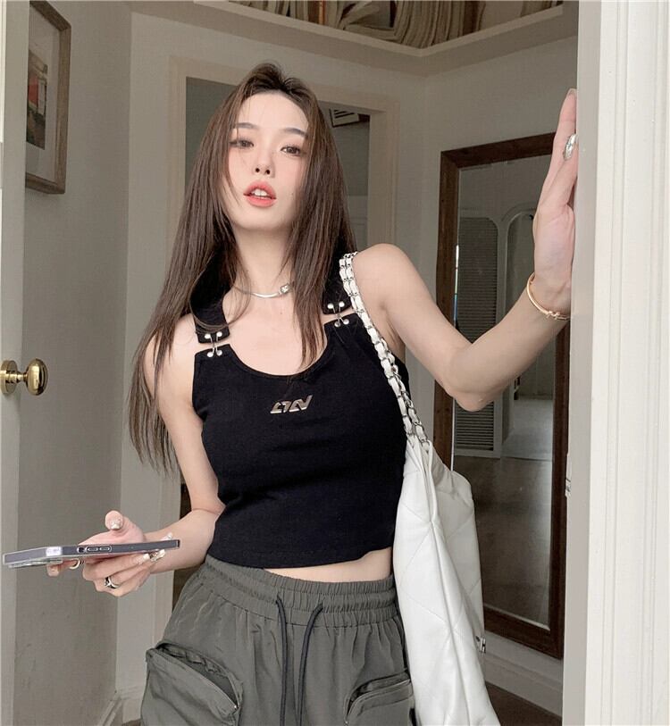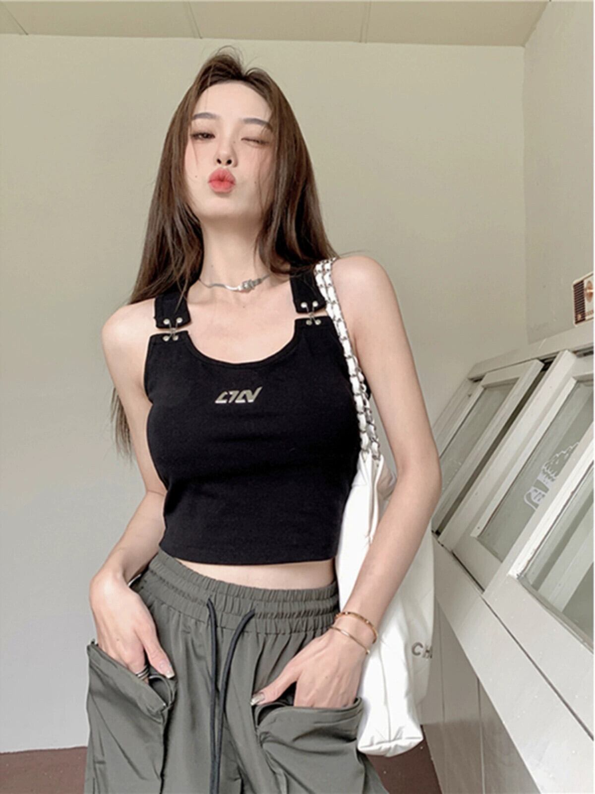 スイートクールレターベスト婦人服夏2023新しいショートスタイルデザインセンススリム黒小さなサスペンダートップ ブラック 大人ガーリー スウィート キュート カジュアル サマー 夏物 missk24745944661