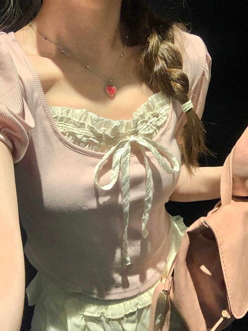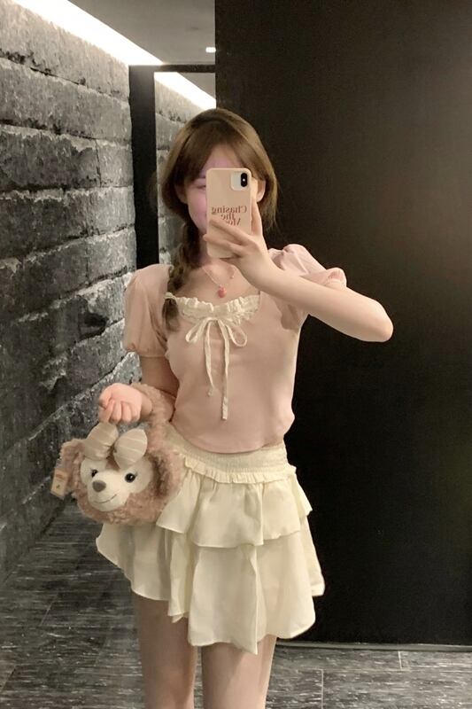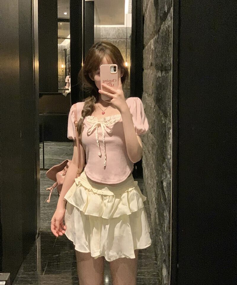 バレエスタイルデザインスクエアカラーネクタイパフスリーブトップケーキスカート女性の夏の 2023 新しいファッションスーツ サマー 夏物 スクウェア missk87359041796