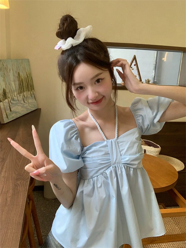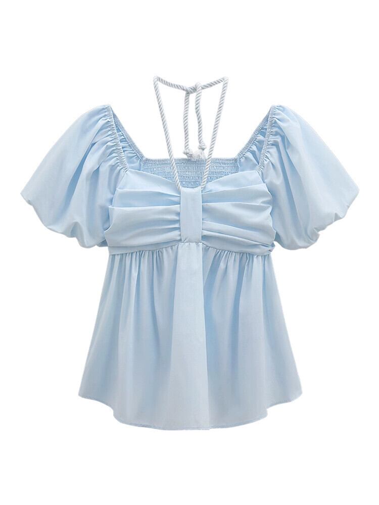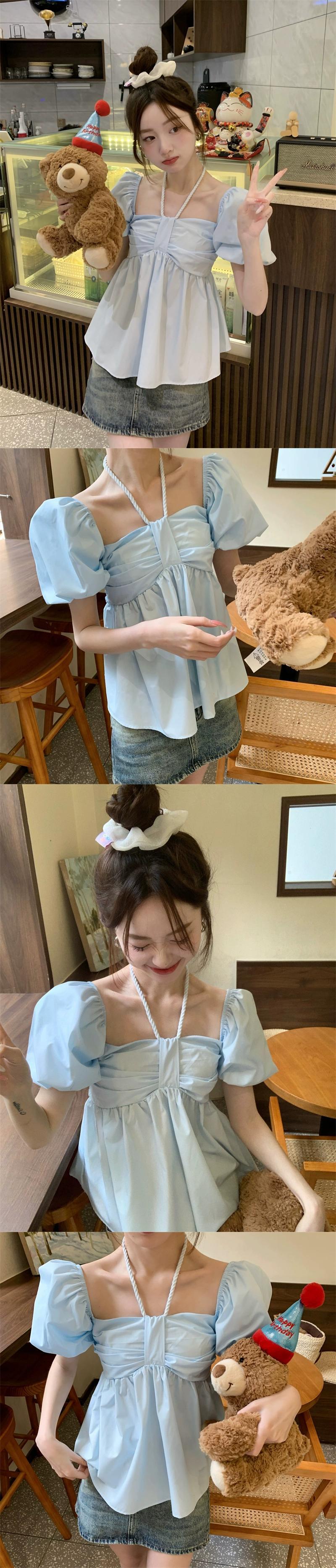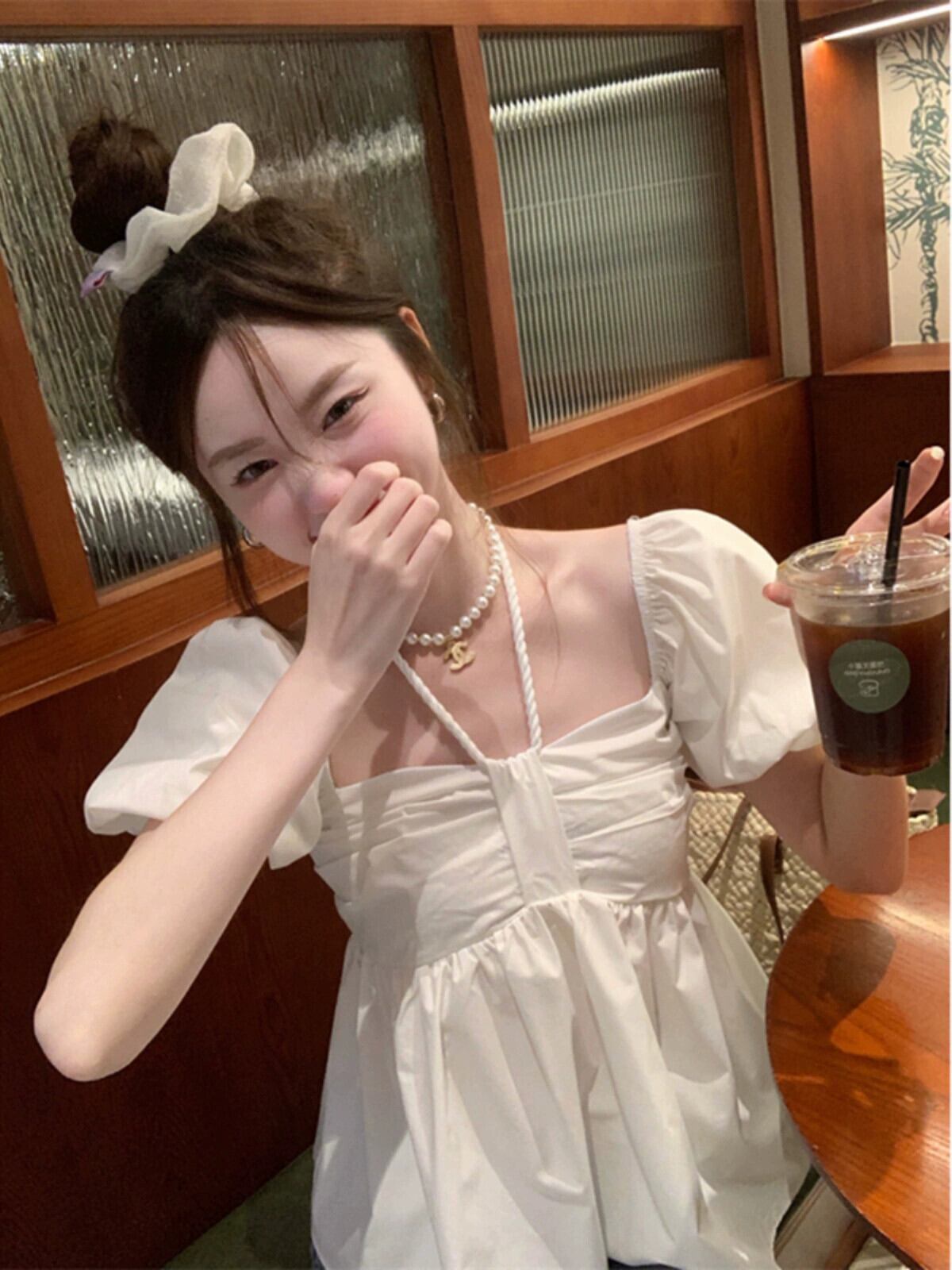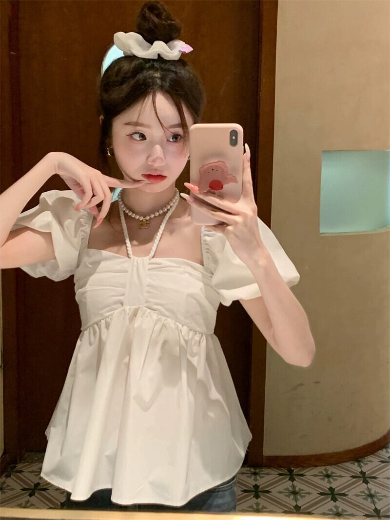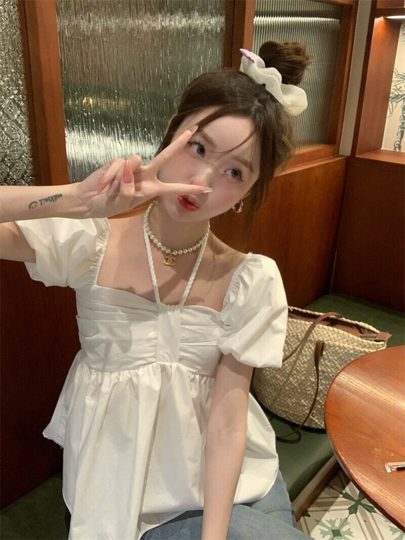 気質スクエアカラー吊りネックパフスリーブシャツレディース2023年夏新デザインセンス薄くて年齢を軽減する半袖ドールシャツ サマー 夏物 スクウェア missk45039462446