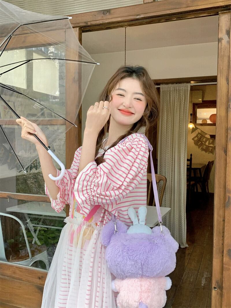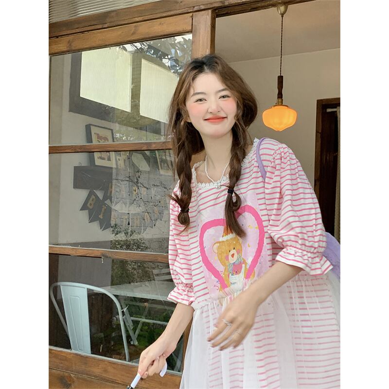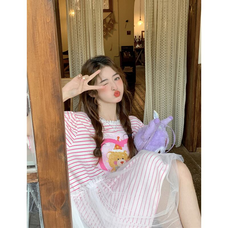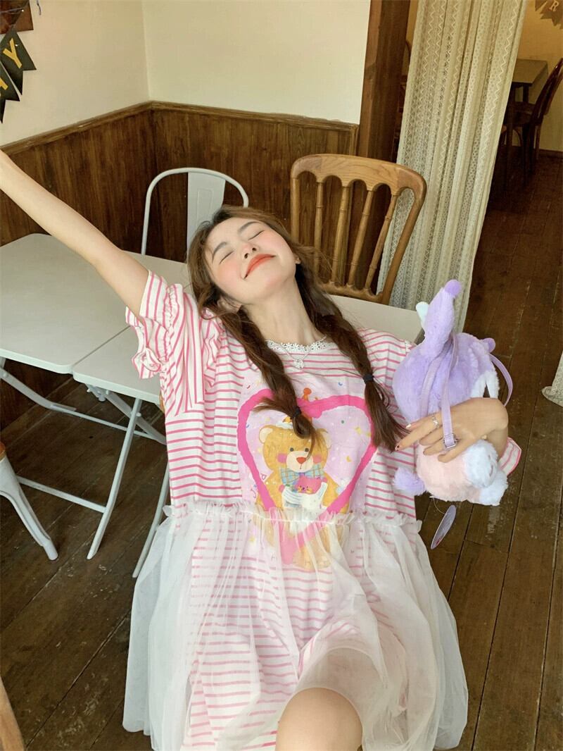 Love Bear ストライプ 半袖ドレス 夏 2023 甘いメッシュステッチ ルーズドールドレス ハーフスリーブ 大人ガーリー スウィート キュート カジュアル サマー 夏物 missk48739401696