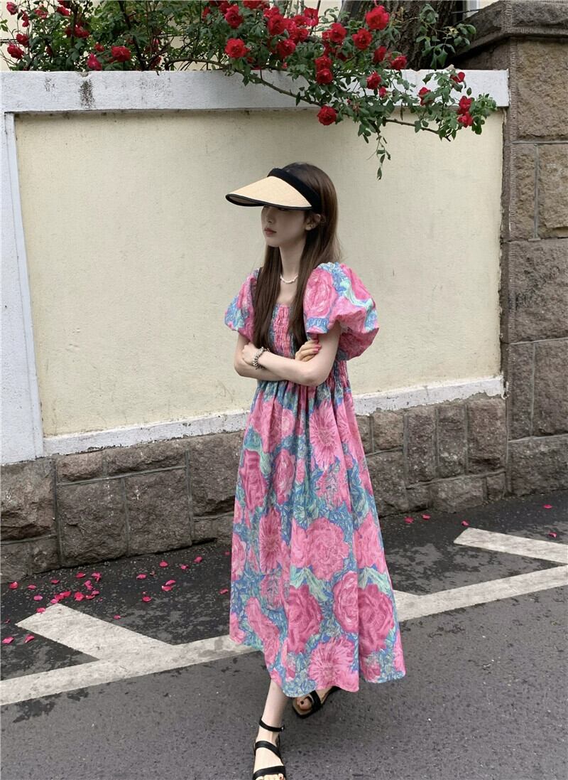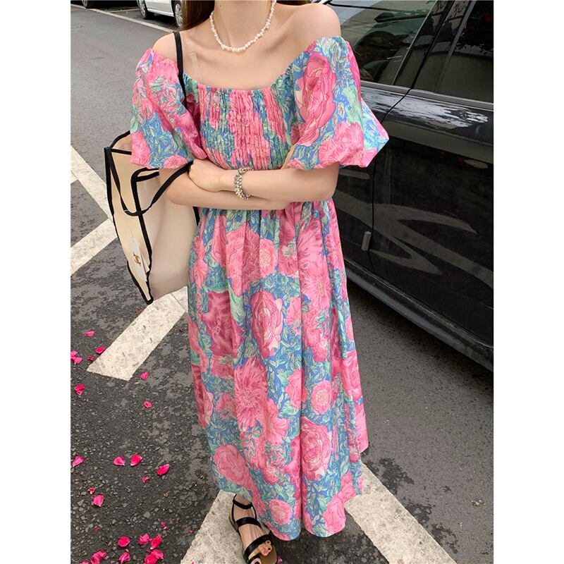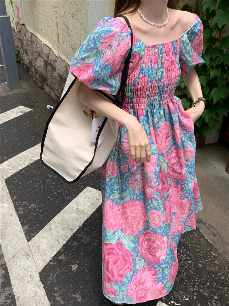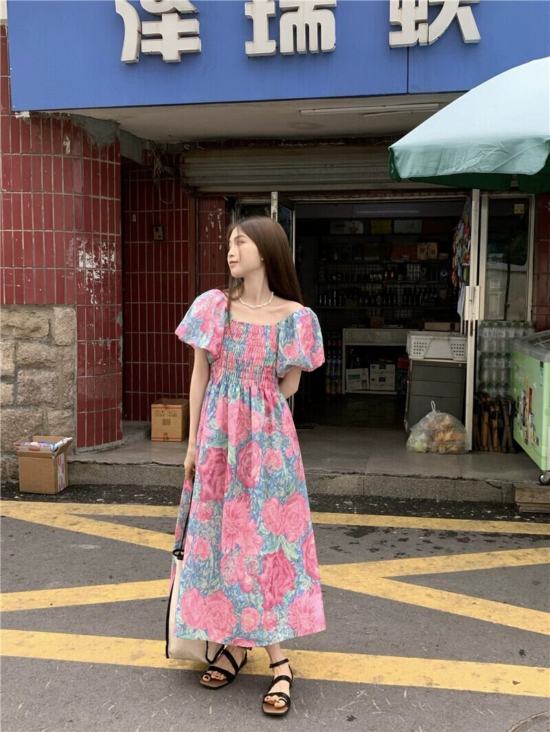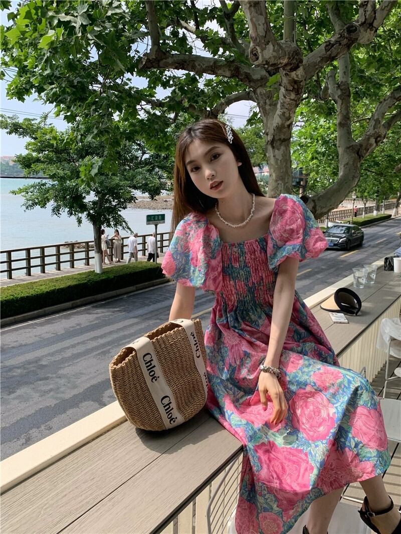 ランタンスリーブドレス女性の夏の 2023 新しいホリデースタイルスクエアカラー花柄ウエスト痩身ミッドレングス A ラインスカート サマー 夏物 Aライン スクウェア missk25642324542