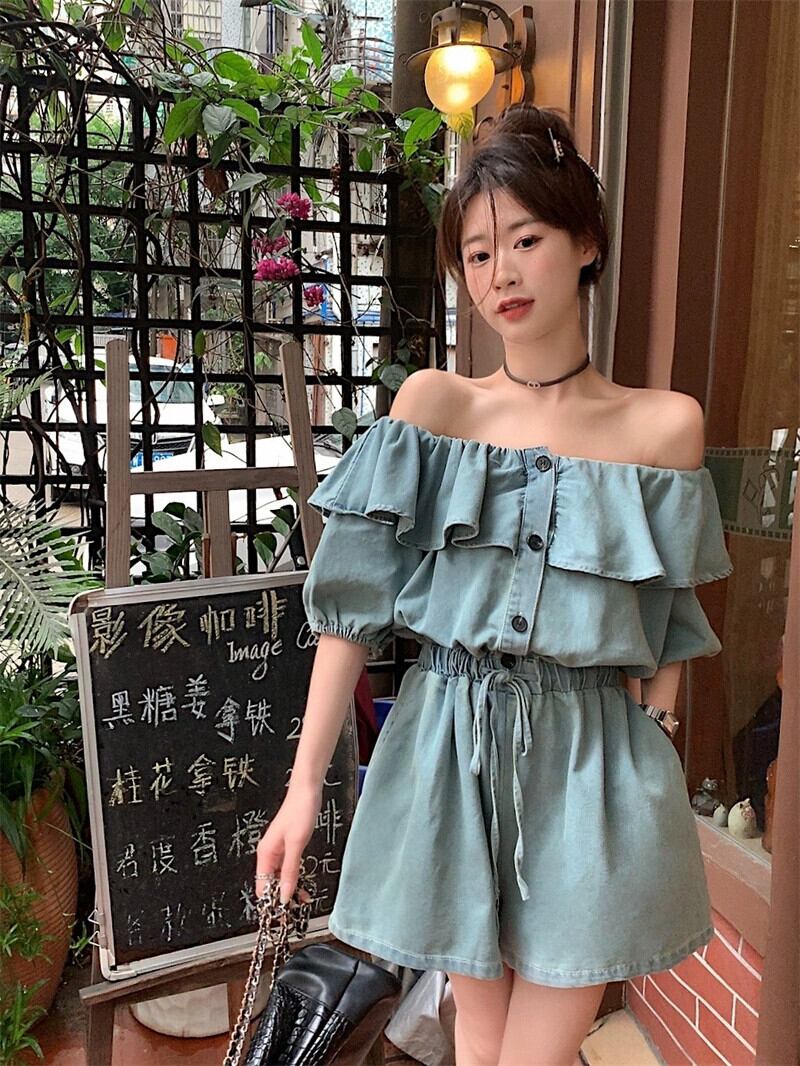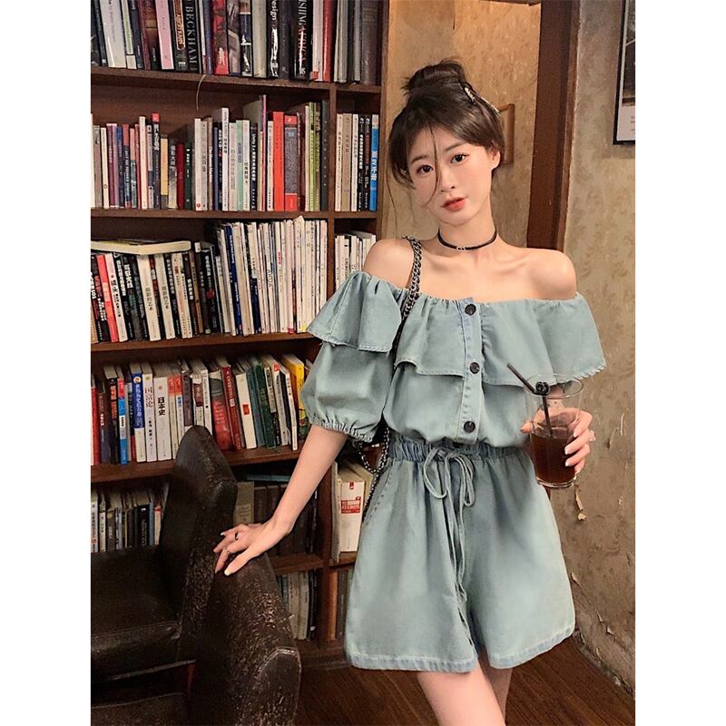 ワンショルダーワンピースデニムショートパンツレディース2023年夏新デザインセンスフリルウエスト着痩せワイドパンツ ラッフル サマー 夏物 ショーツ ブルマー missk88380372161