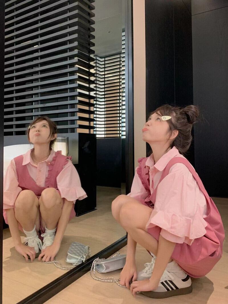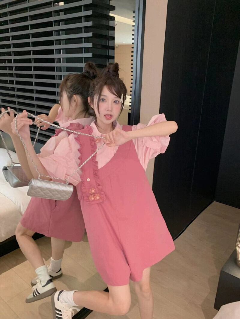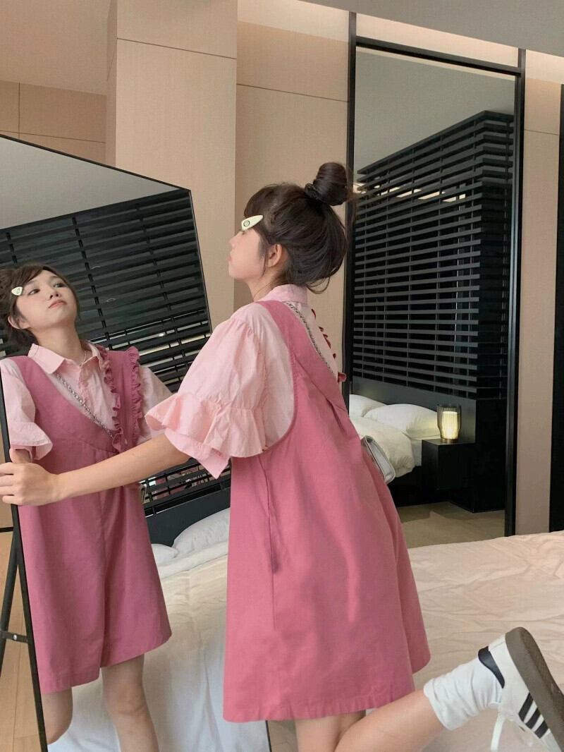 色:ピンクのシャツ,ピンクのオーバーオール