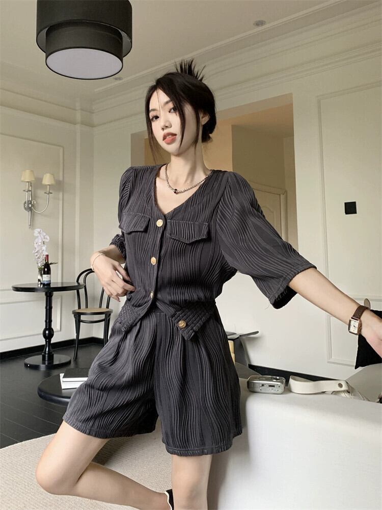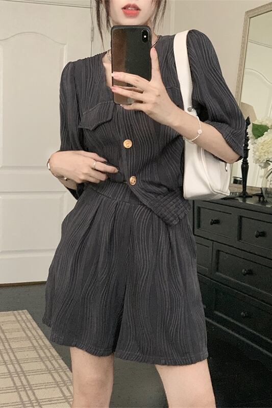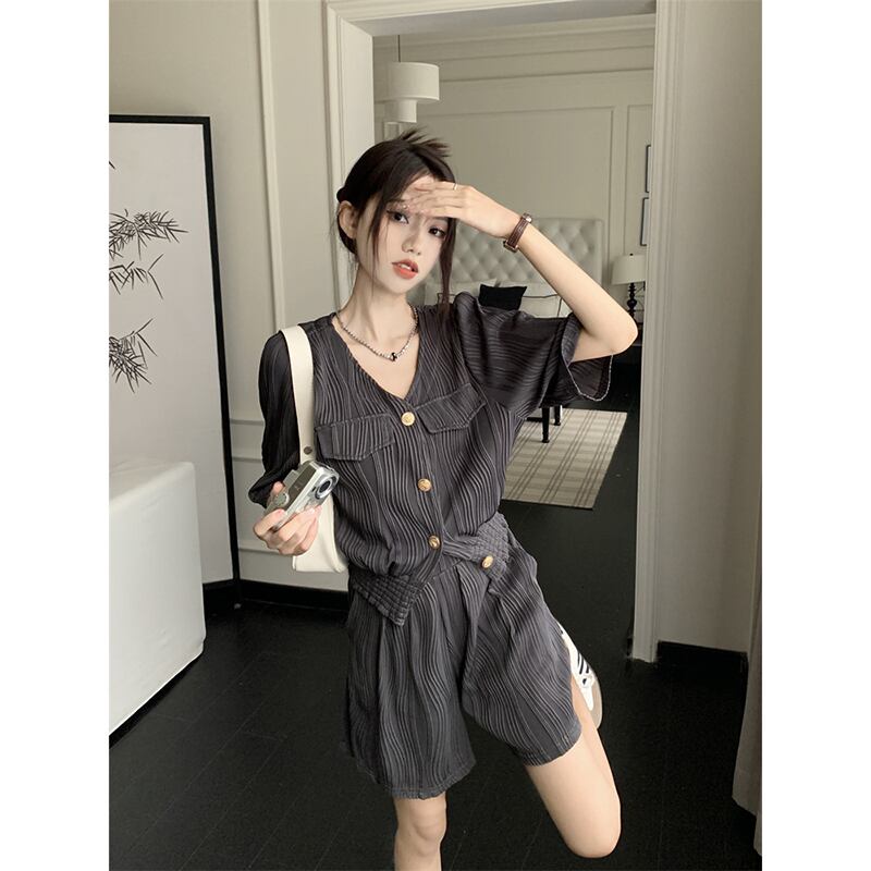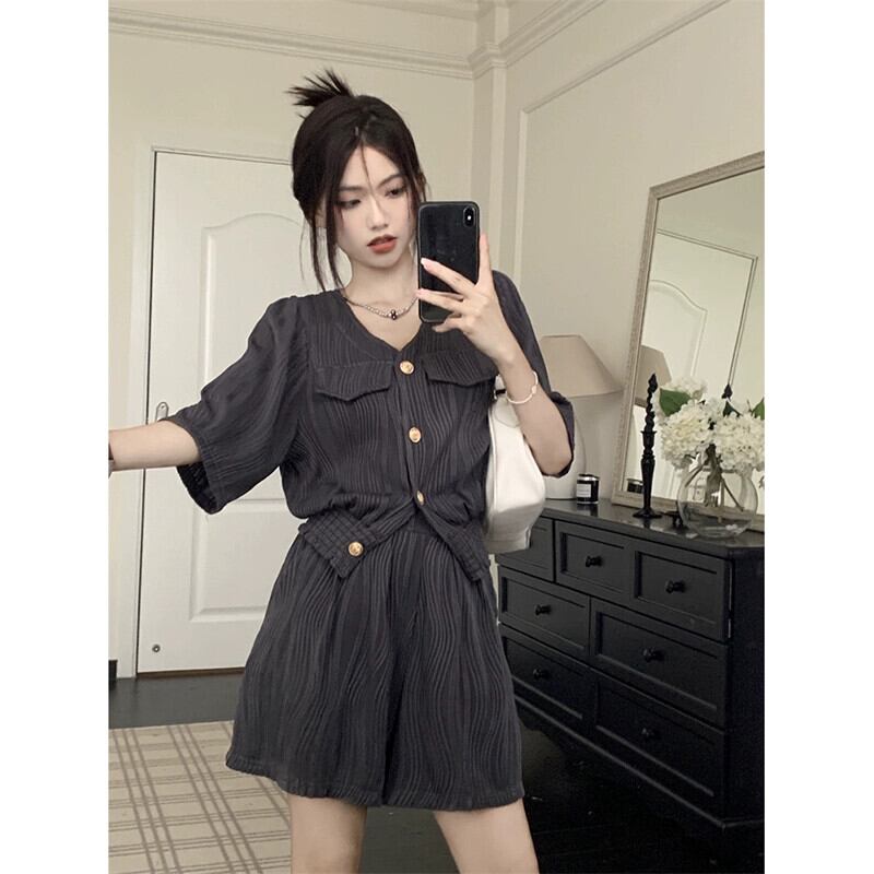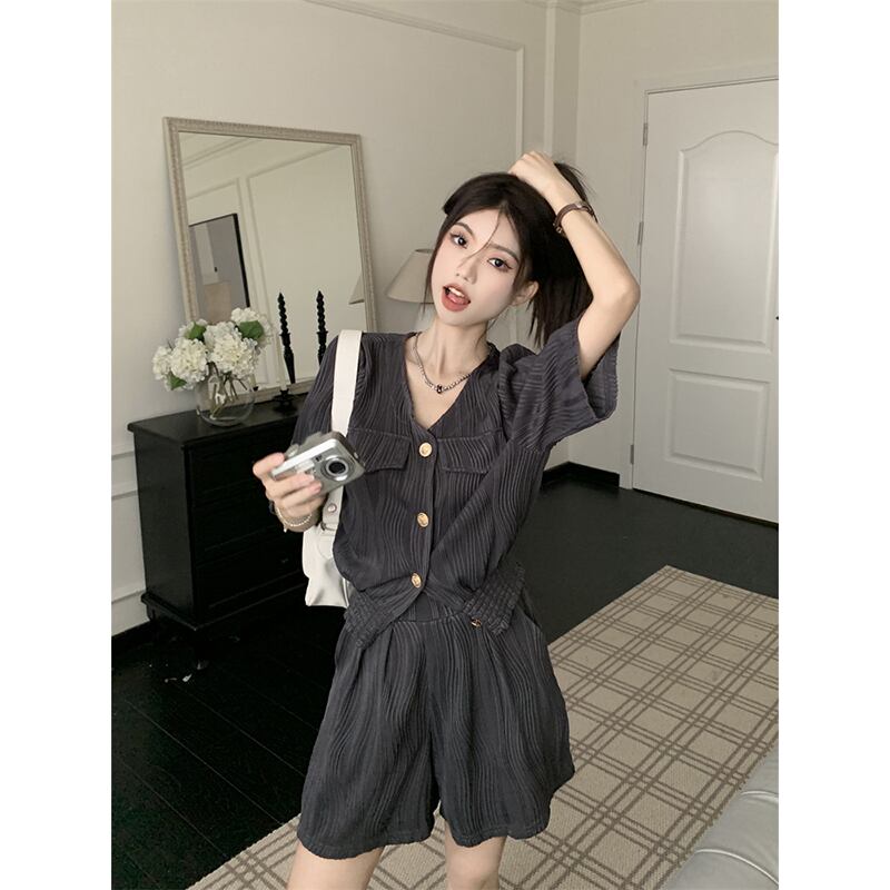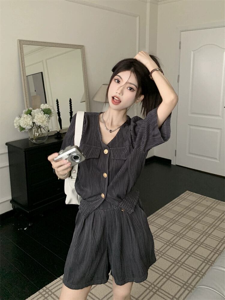 テクスチャードセレブスタイル V ネックルーズ半袖シャツワイドレッグショーツレディース 2023 夏の新しいファッション 2 点セット レッド サマー 夏物 ブルマー Vネック missk65402867933