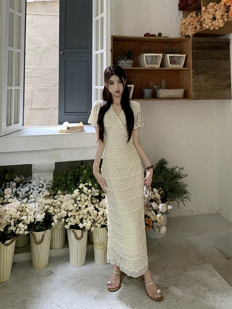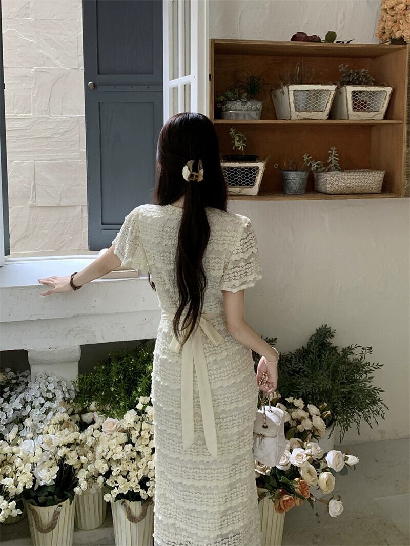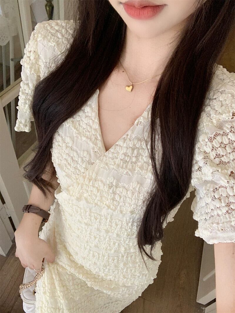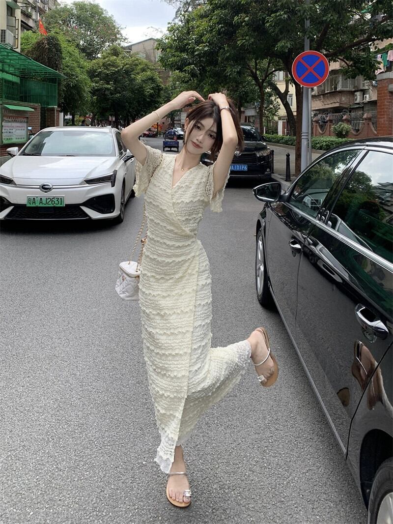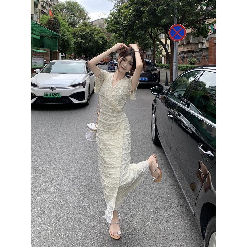 ワンピースドレスの女性の 2023 夏の新しいフレンチレース V ネックウエスト痩身気質ティーブレイクロングスカート サマー 夏物 Vネック missk98735992693