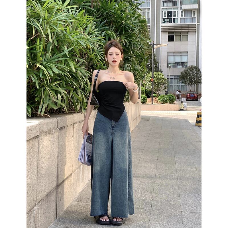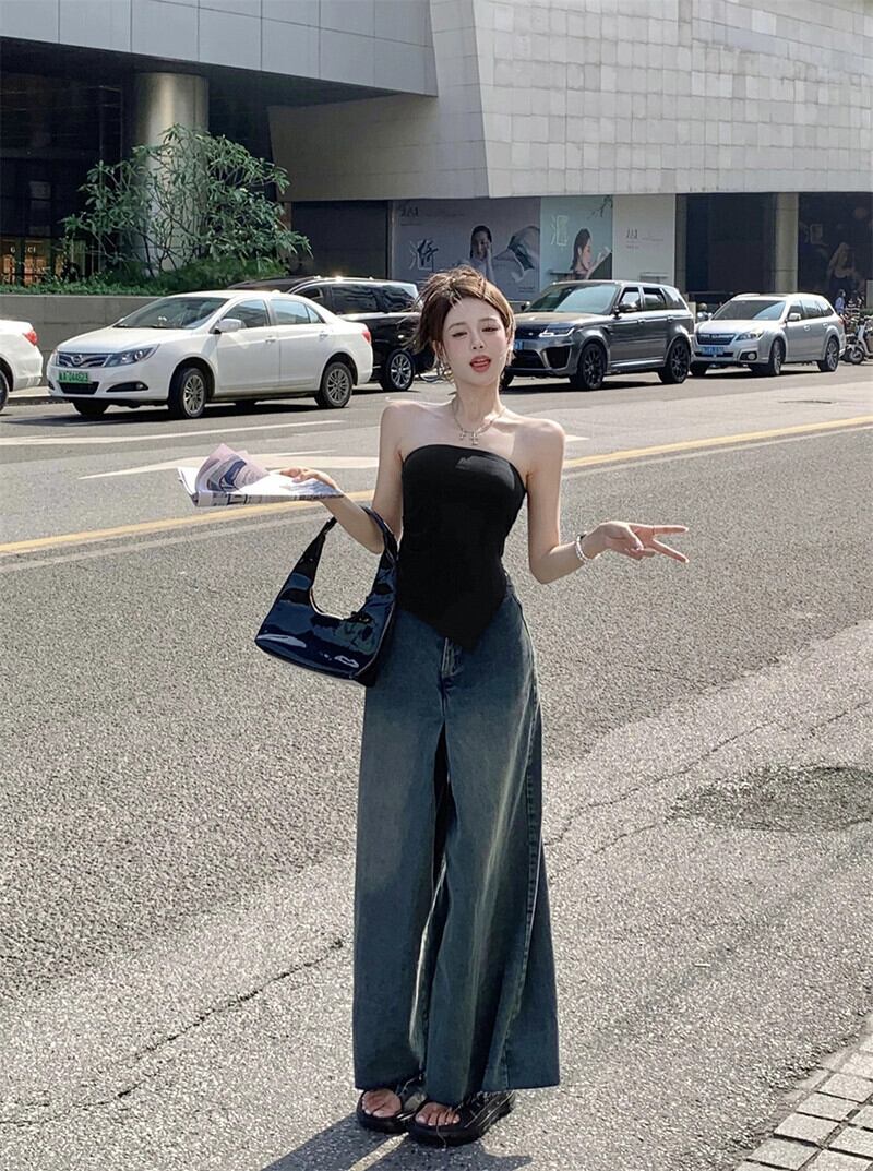 色:デニムブルーワイドレッグパンツ,黒いチューブトップ