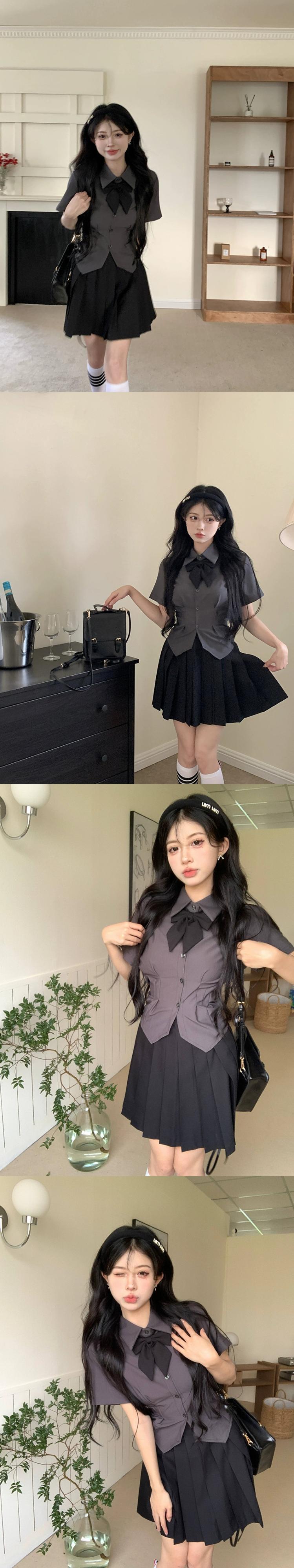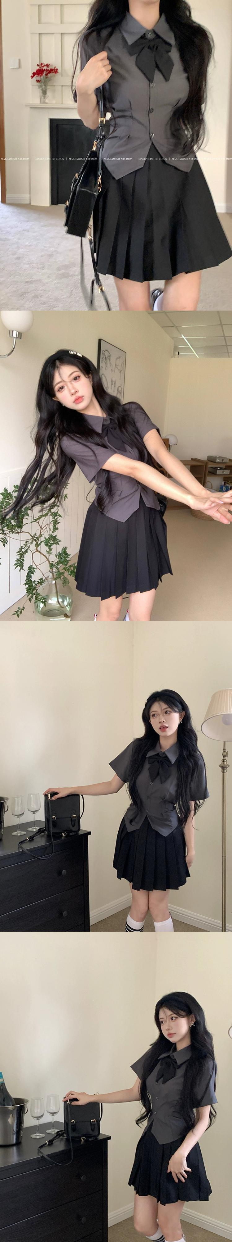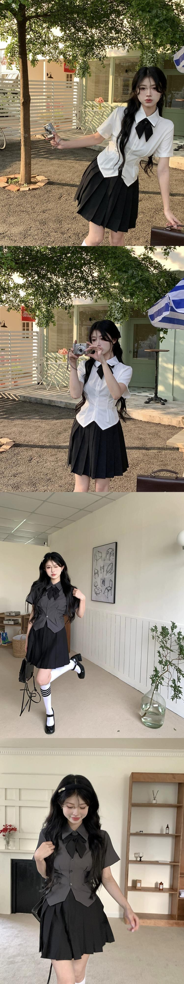 色:グレーのトップ+蝶ネクタイ,白いシャツ+蝶ネクタイ,黒スカート