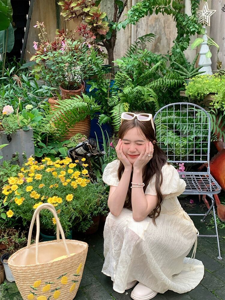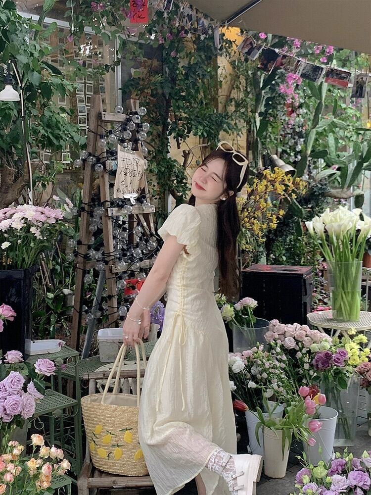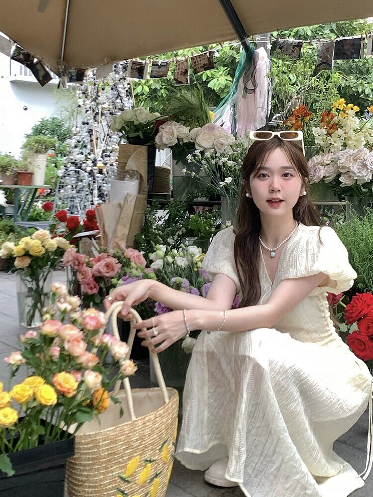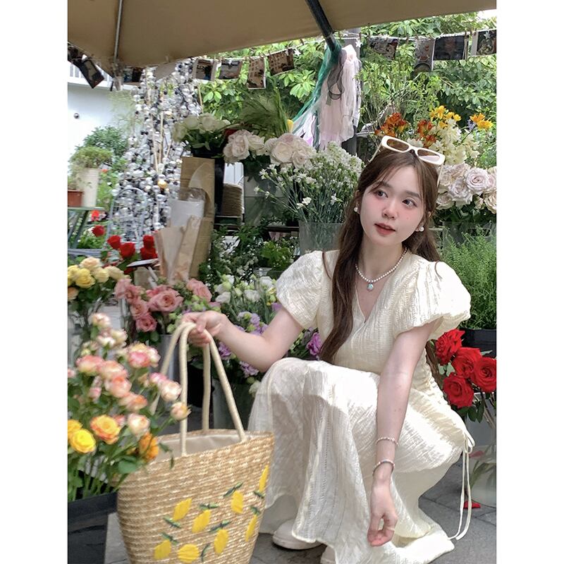 2023 夏の新フレンチスタイル V ネック eign スタイルシンプルなシャーリングウエスト痩身パフスリーブ桔梗ドレスの女性のファッション サマー 夏物 Vネック フラワーデザイン missk31245559883