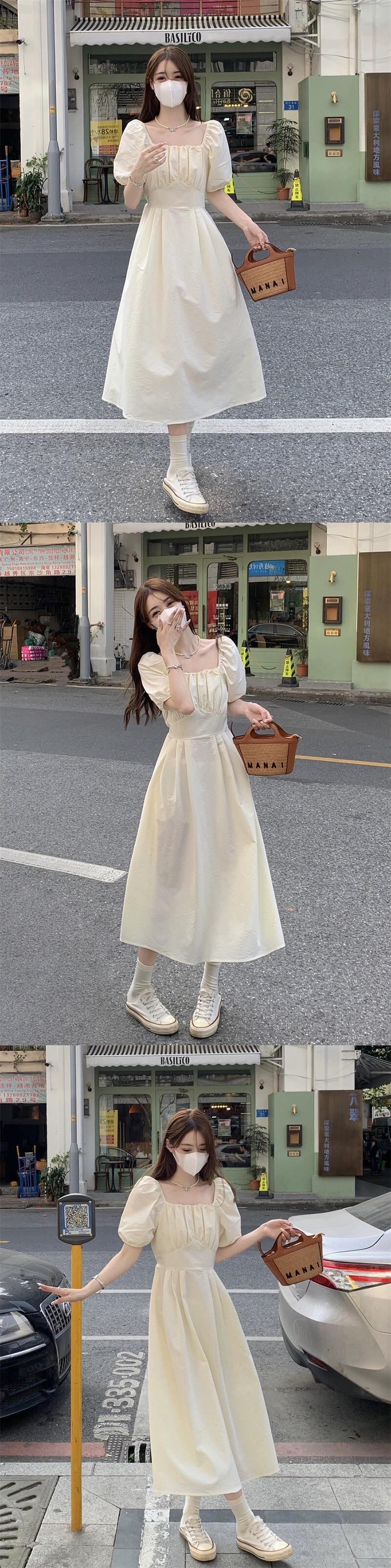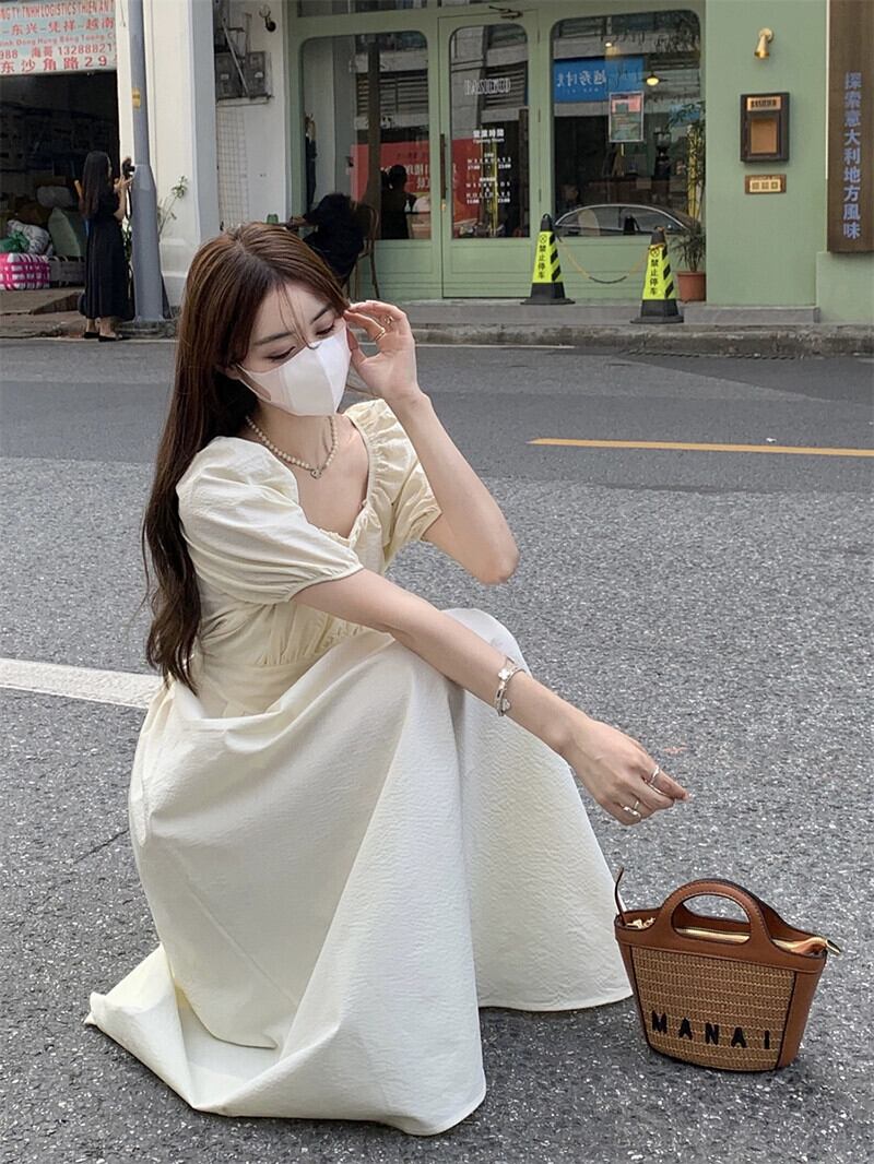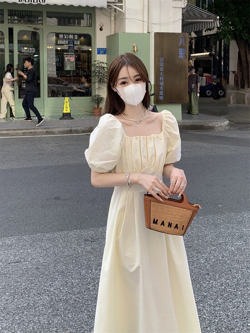 優しい風スクエアカラードレスの女性の 2023 夏の新作パフスリーブウエスト痩身ミッドレングス半袖ティーブレイクスカート サマー 夏物 スクウェア missk23056295078