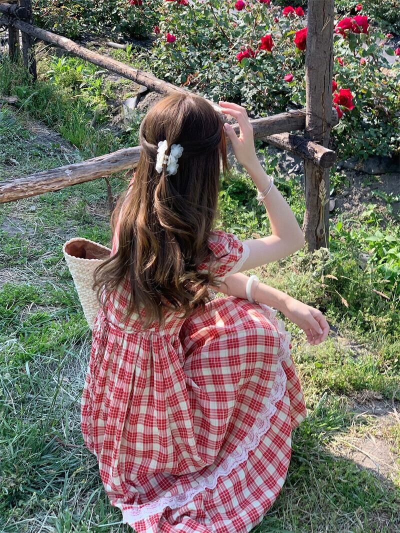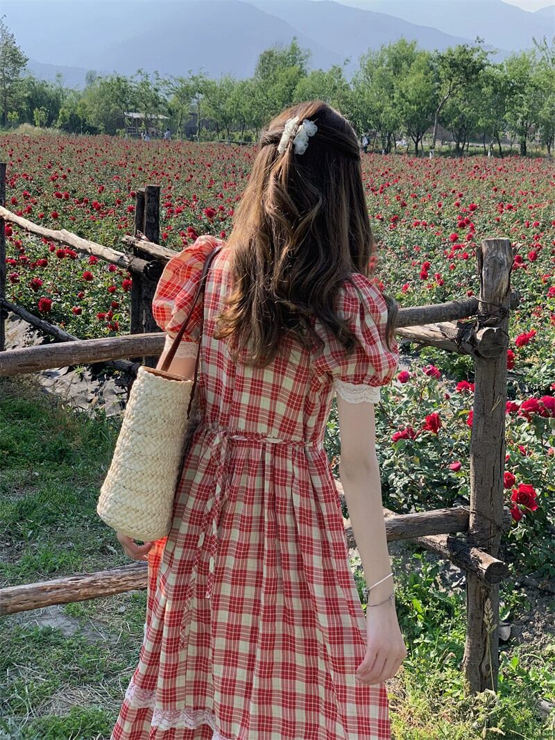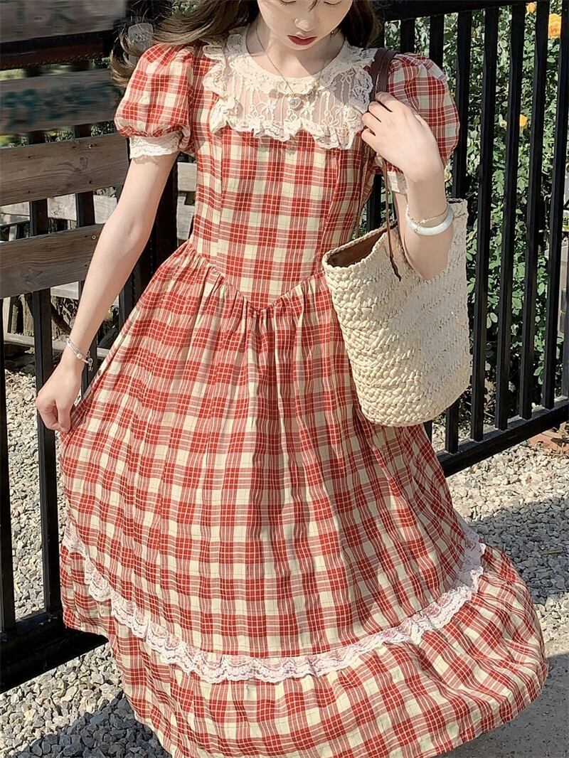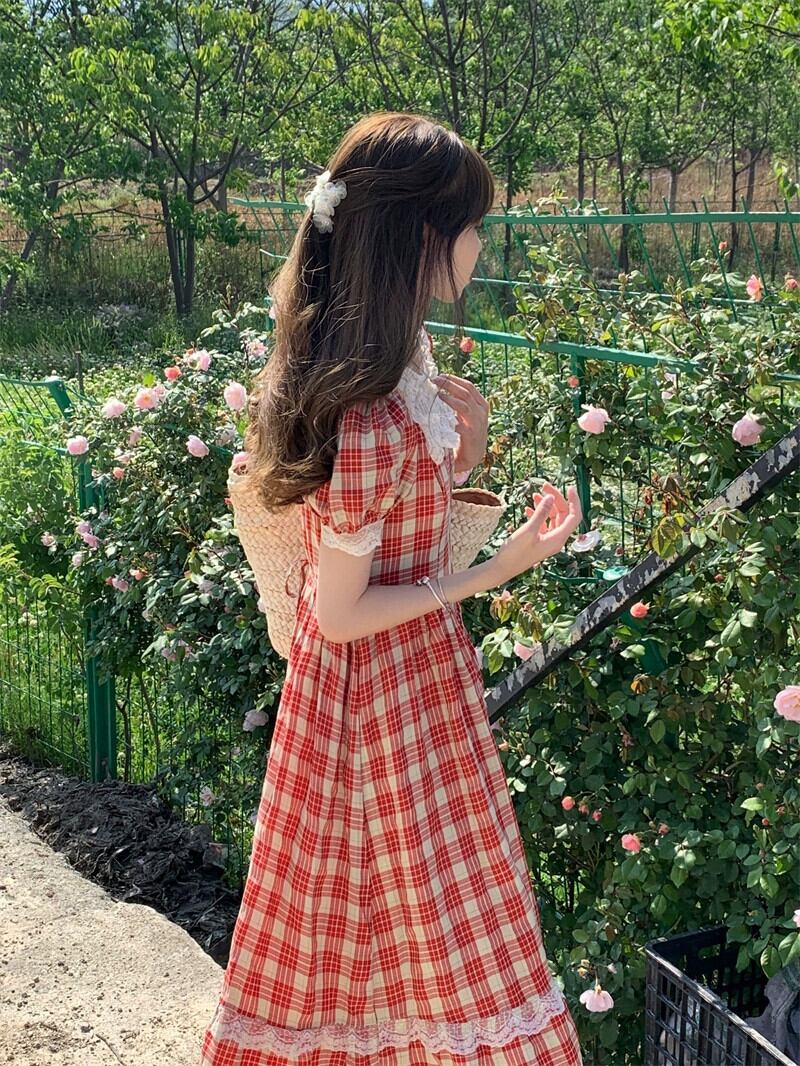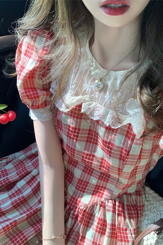 レースステッチチェック柄半袖ドレスの女性の夏の 2023 新しいコートスタイルスリムウエストミッドレングススカート サマー 夏物 missk61549912643