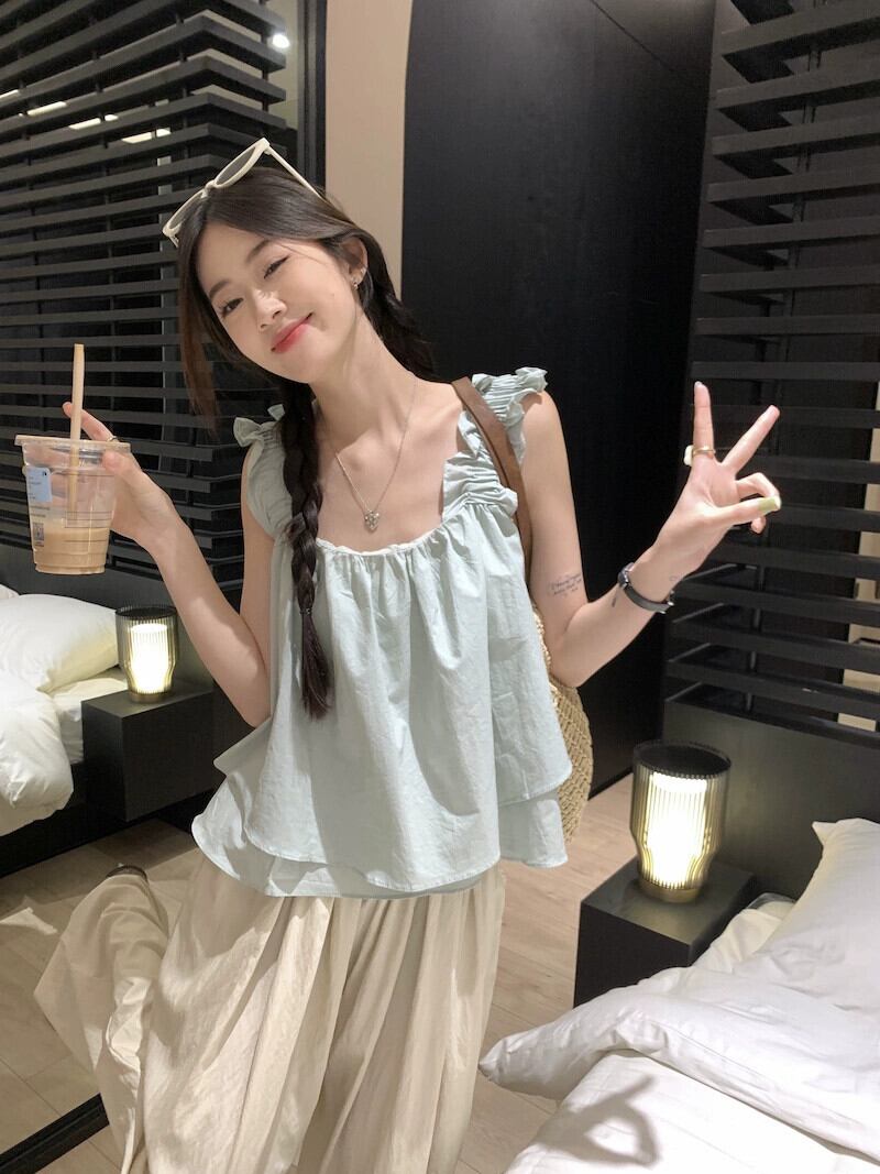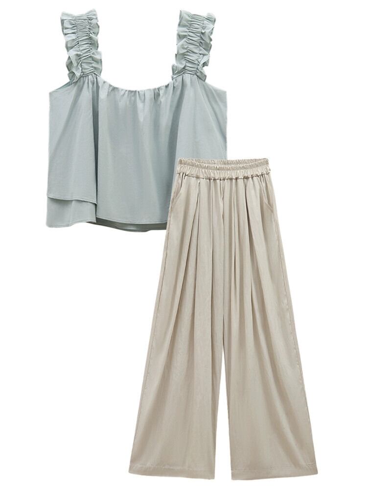 シックなフリルサスペンダー小さなシャツハイウエストワイド脚カジュアルパンツ女性の夏バージョン 2023 新しいファッションスーツ ハイウェスト サマー 夏物 ワイドレッグ ワイドパンツ missk69533419013