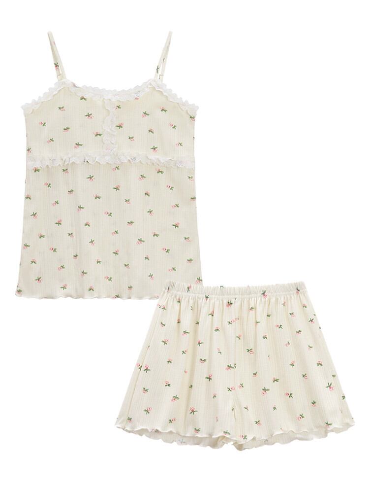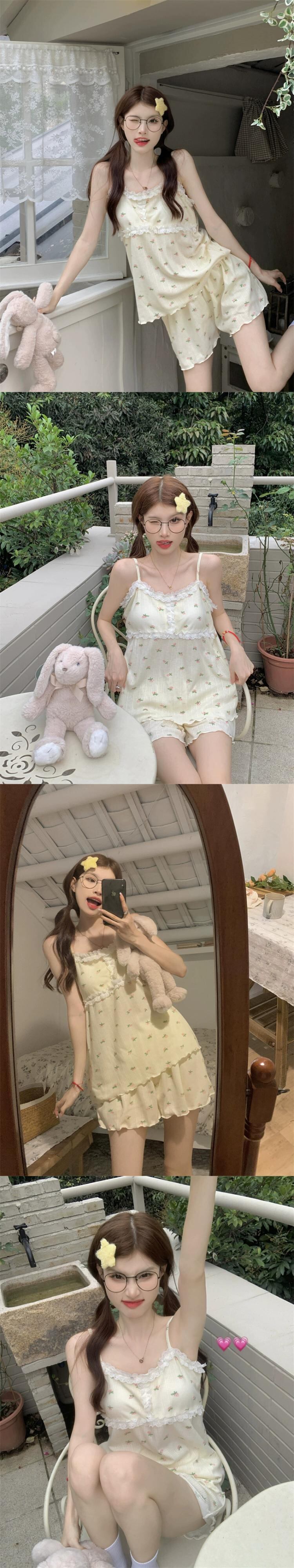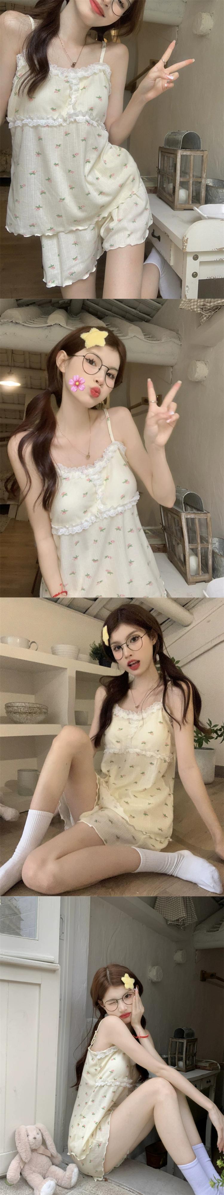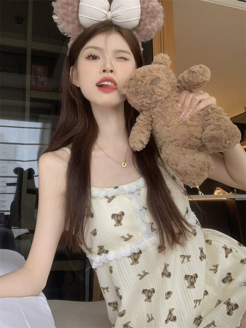 甘いレースレースクマプリントキャミソールショーツパジャマセット女性の夏の 2023 新しいホーム服 大人ガーリー スウィート キュート カジュアル サマー 夏物 ブルマー missk88500138355