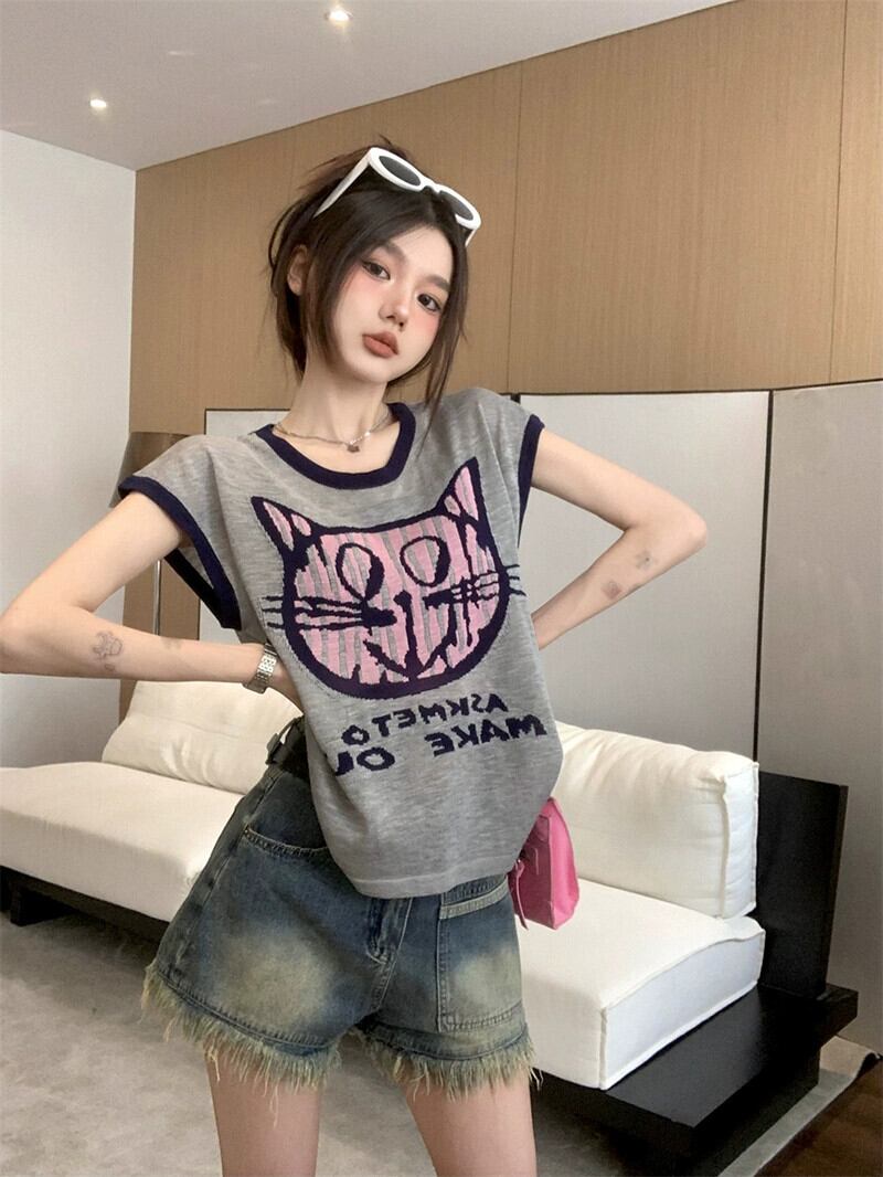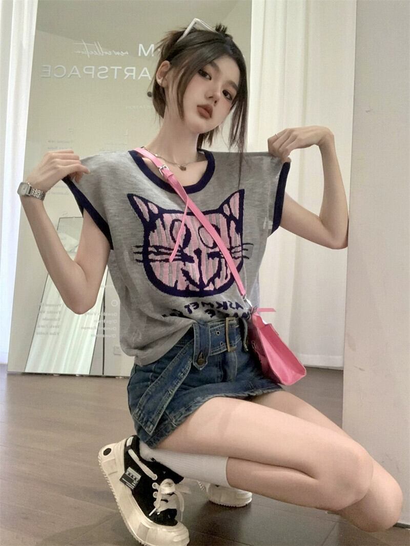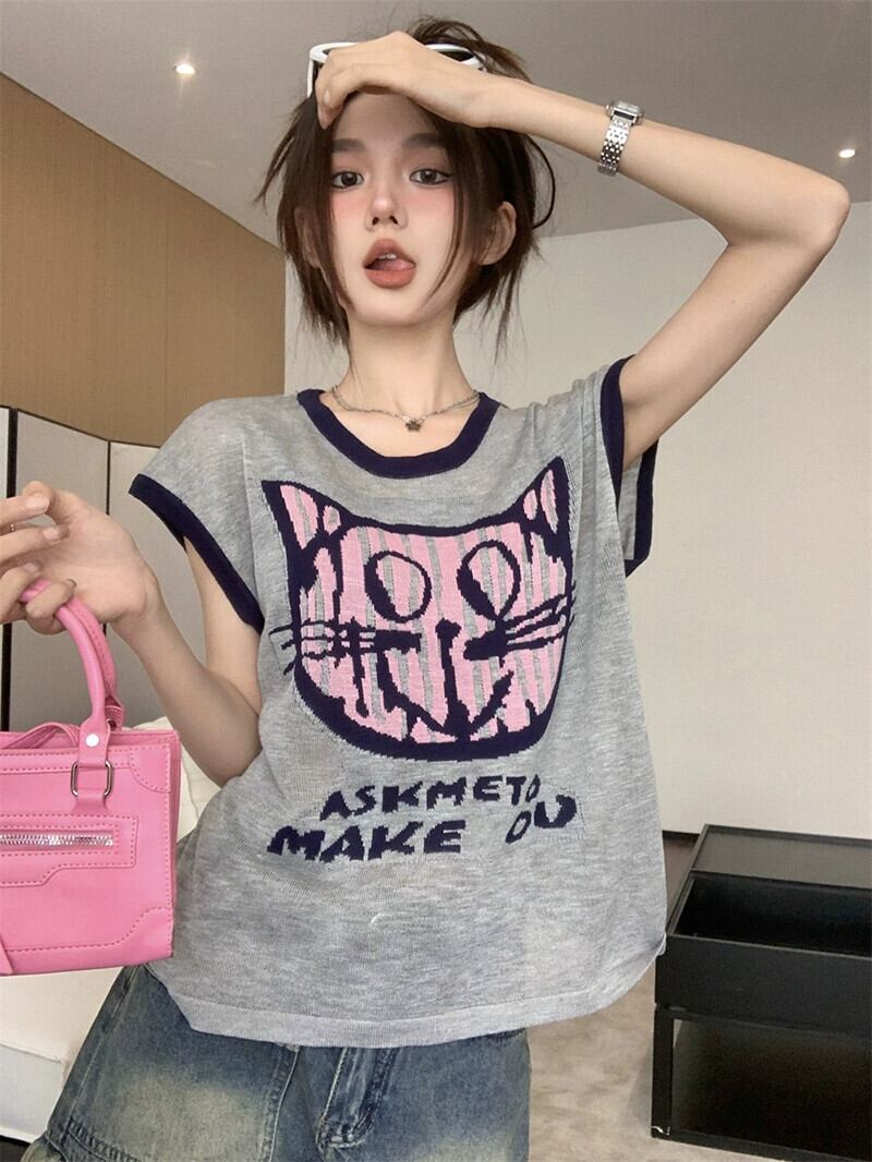 アイスシルク半袖 T シャツの女性の夏バージョン 2023 新しい楽しい漫画プリントコントラストカラールーズオールマッチトップイン サマー 夏物 Tシャツ missk7447068791