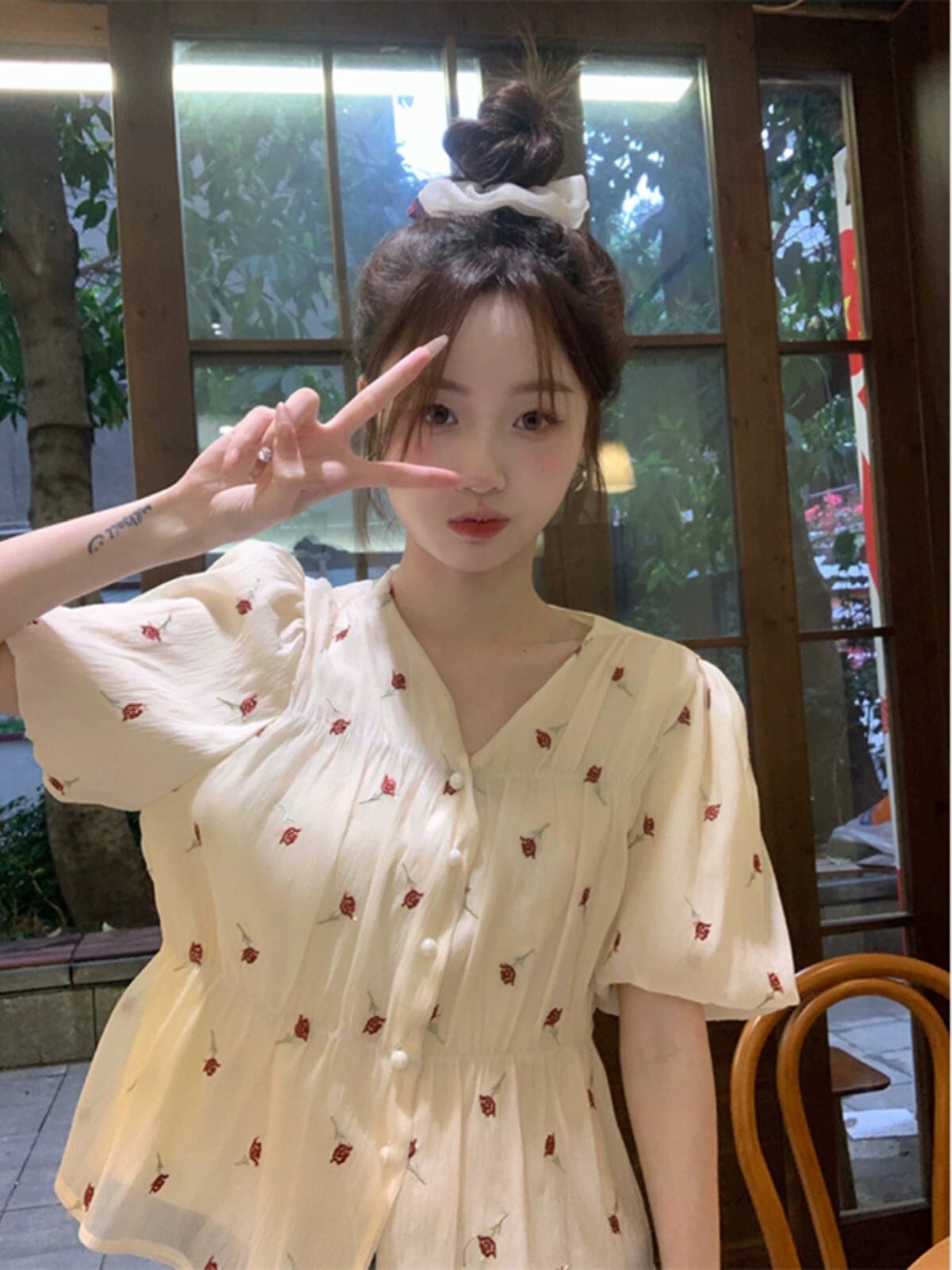 スイートフレンチパフスリーブシャツレディース2023夏新作Vネック刺繍メッシュステッチスーパーフェアリー半袖トップ 大人ガーリー スウィート キュート カジュアル サマー 夏物 missk36459645130