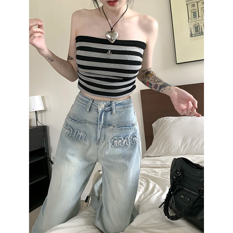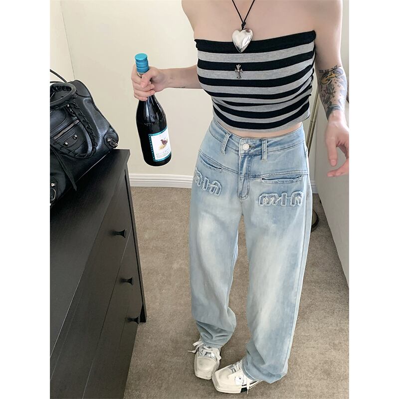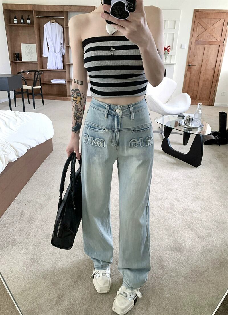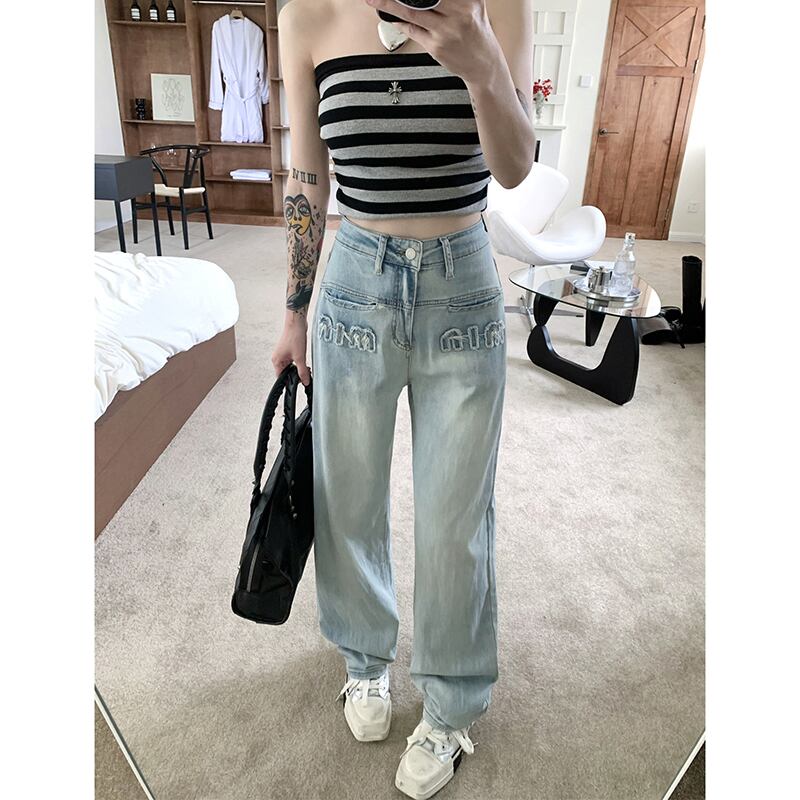 ホットハイウエストデニムパンツレディース夏バージョン2023新しいデザインセンス細文字刺繍ストレートパンツ ハイウェスト サマー 夏物 missk7750003608