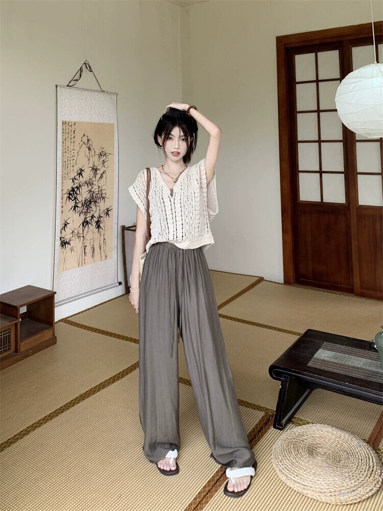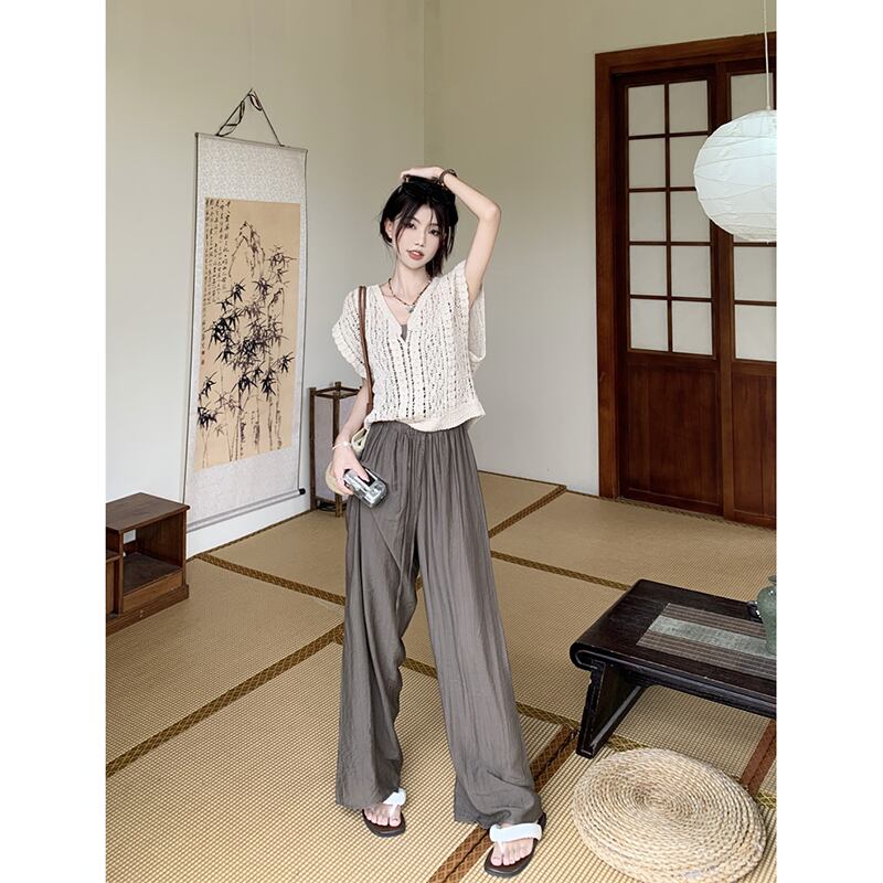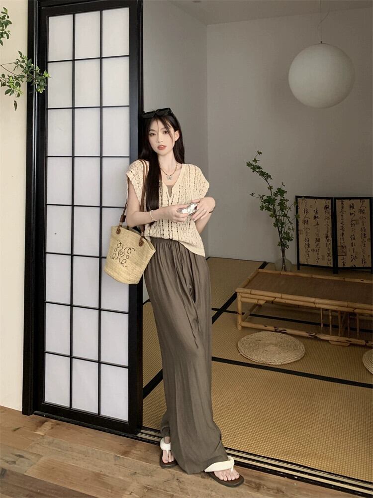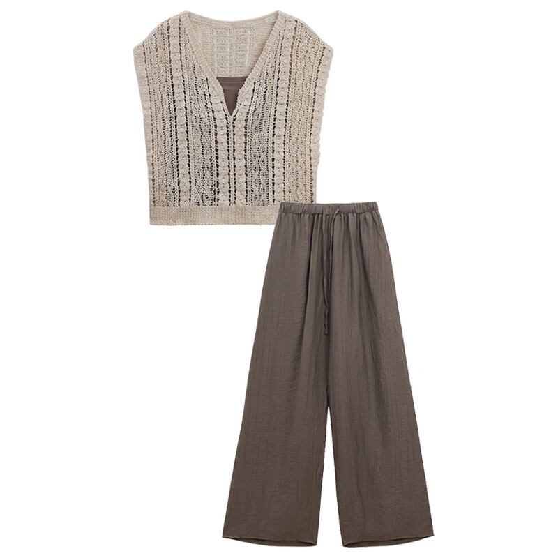 色:コーヒー色のスリング,アプリコットのかぎ針編みトップ,ブラウンワイドパンツS,ブラウンワイドパンツM,ブラウンワイドパンツL