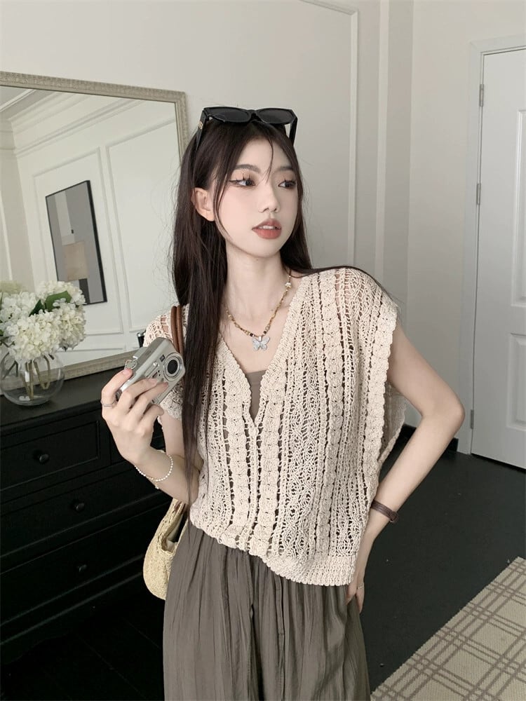 中空かぎ針編みノースリーブニットセーター女性の夏の 2023 新しい薄いセクションレイヤードウェアデザインショートトップ レッド サマー 夏物 missk69493197087
