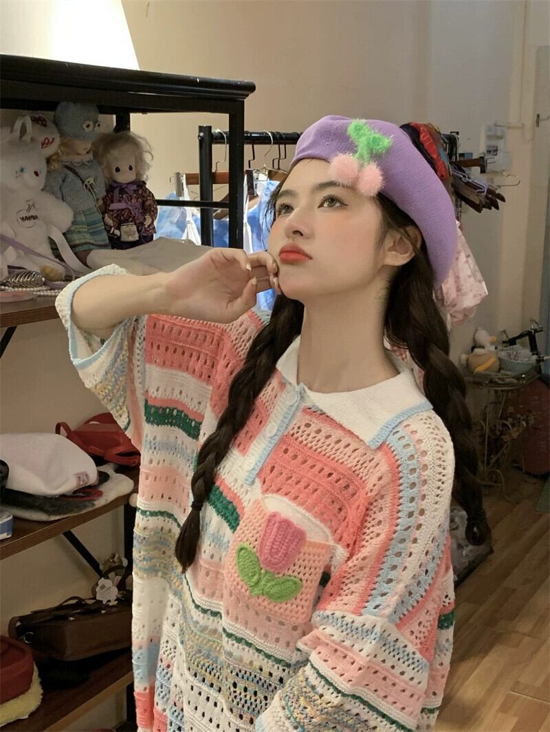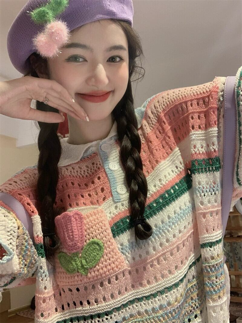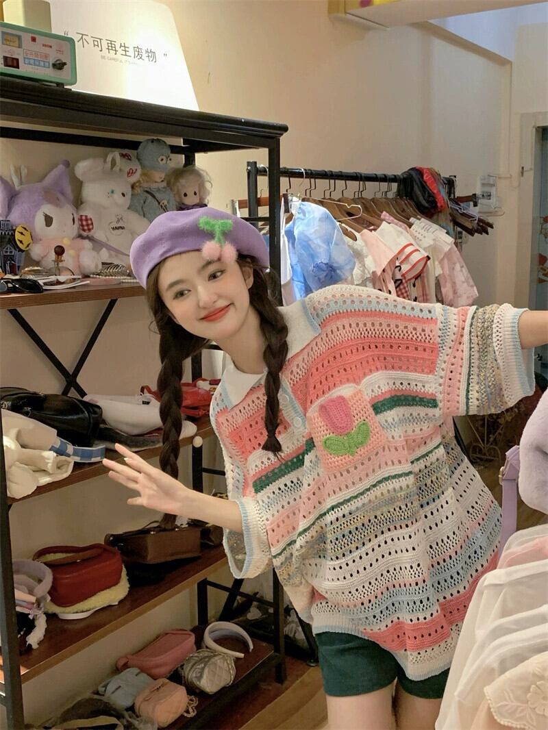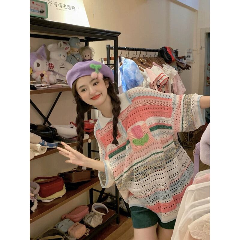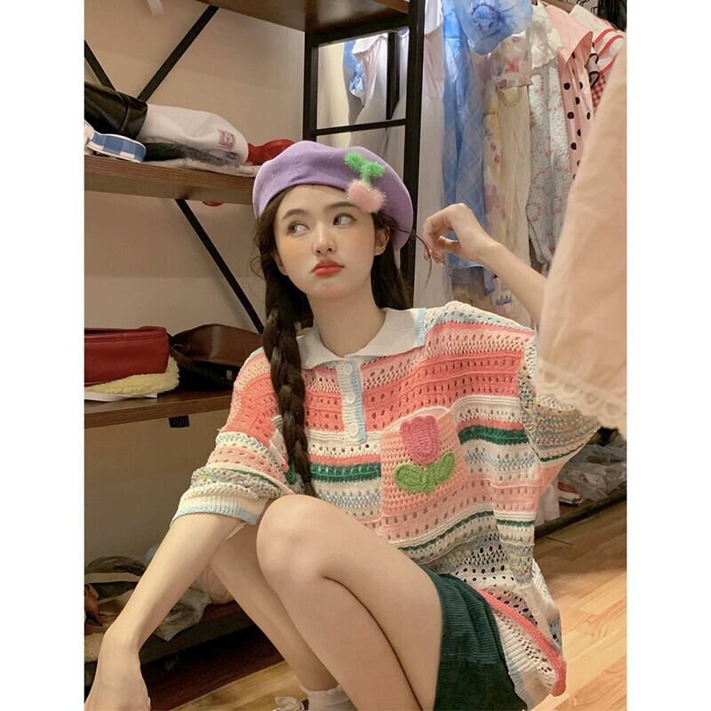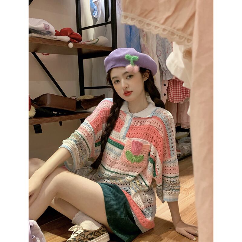 ポロカラー中空半袖ニットセーター女性の夏の2023新しい甘いカラーマッチングデザインセンス薄いカーディガントップ 大人ガーリー スウィート キュート カジュアル サマー 夏物 missk73701392236