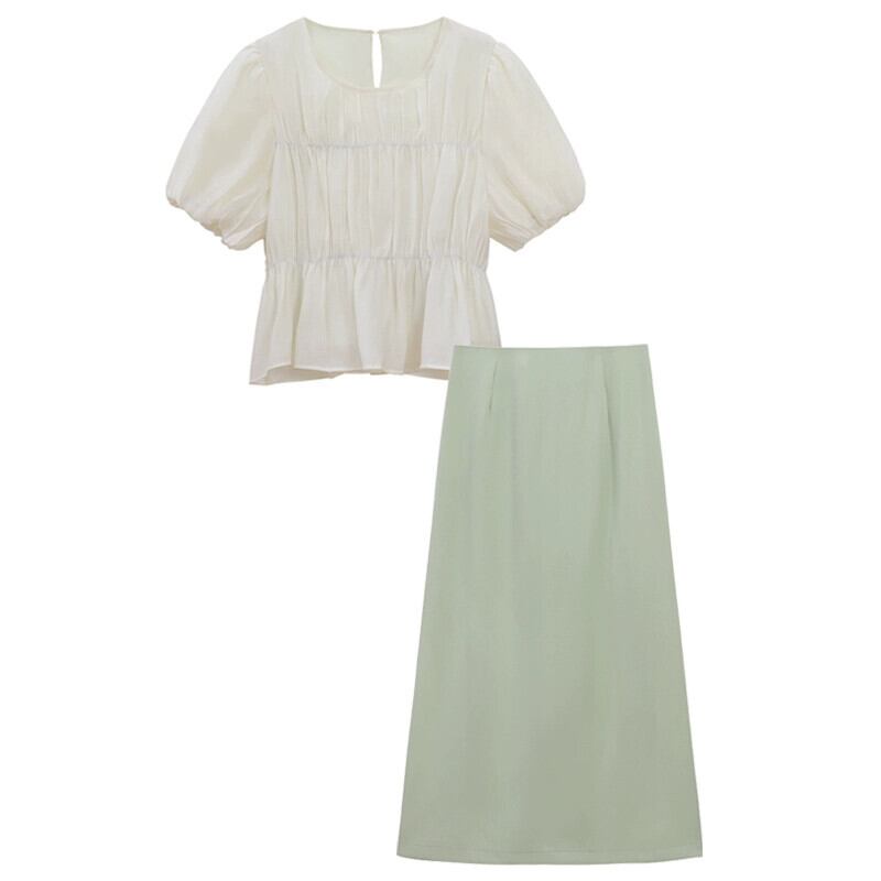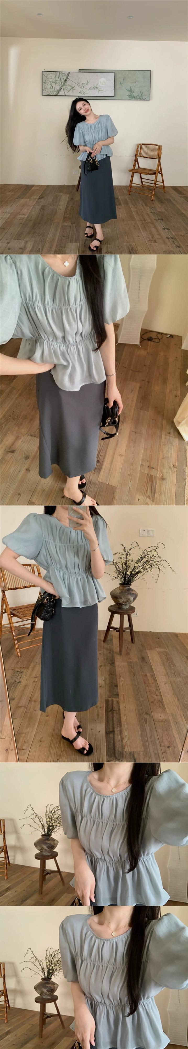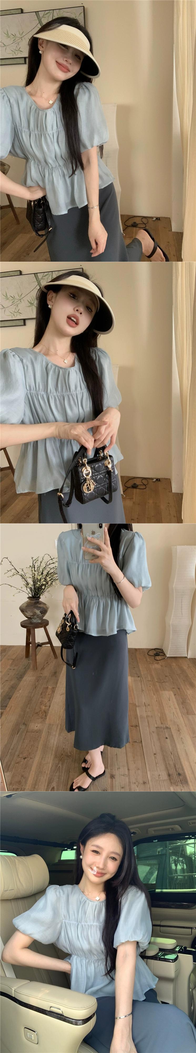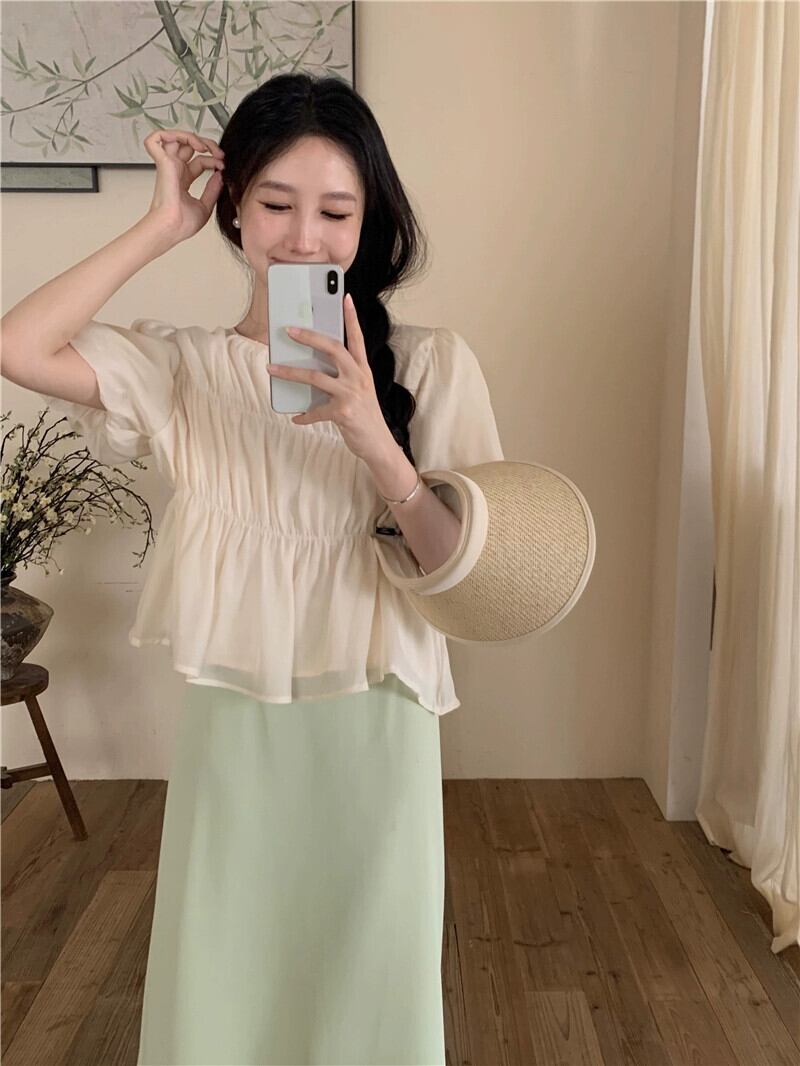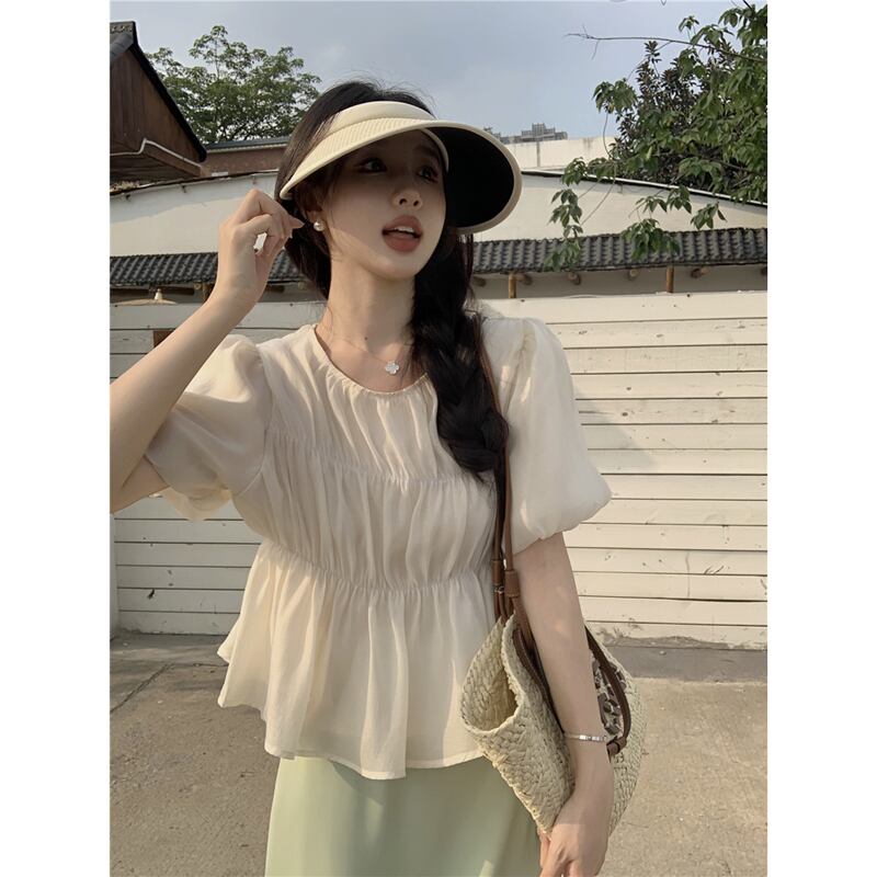 優しい風パフスリーブシャツ女性の2023年夏新しい気質プリーツウエスト痩身オールマッチ半袖トップ サマー 夏物 missk21374960103