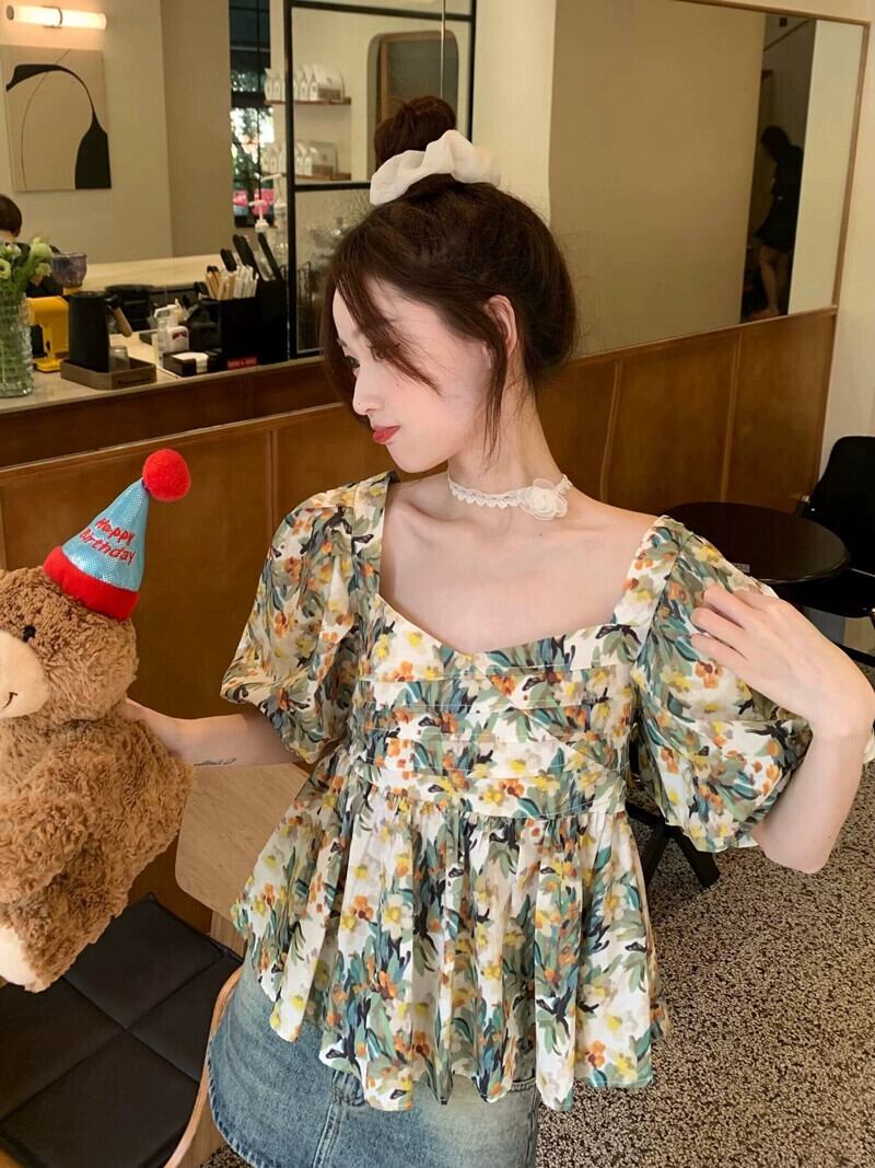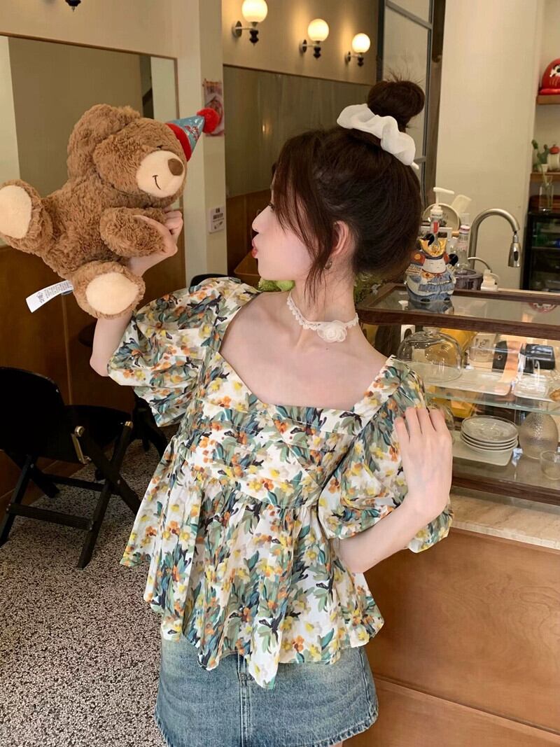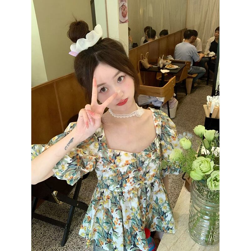 フレンチスクエアカラーシャツレディース2023年夏新作レトロパフスリーブデザイン感覚ゆったり年齢軽減半袖トップ サマー 夏物 スクウェア missk87243761674