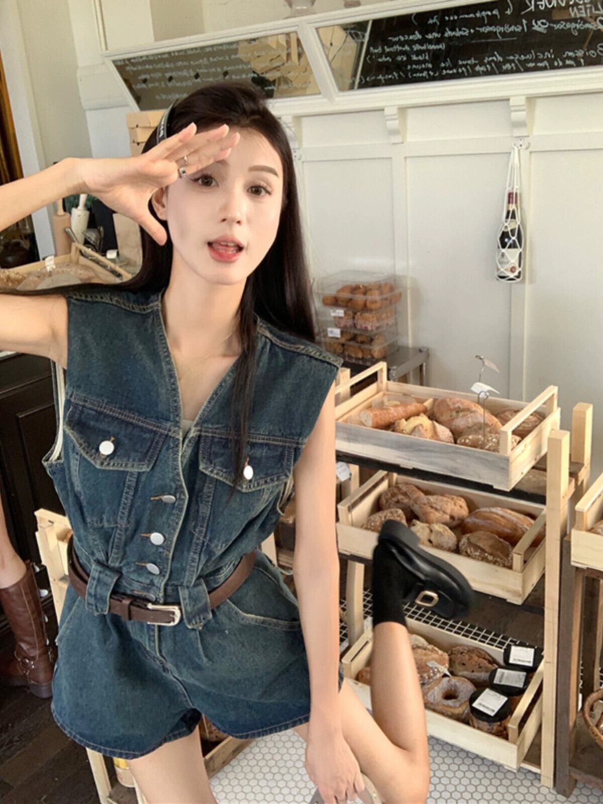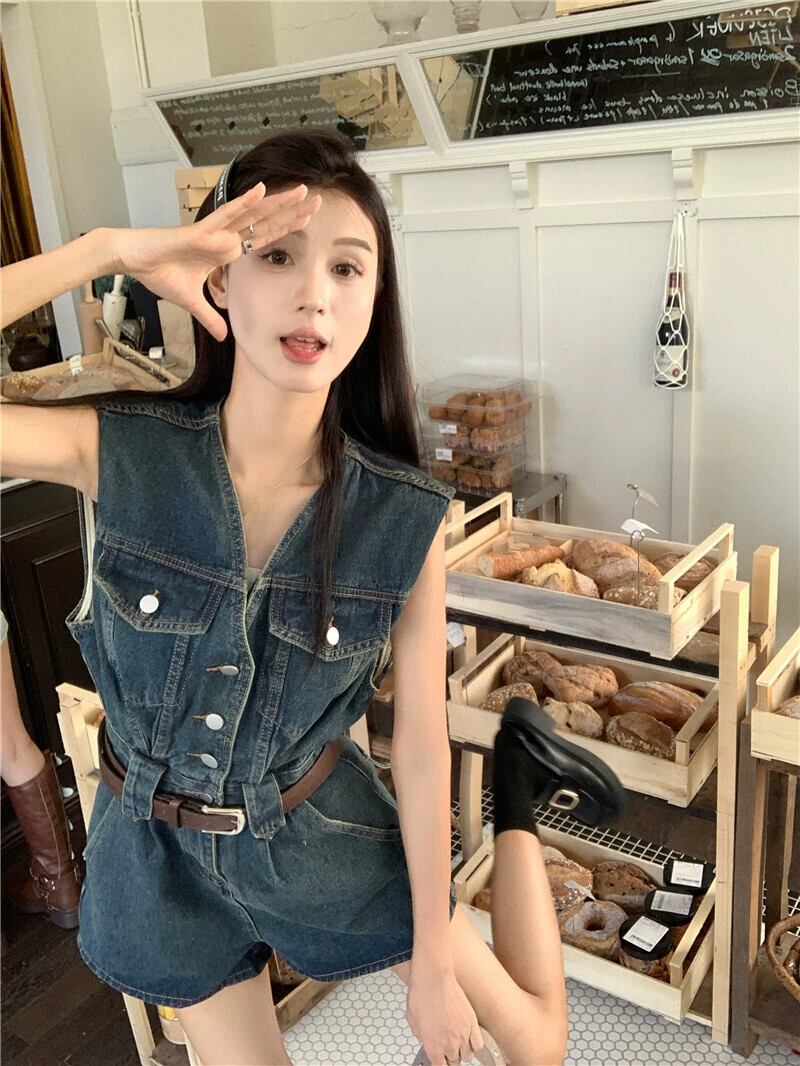V ネックノースリーブワンピースジーンズ女性の夏 2023 新しいレトロ香港スタイルウエスト痩身ワイドレッグオーバーオールショートパンツ サマー 夏物 ショーツ ブルマー Vネック missk89225879457