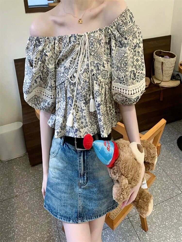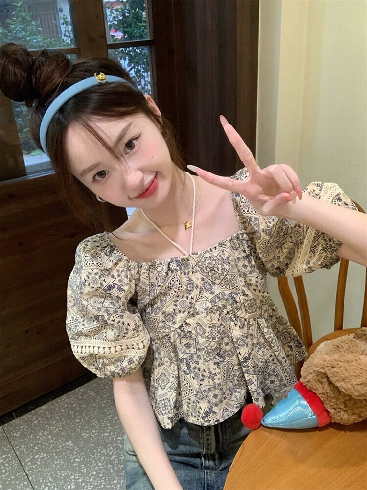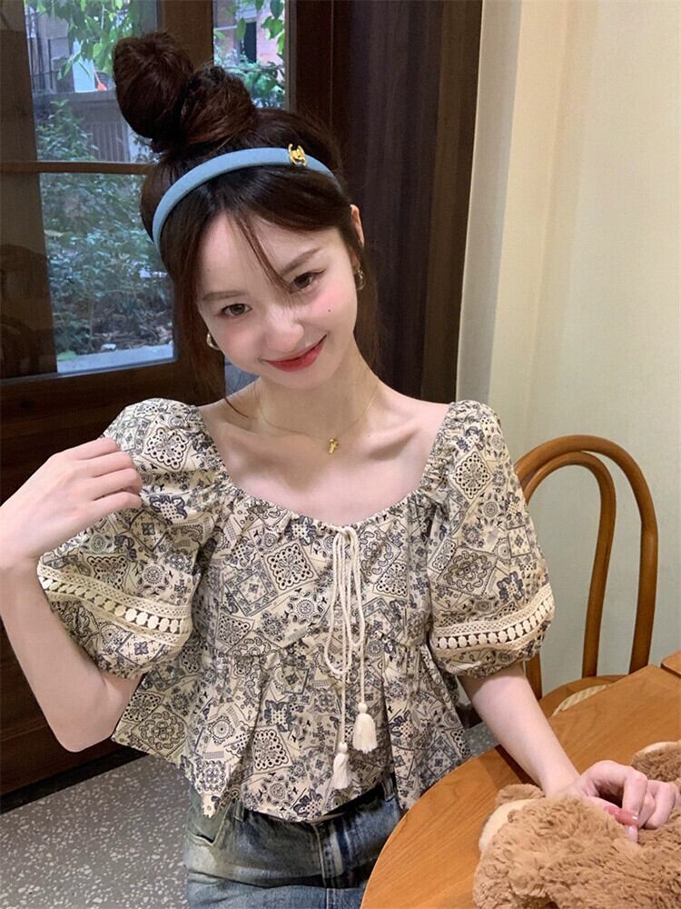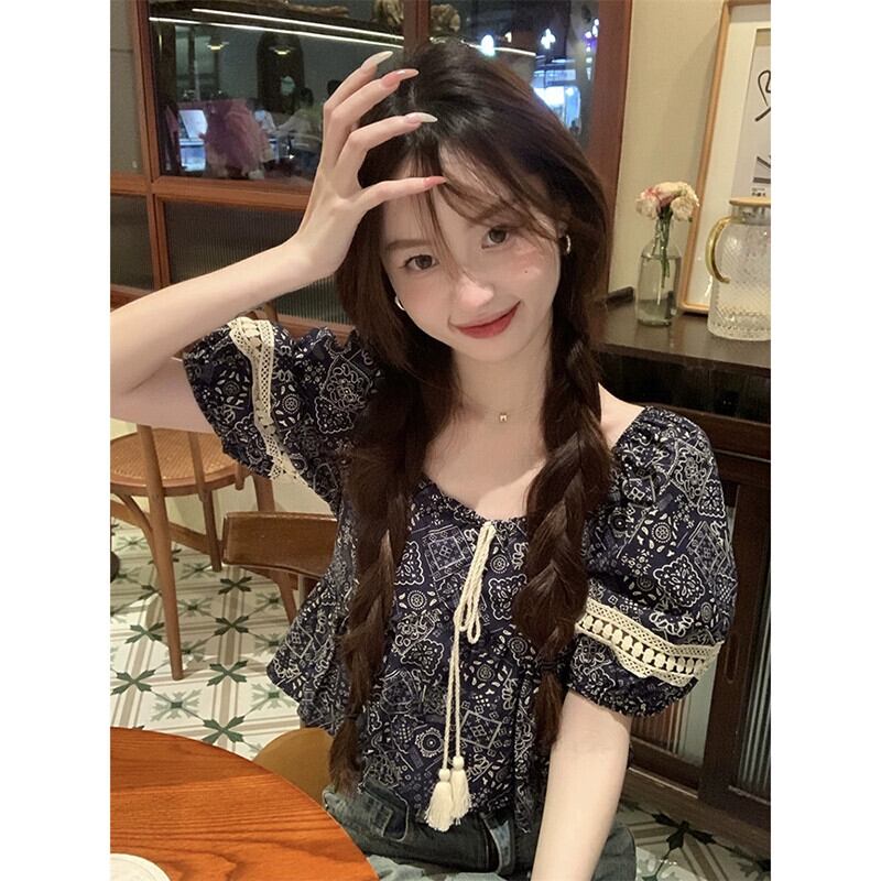 レトロスクエアカラーパフスリーブシャツ女性の夏の2023新しい電話ネクタイデザインセンス中空半袖トップ潮 サマー 夏物 スクウェア missk59960846350