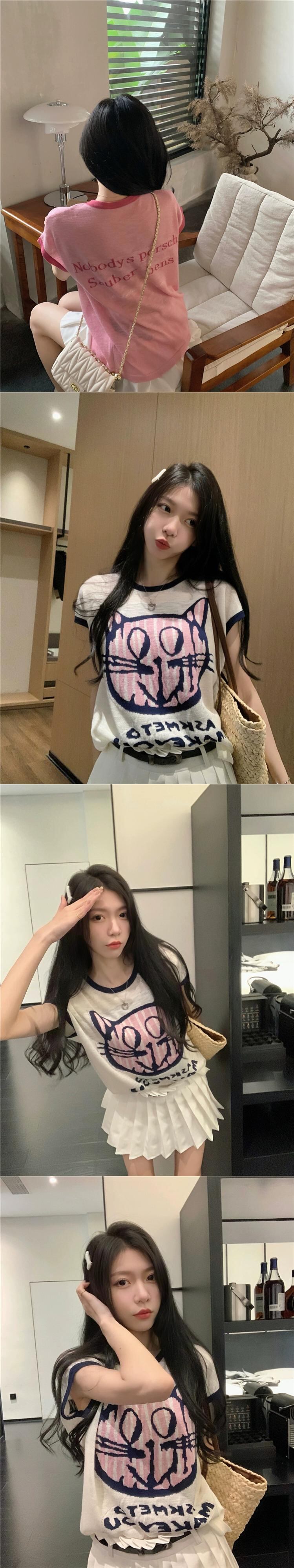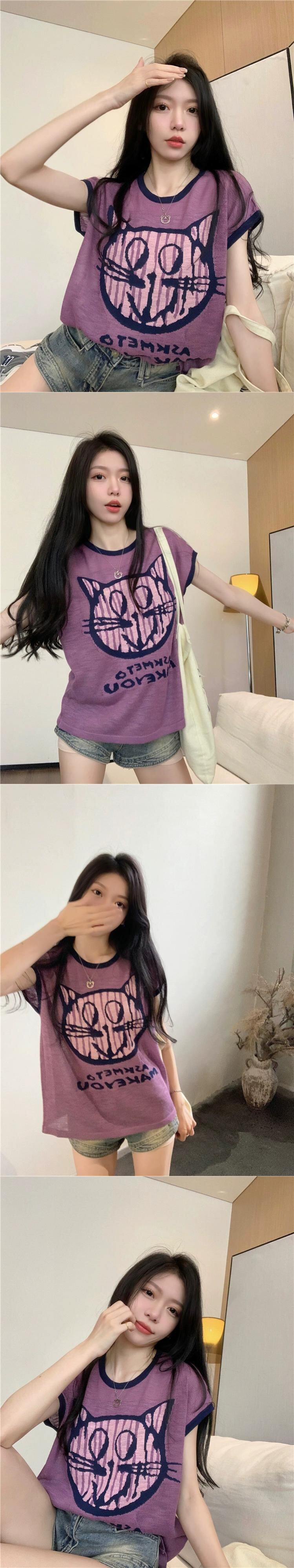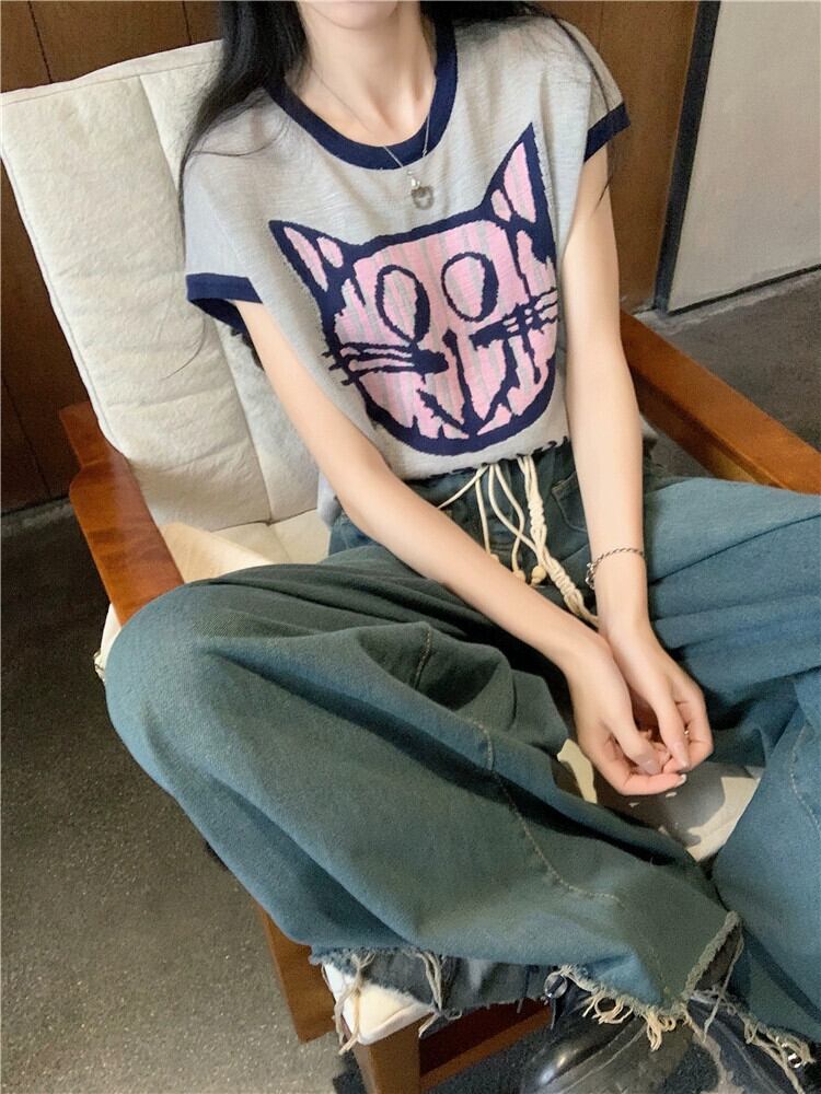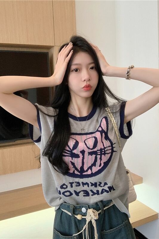 レトロアイスシルクニットセーター女性の夏 2023 新しい漫画猫プリントコントラストカラールーズノースリーブベストトップ サマー 夏物 missk11460922256