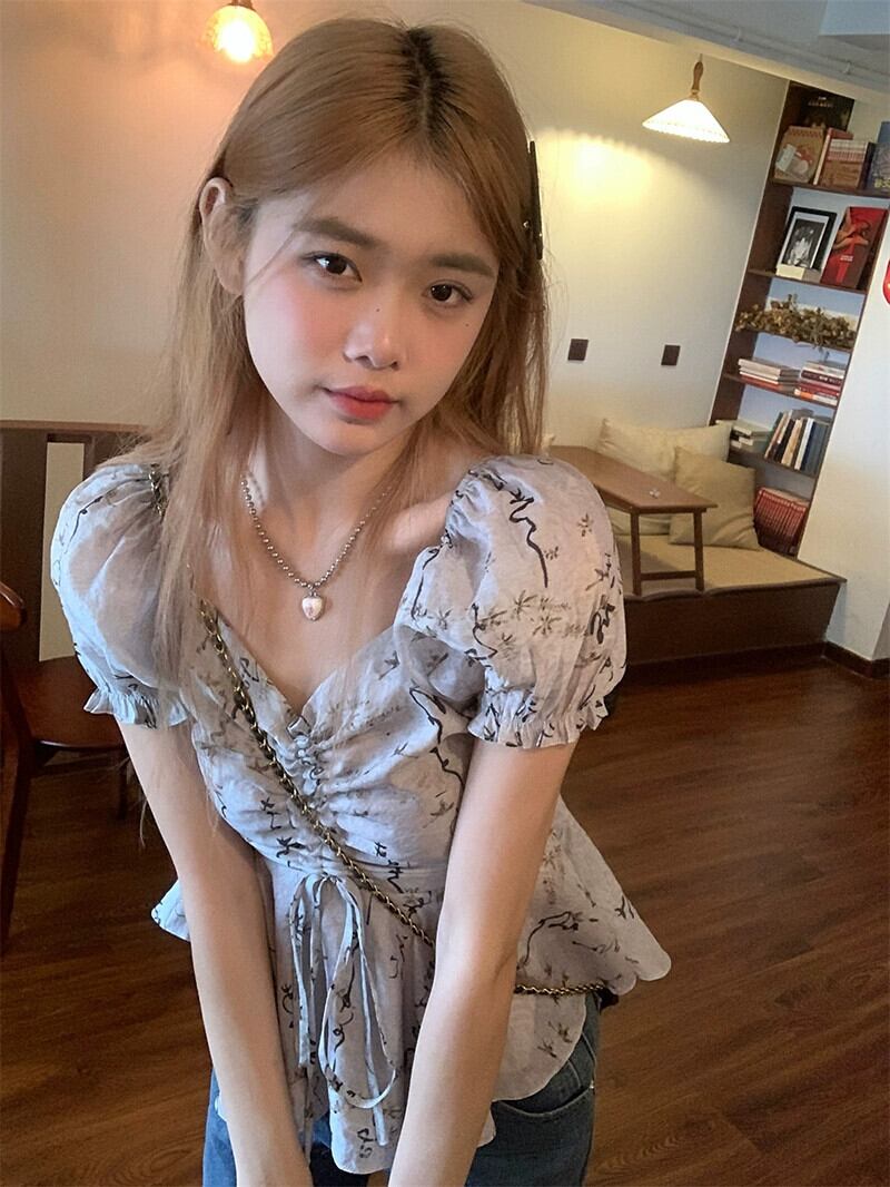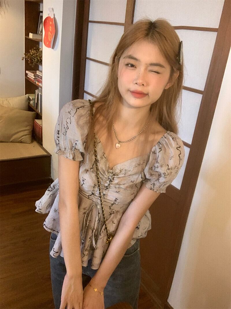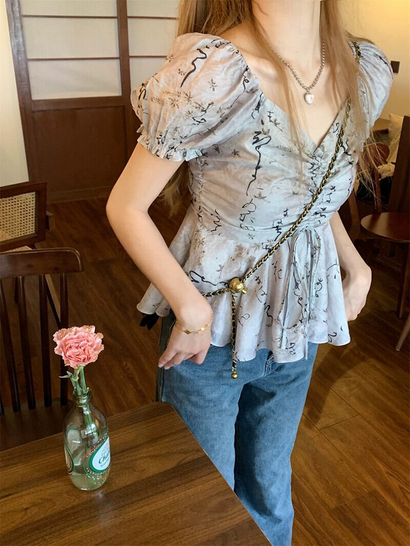 中国風パフスリーブシャツレディース2023年夏新デザインセンスVネックスリムスリムショート半袖トップ サマー 夏物 missk69837256114