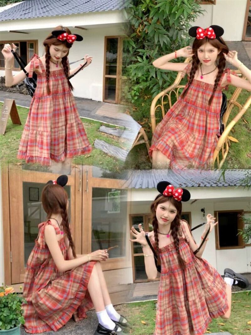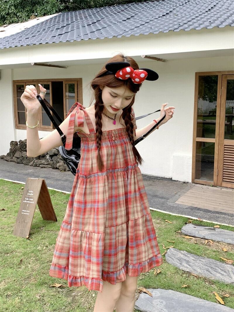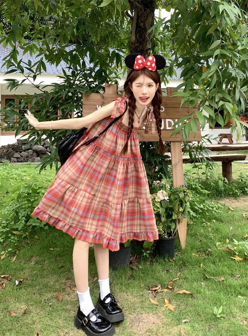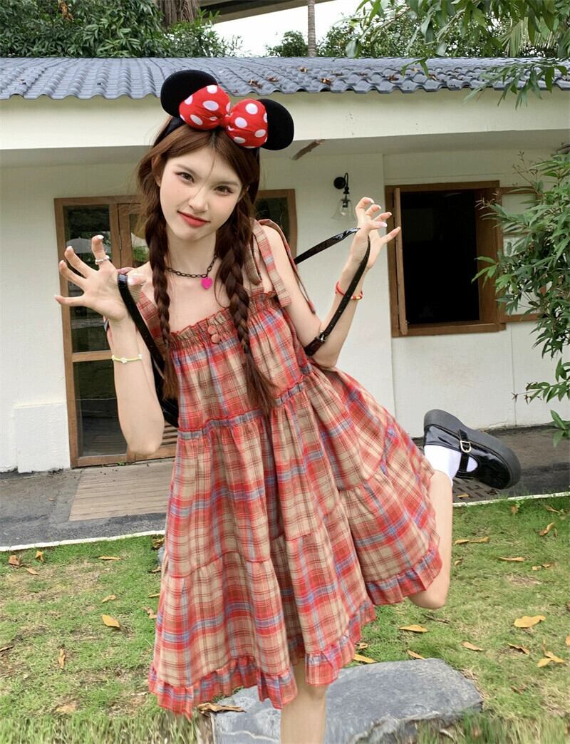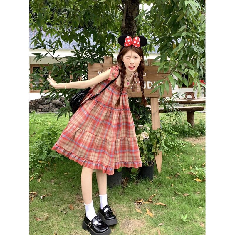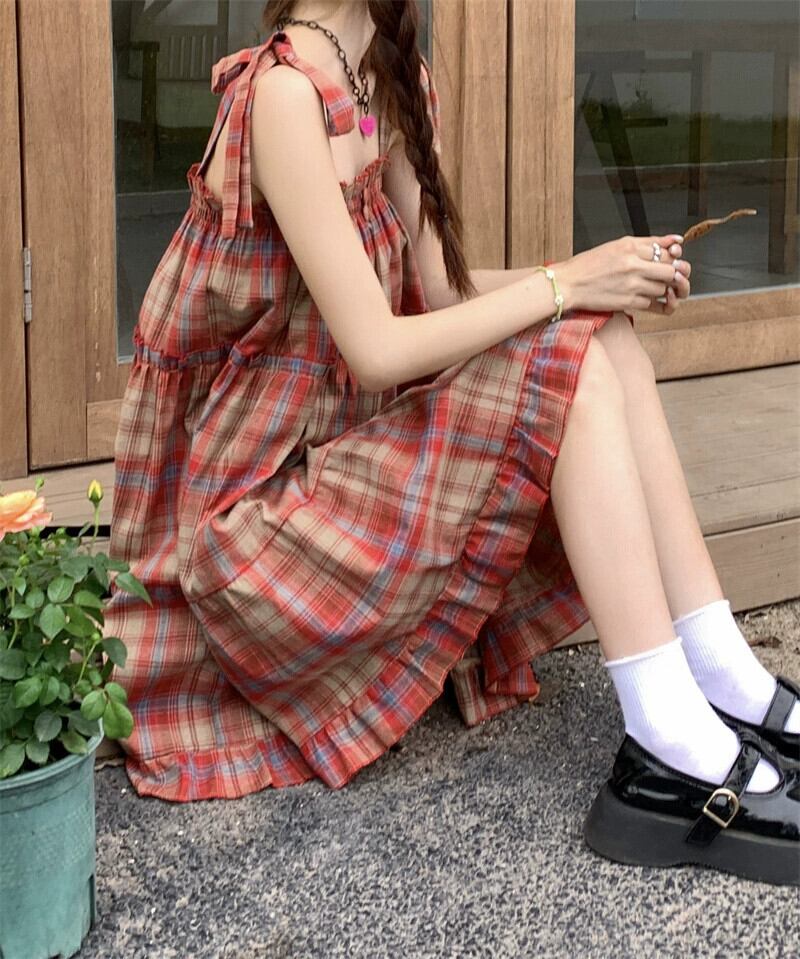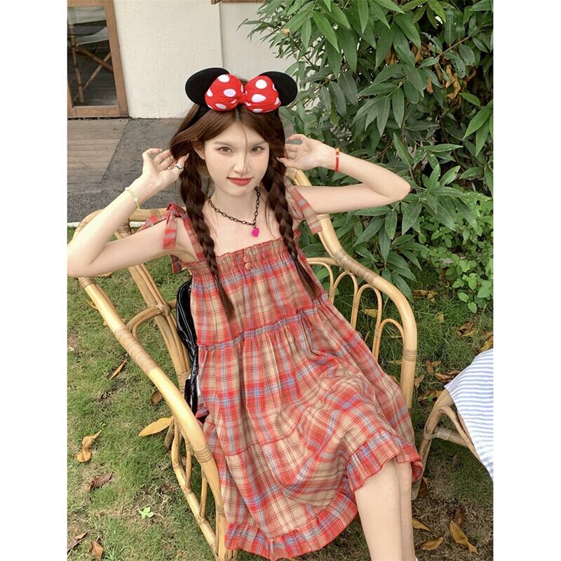 2023 夏の新しい eign スタイル年齢削減気質ルーズオールマッチシックなレースチェック柄スリングドレス女性 ins サマー 夏物 missk15778449441