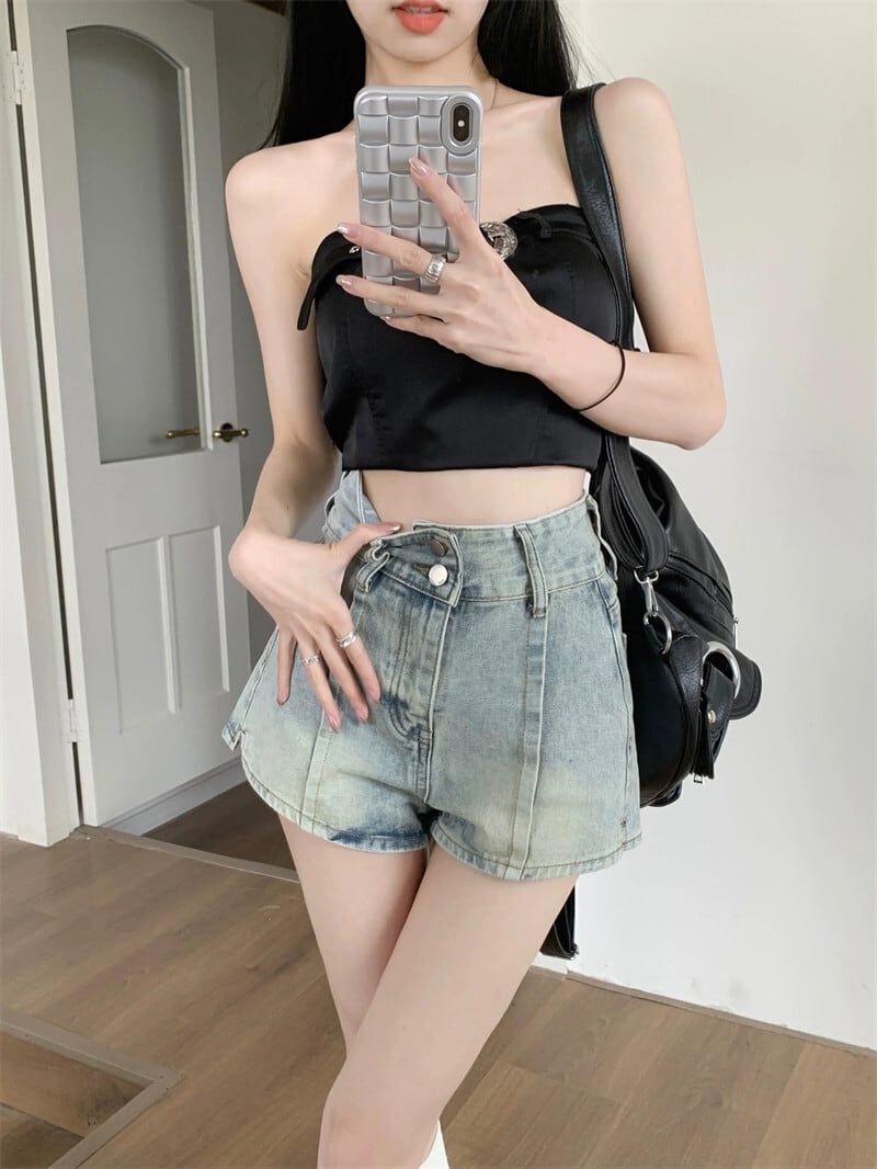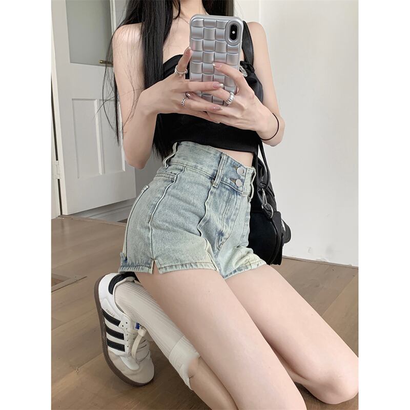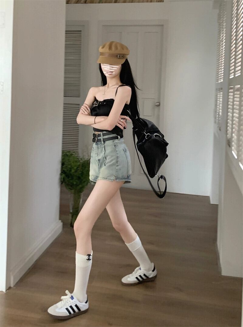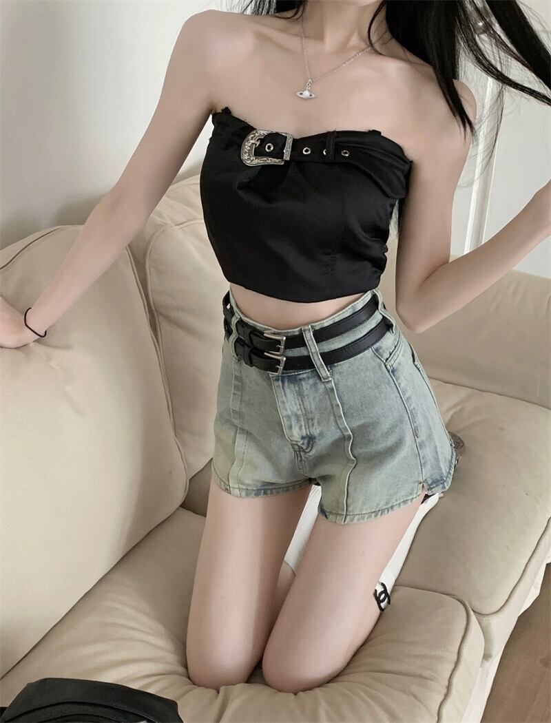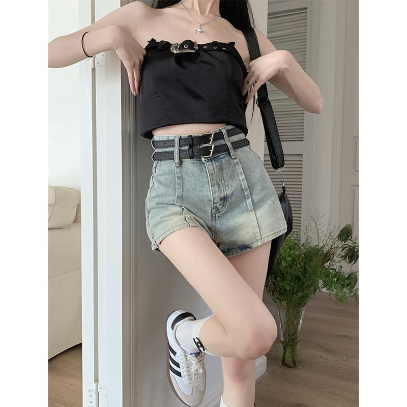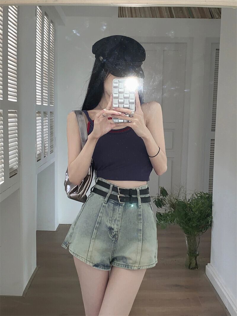 レトロダブルベルトデニムショートパンツレディース夏新作ハイウエストオールドウォッシュオールマッチニッチデザインセンスワイドレッグパンツ サマー 夏物 ハーネス ショーツ ブルマー missk6840214818