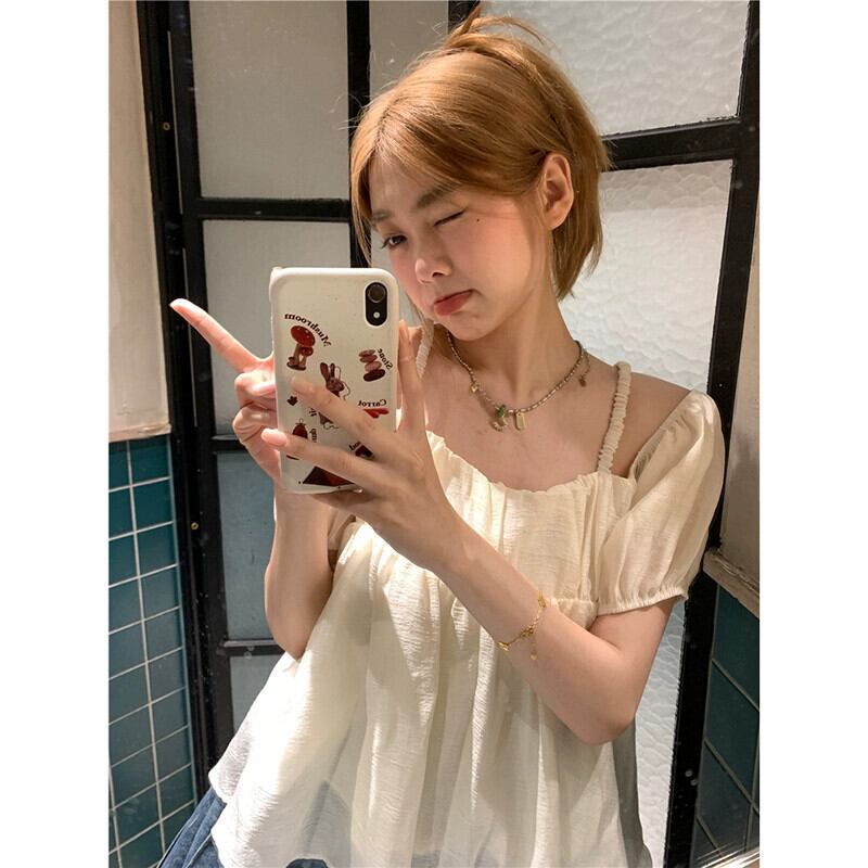 優しい風ワンショルダーバブル半袖シフォンシャツ女性の夏の新しいフレンチスタイルのシックなストラップレスの気質ルーズトップ サマー 夏物 missk20121467771