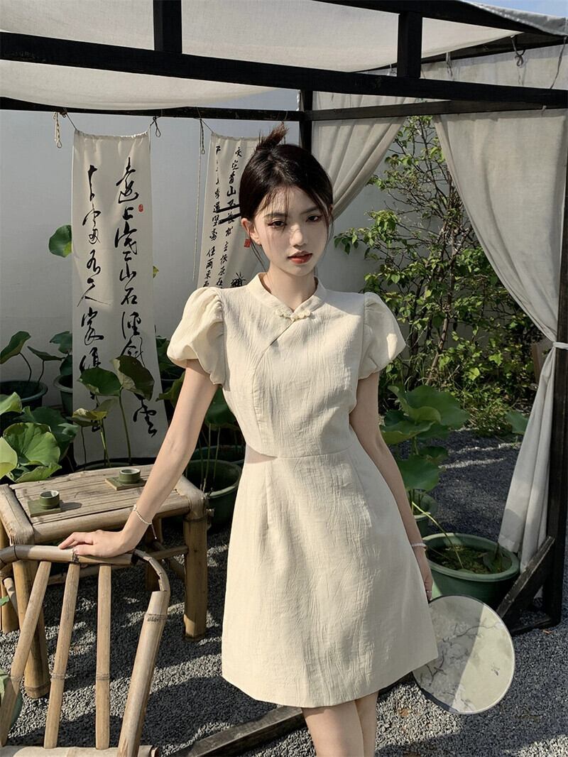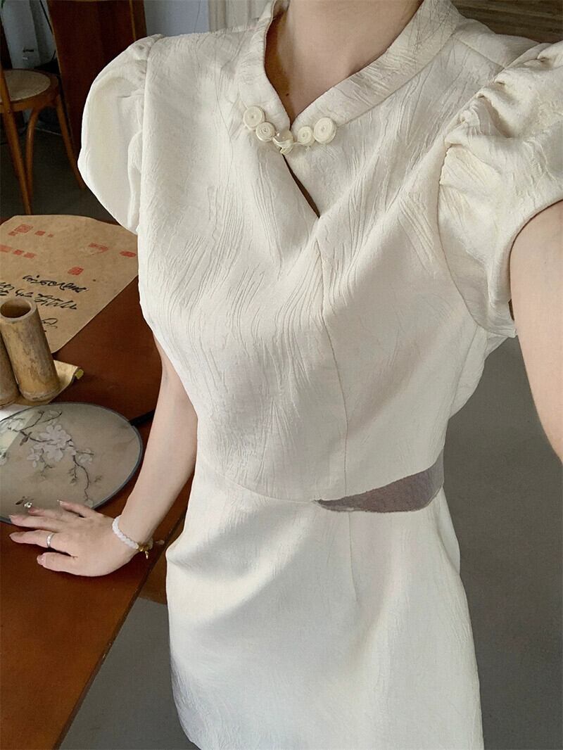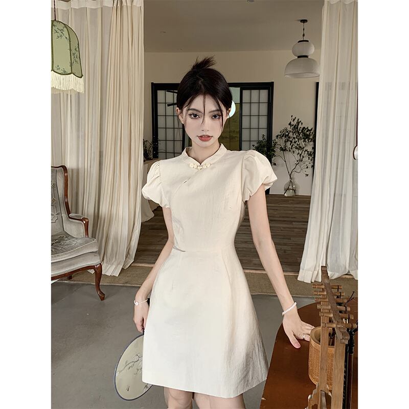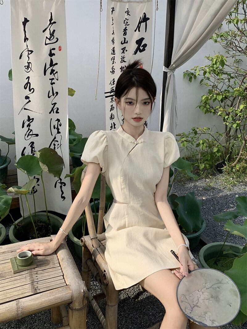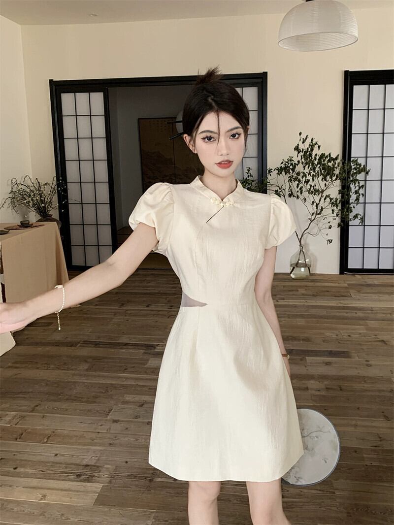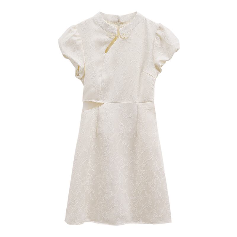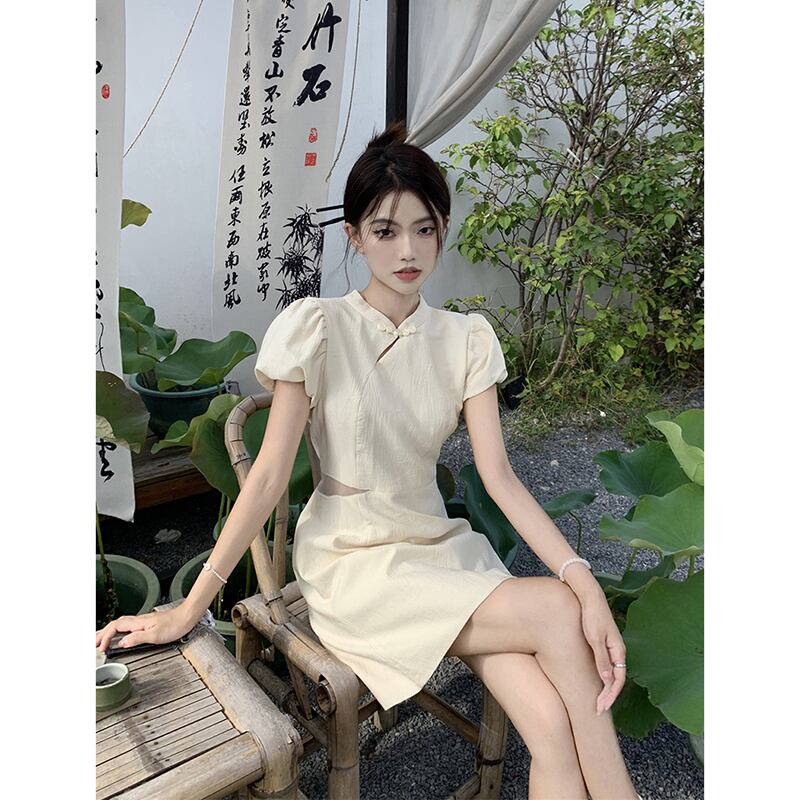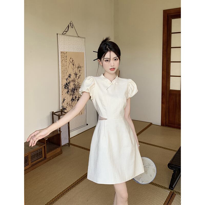 中国風の改良されたチャイナドレス女性の夏の 2023 新しいパフスリーブウエスト痩身中空半袖スカート サマー 夏物 missk17598268361