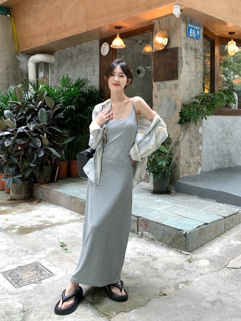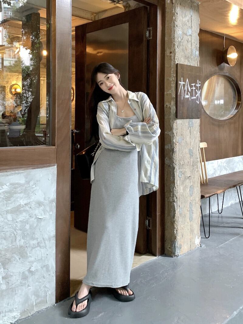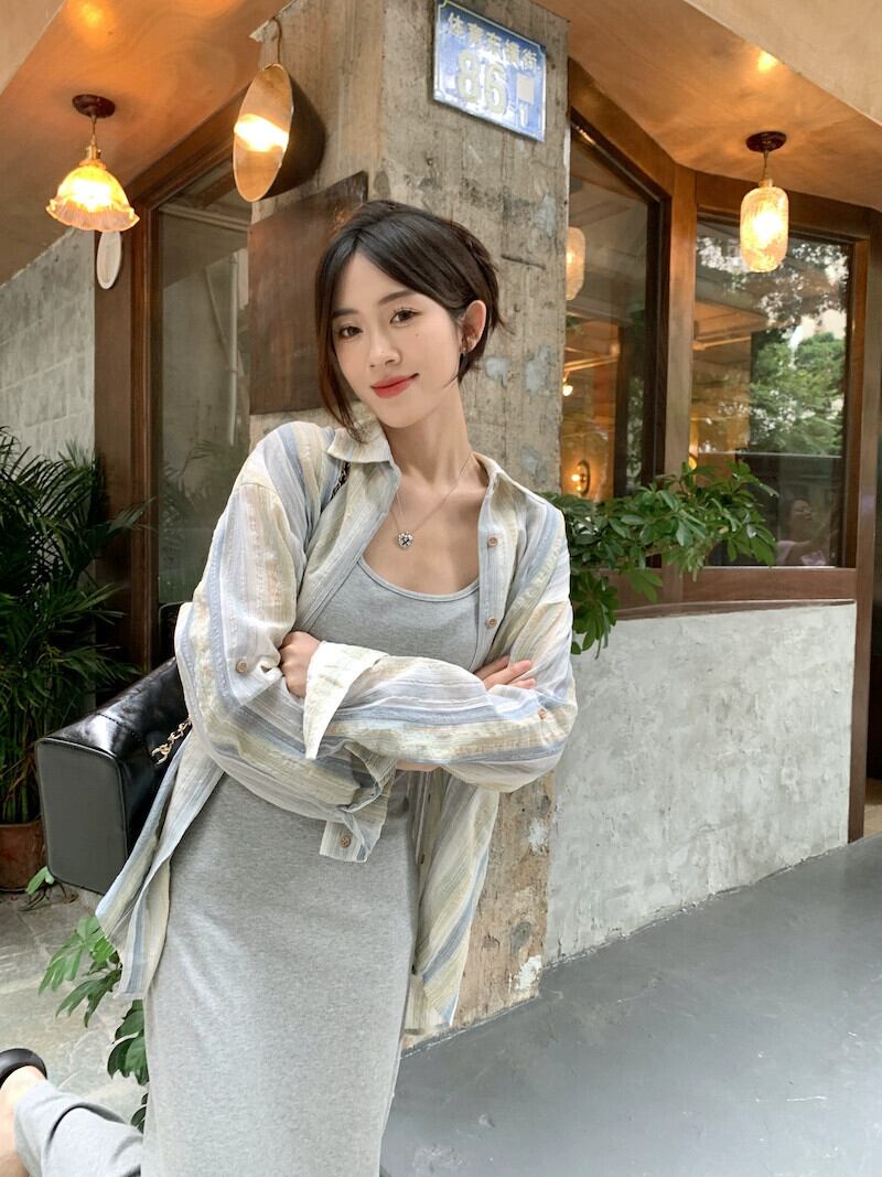 インブルーストライプライト日焼け止め長袖シャツウエストロングサスペンダードレス女性の夏のファッションスーツ サマー 夏物 missk97130265412