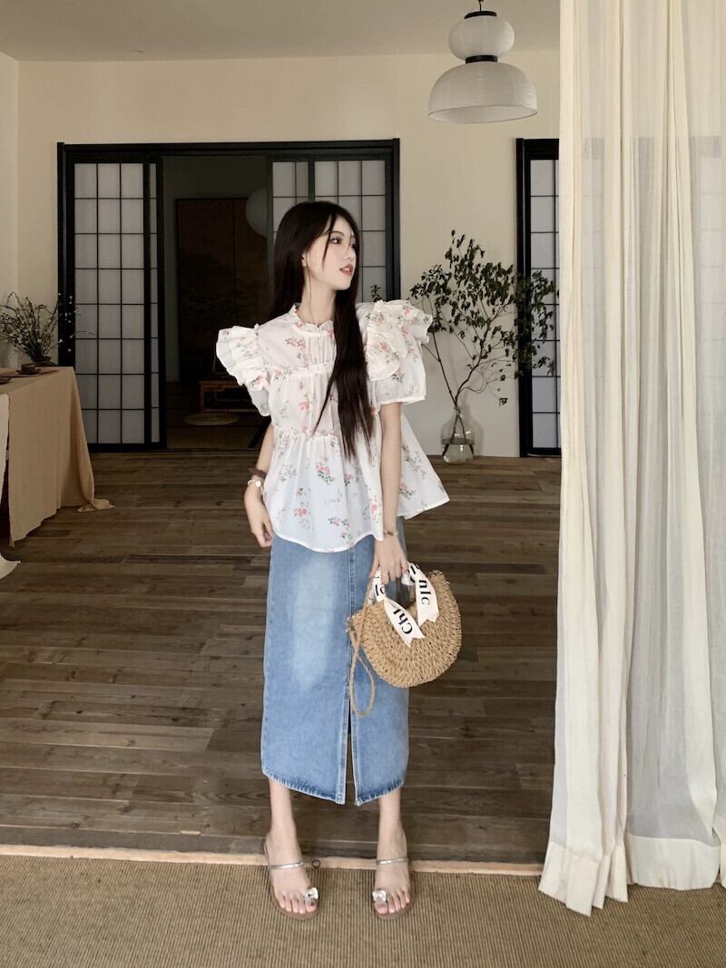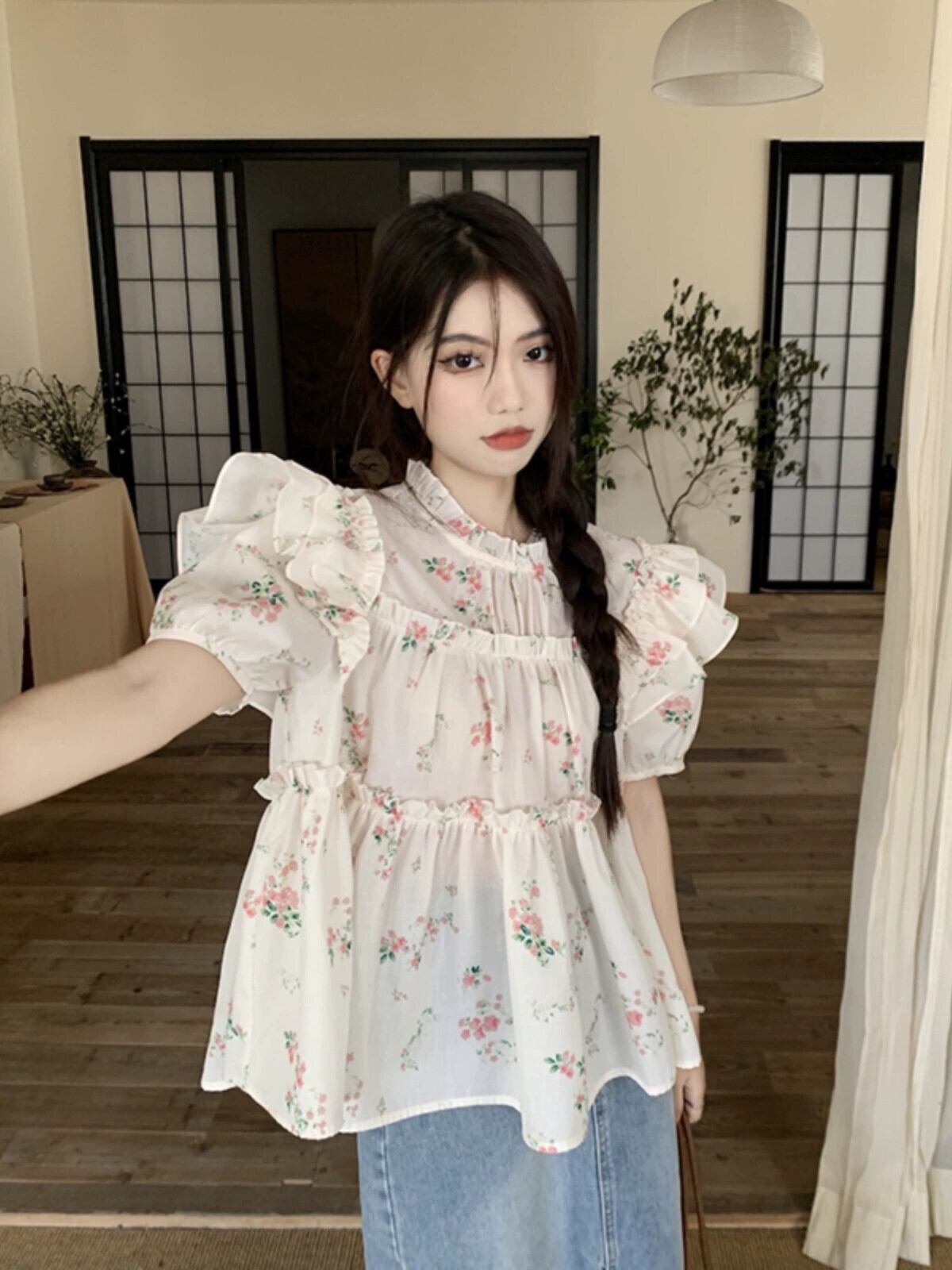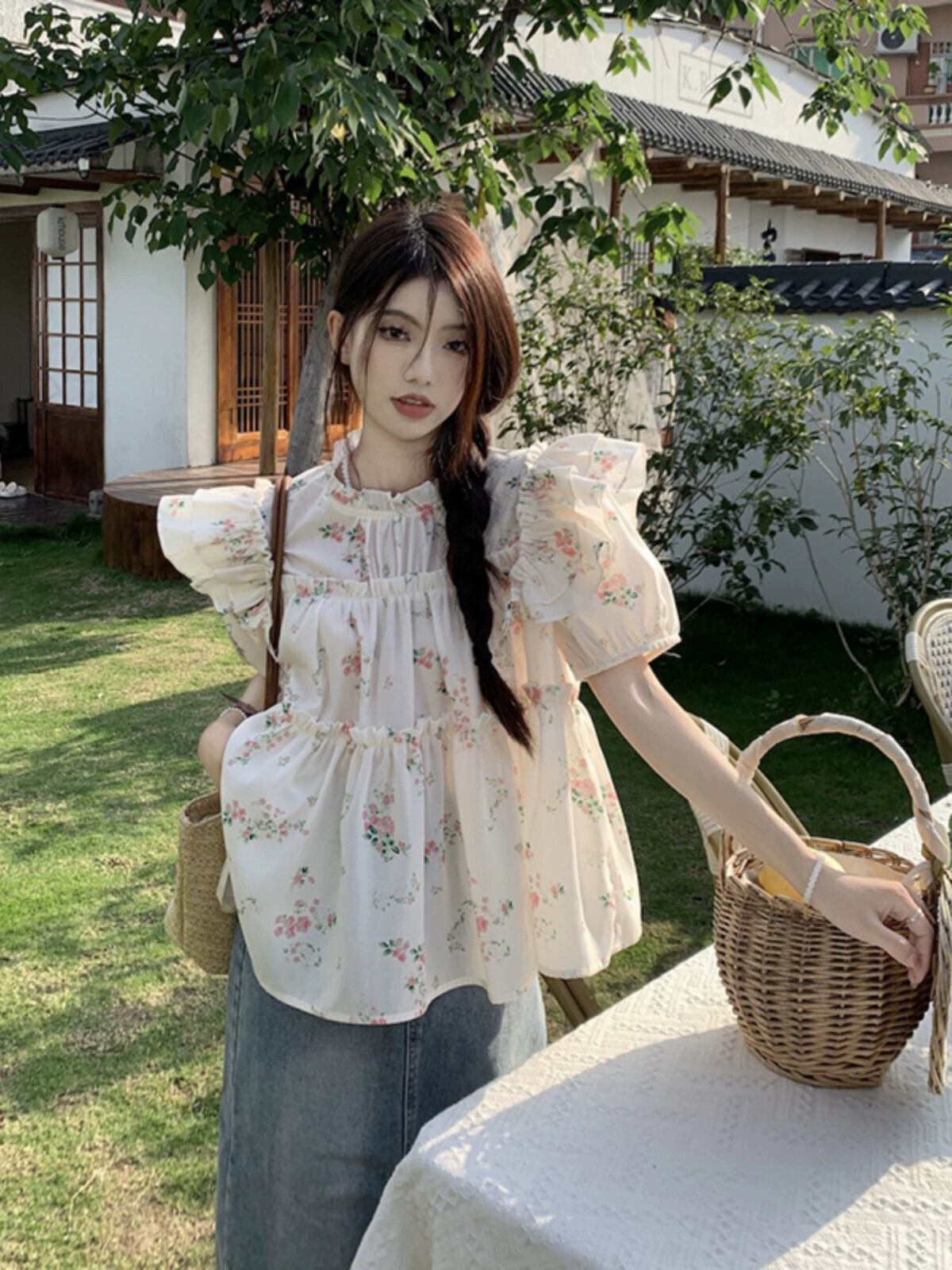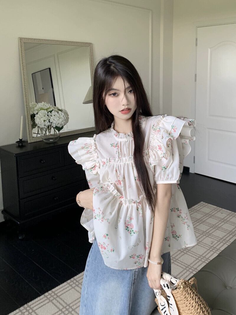 木耳ステッチパフスリーブシャツレディース2023年夏新作花柄センススイートエスト半袖トップ 大人ガーリー スウィート キュート カジュアル サマー 夏物 missk21367422554
