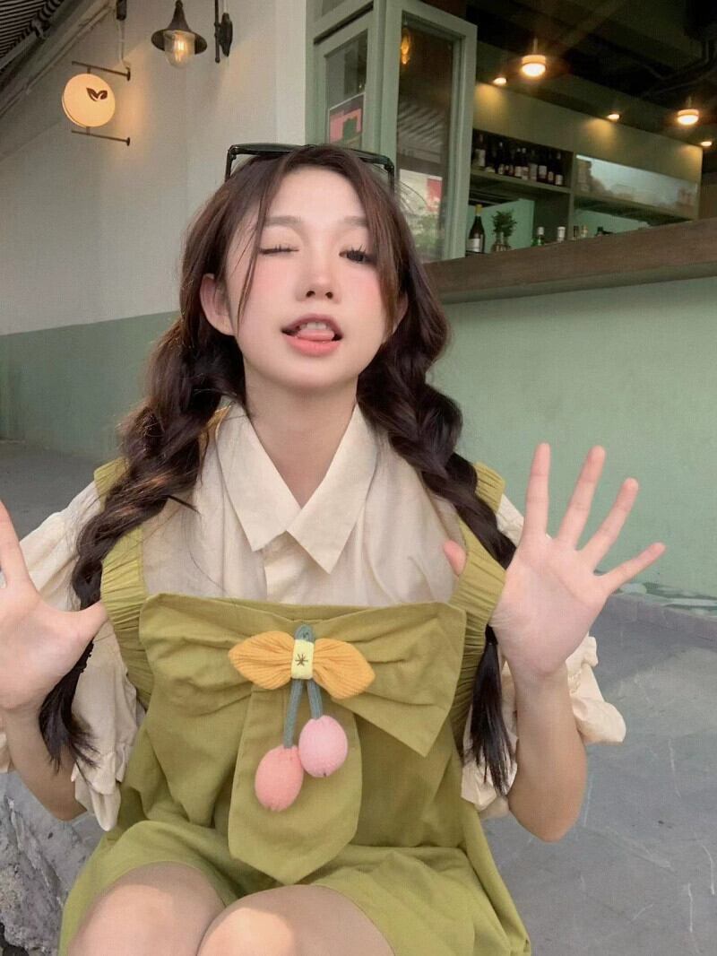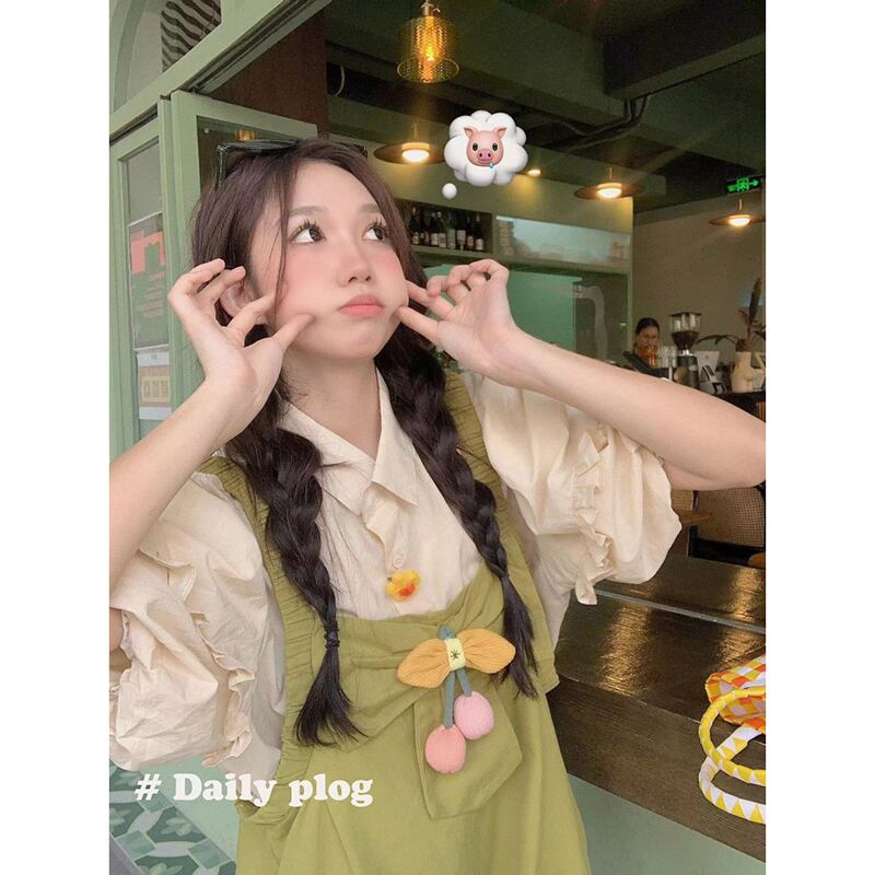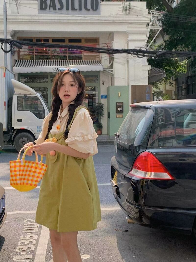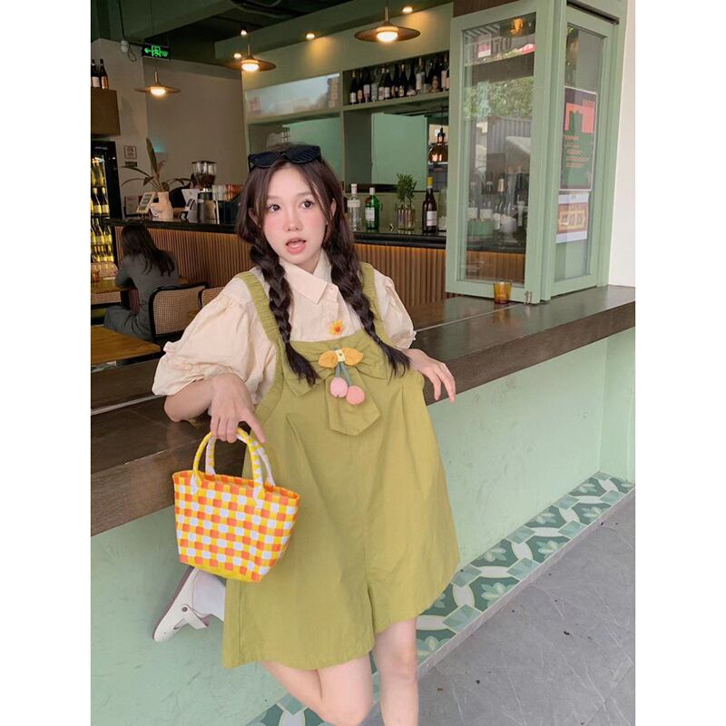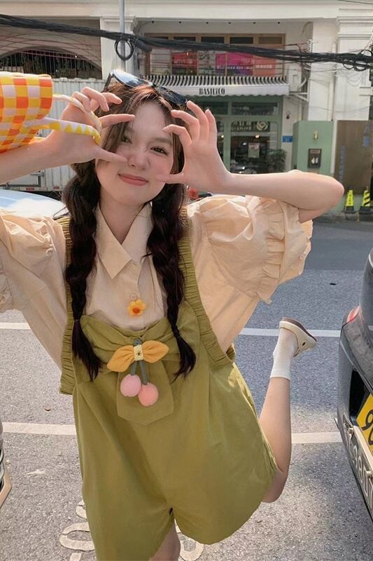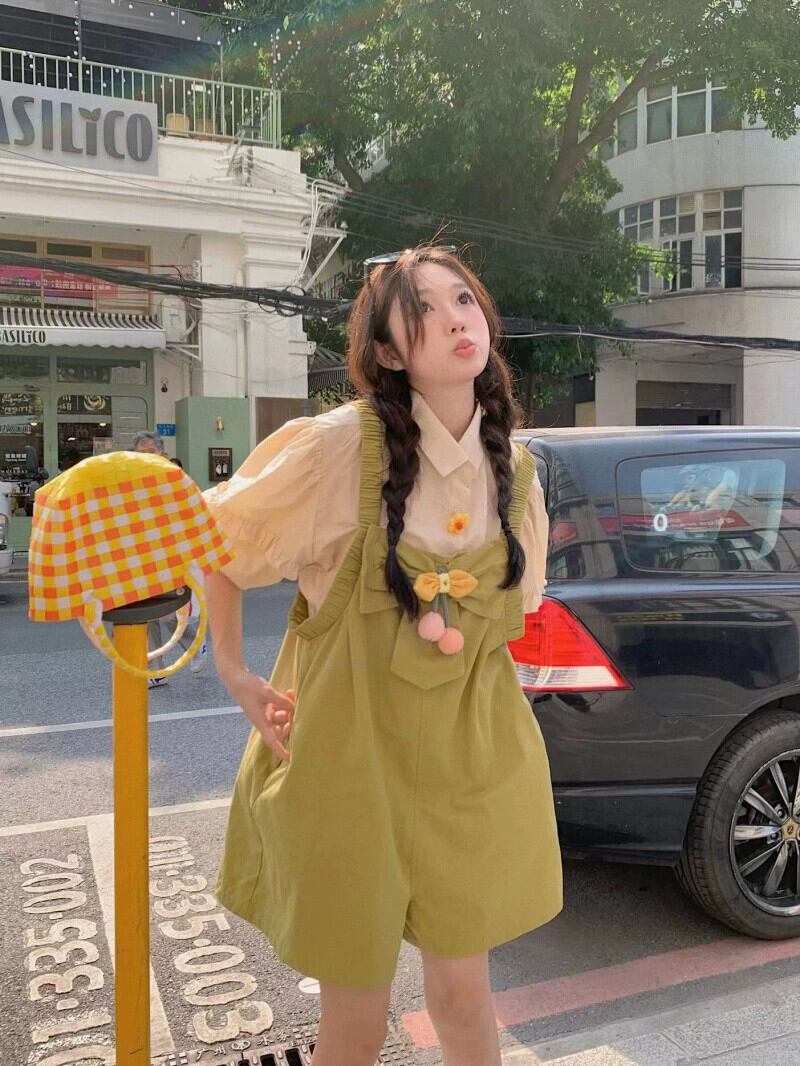 色:アプリコットシャツ,フルーツグリーンのオーバーオール