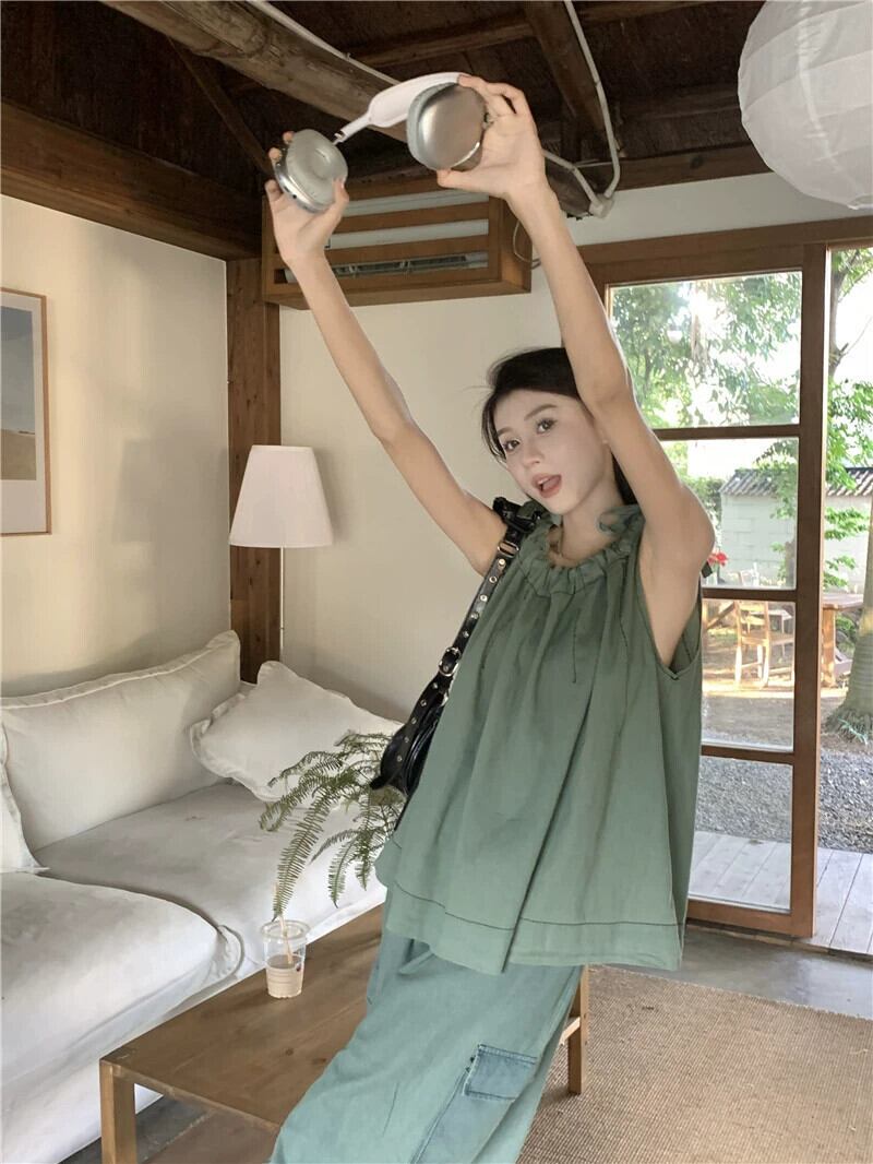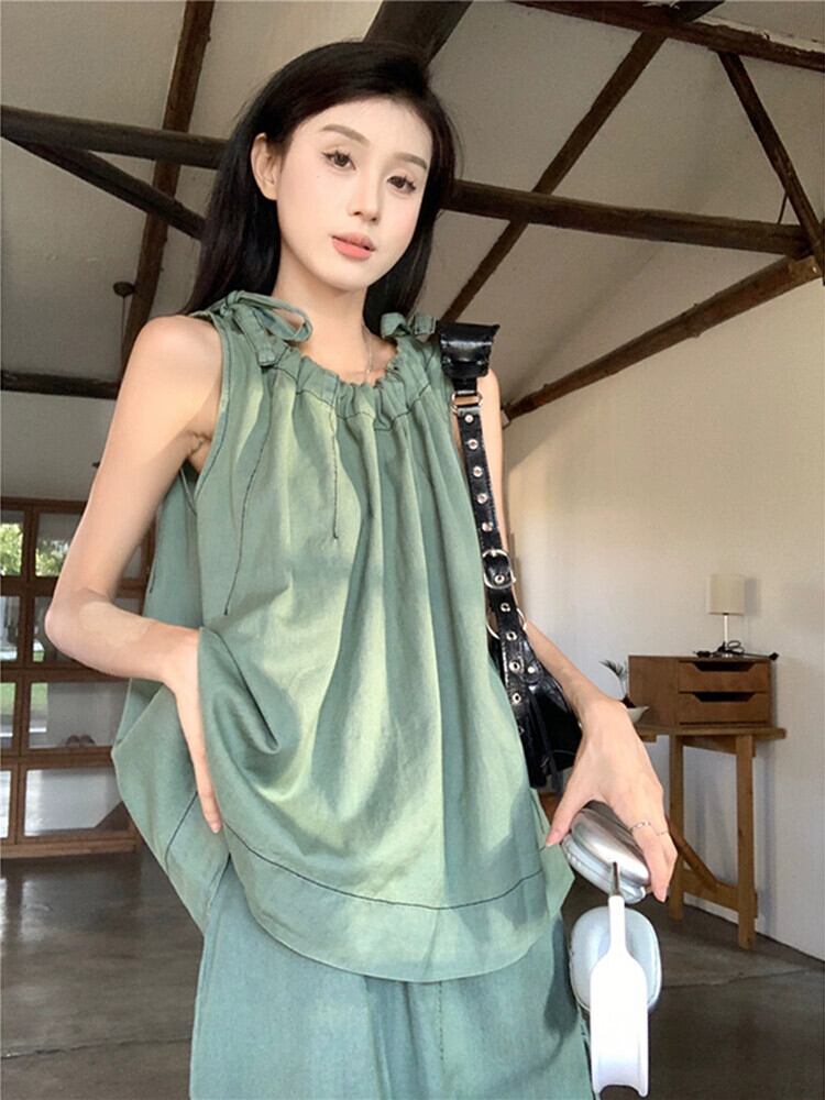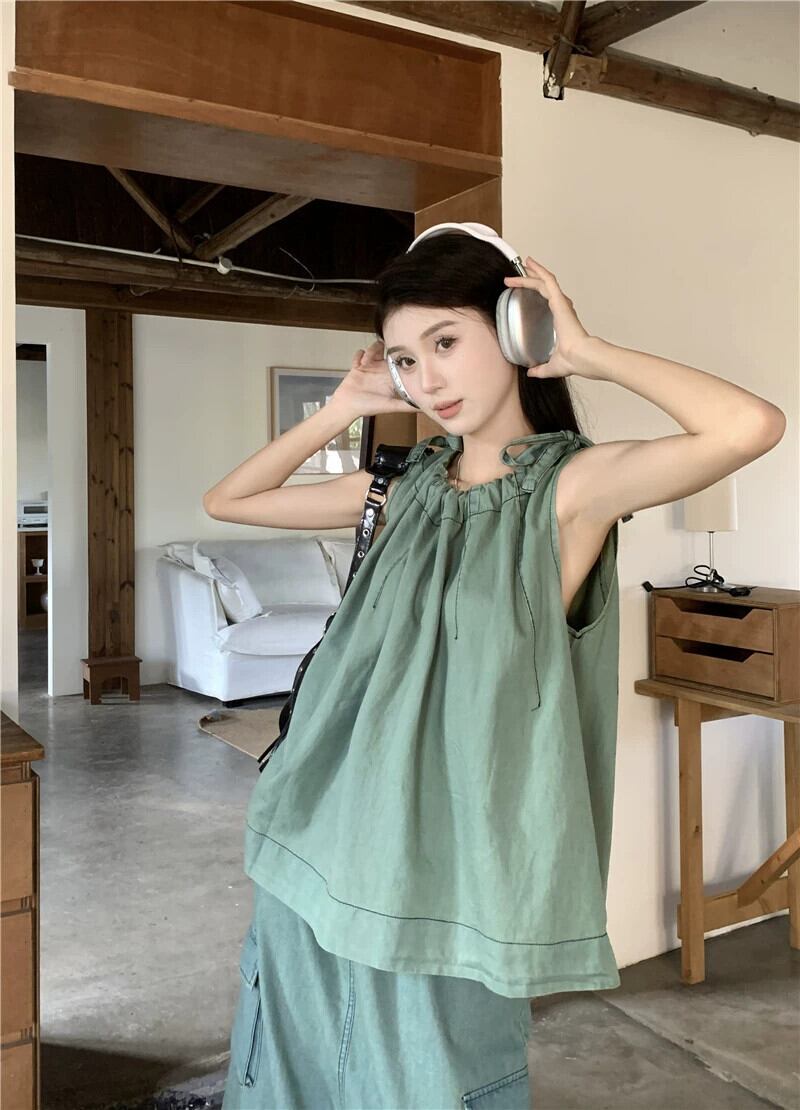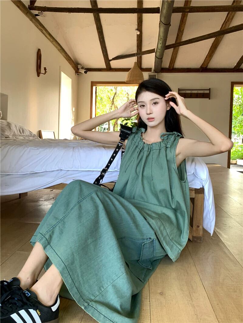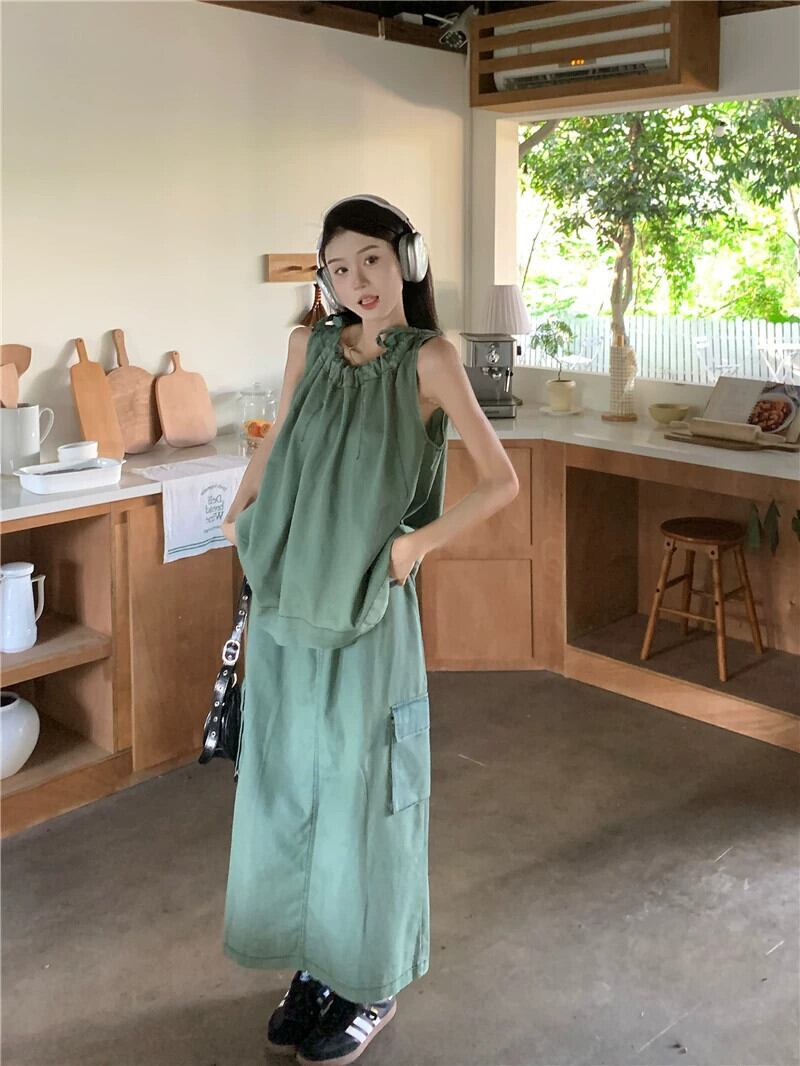 巾着レースノースリーブデニムキャミソールウエストストレート作業服スカート夏のデニムスーツ サマー 夏物 missk9548070528