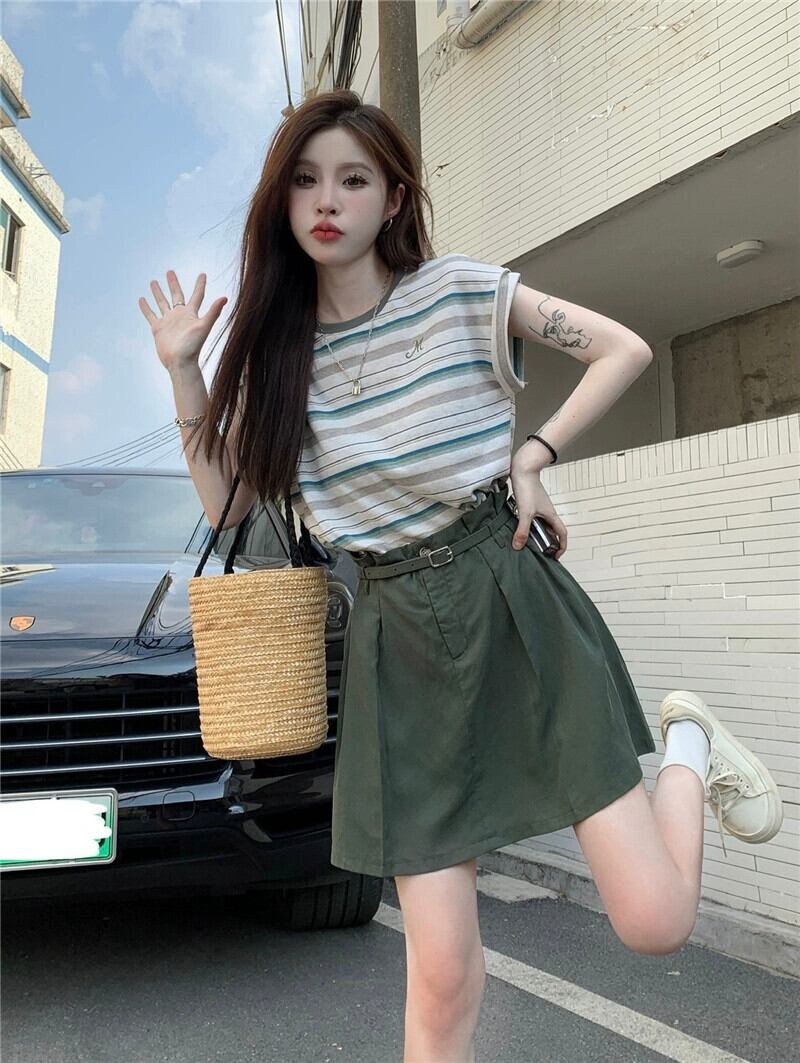 バージョンのカラーコントラストストライプ半袖 Tシャツトップハイウエストツーリング A ラインスカート女性の夏の 2023 新しい 2 点セット ハイウェスト サマー 夏物 Aライン missk67691462878