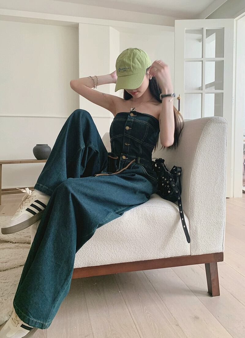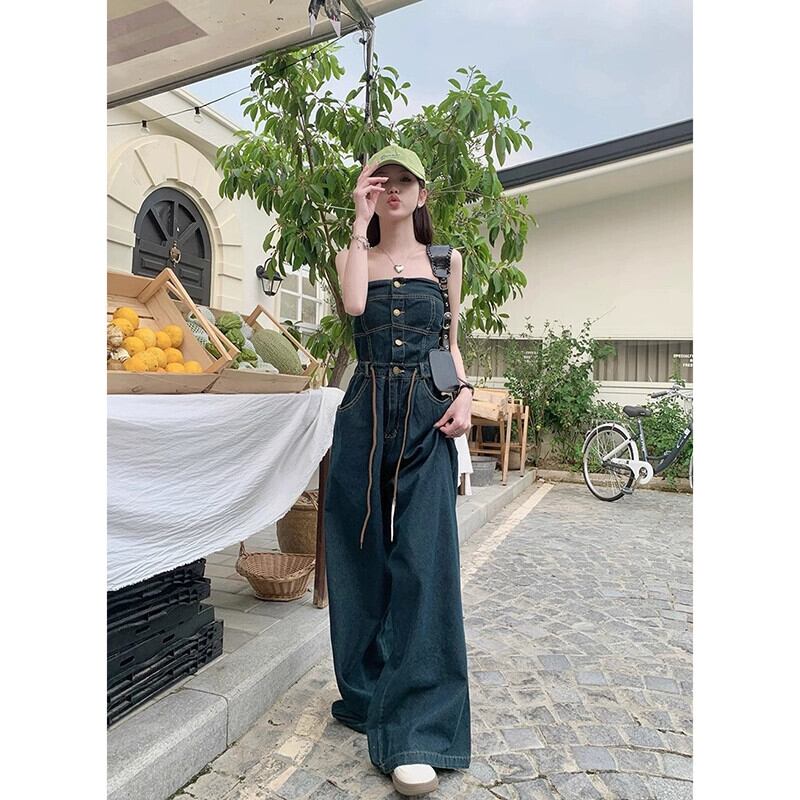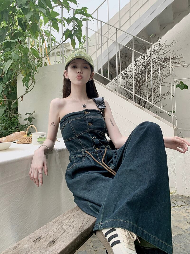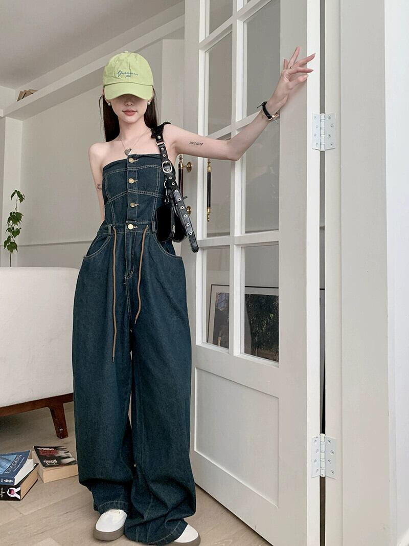 レトロチューブトップカジュアルワイドレッグジーンズ女性の夏の2023新しいデザインセンスハイウエストスリムジャンプスーツズボン潮 ハイウェスト サマー 夏物 missk95437394386