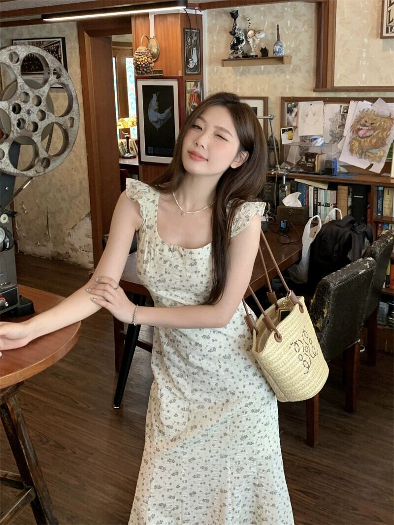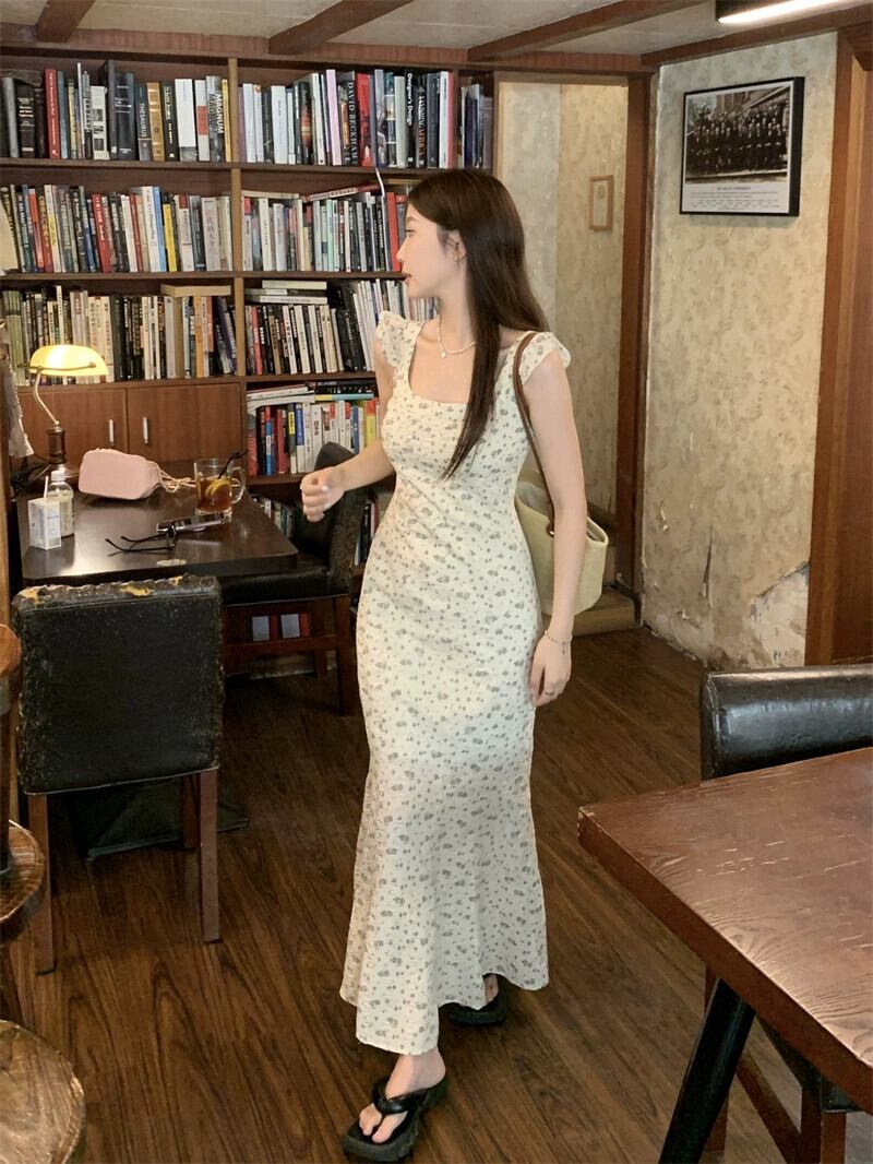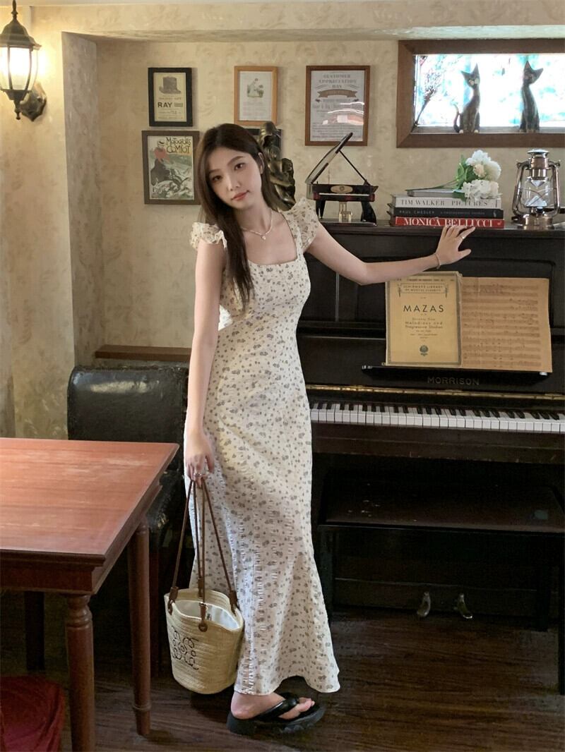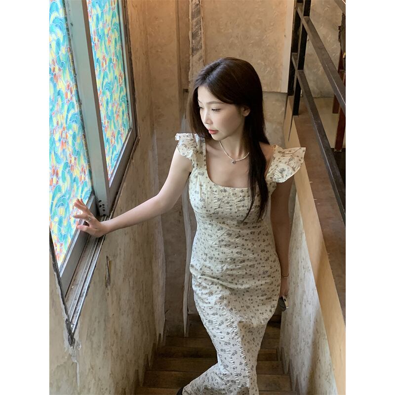 夏 2023 フレンチスリムスリムスリムフライングスリーブスクエアネックバッグヒップスリングドレス女性の サマー 夏物 スクウェア missk75382424317